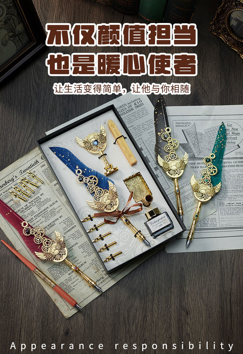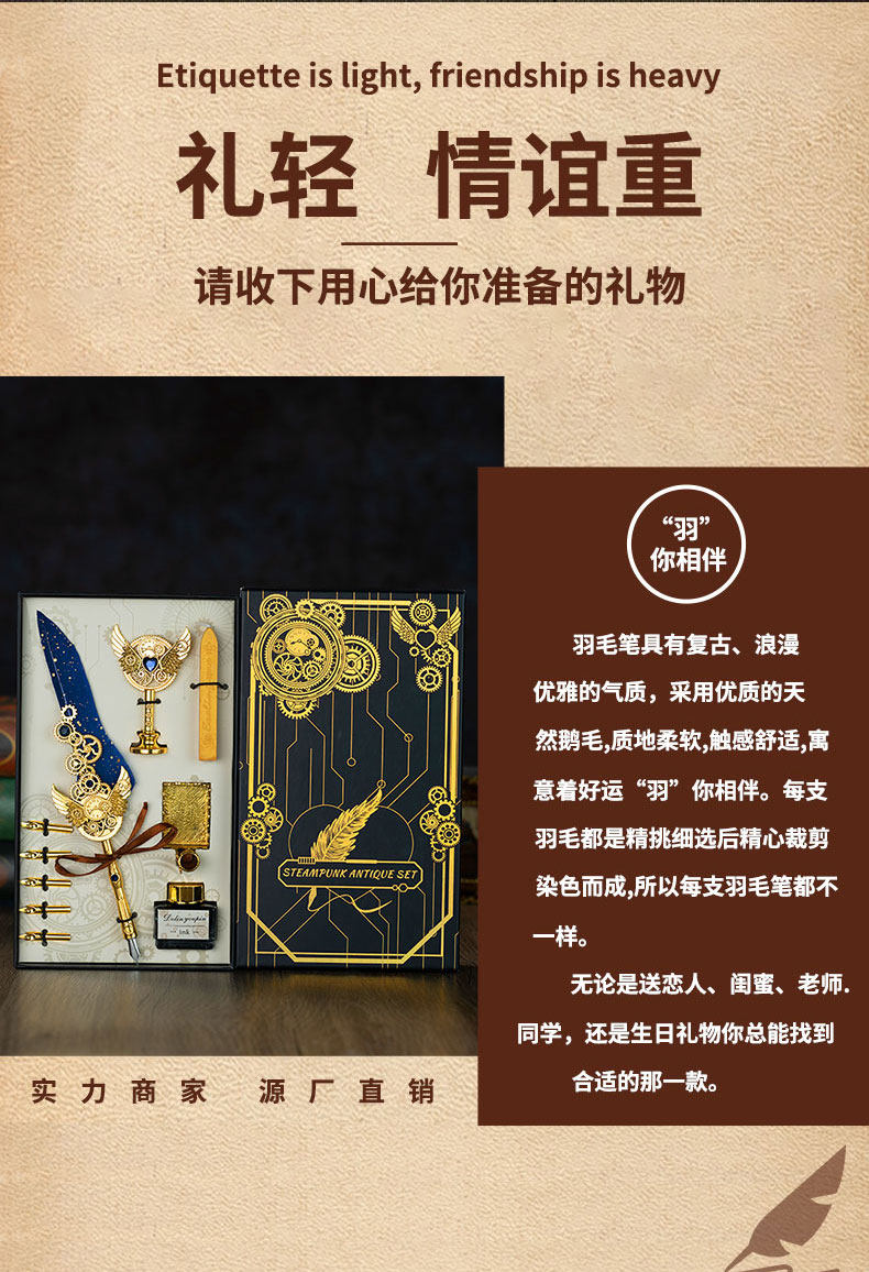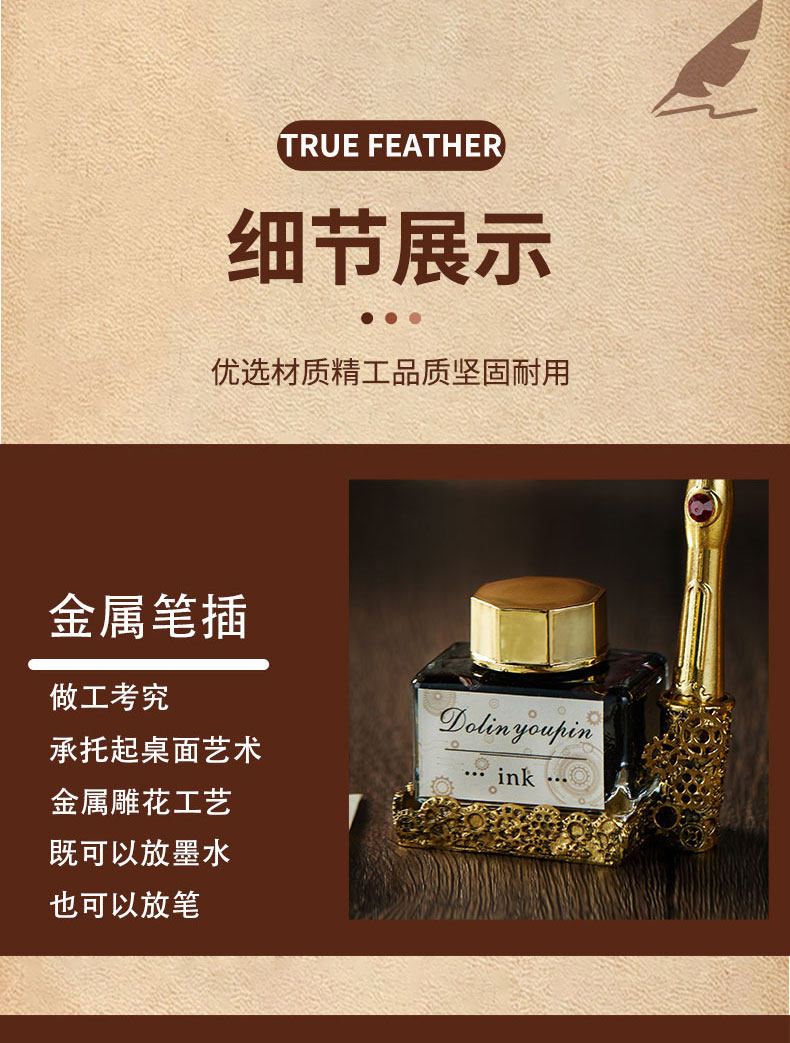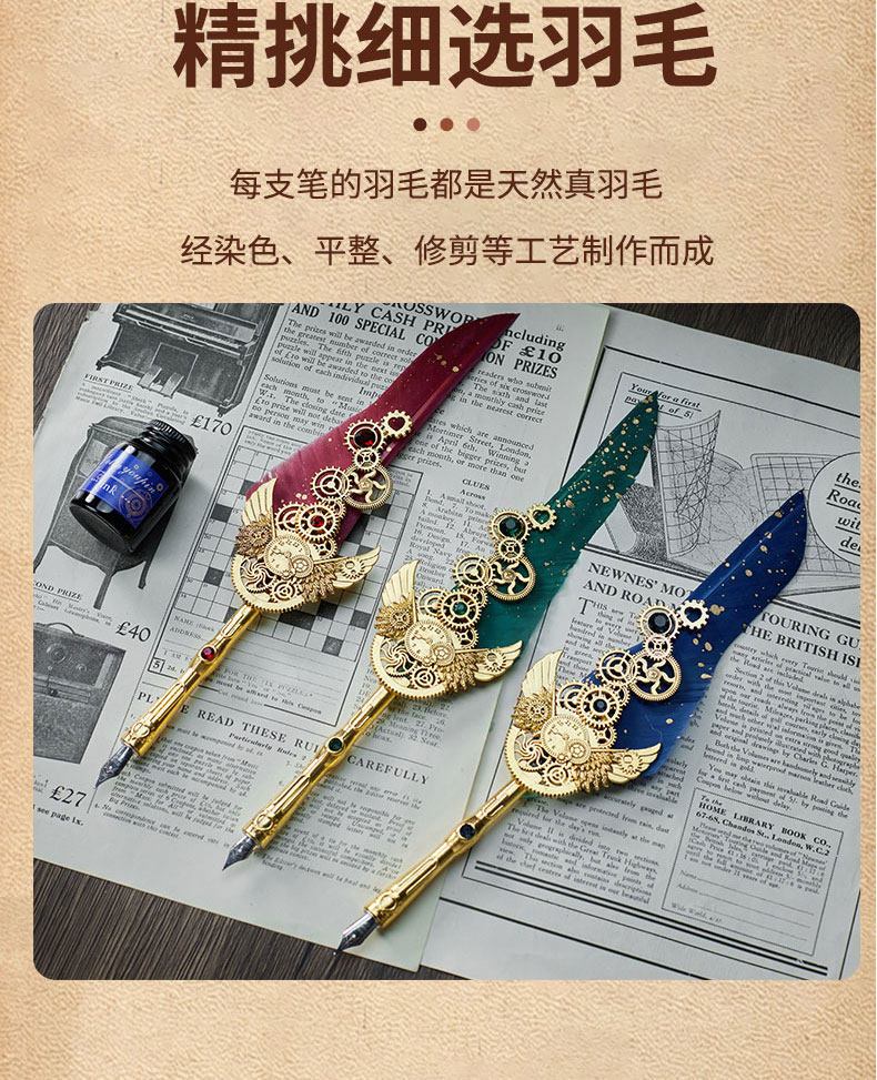 多伶文化制笔厂创始于:1998年,在国际商贸城三区市场设有实体店,可开增值税发票,专票, 专业生产:欧式复古羽毛笔,创意文具礼品套装..... 款式齐全,价格优势,专业供货:外贸公司,国外跨境,国内外商超实体店,常年500多款现货 实力供应!所有产品可根据客户需求定制生产,可定制不同的:图案,文字,logo 品牌 外包装 实力老工厂 , 爆款上新快, 质量有保证,量大价优,原创专利设计, 批发客户请与老板娘联系报价. 联系手机号微信同号:13616794052,真诚期待与您的合作!
