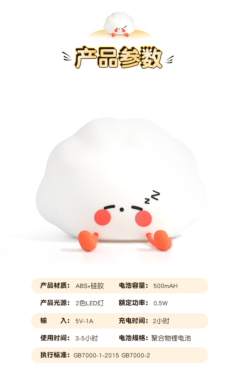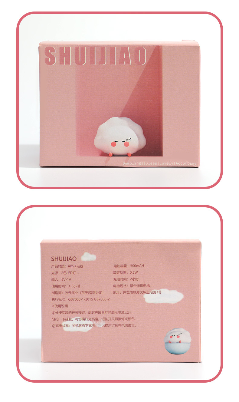 是否有专利: 否 认证: 无 附加功能: 摆件,夜灯,氛围灯 品牌: 牧云实业 货号: 饺子小夜灯 电压: ≤36V(V) 灯罩材质: 硅胶 外形尺寸: 140*72*97mm(mm) 开关类型: 按钮式 风格: 卡通 重量: 0.3 kg/件