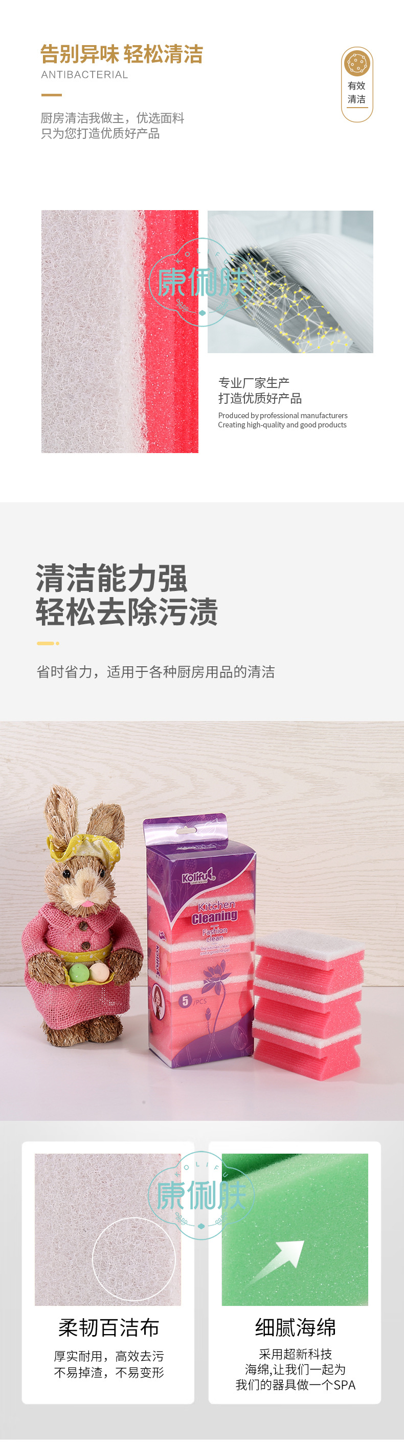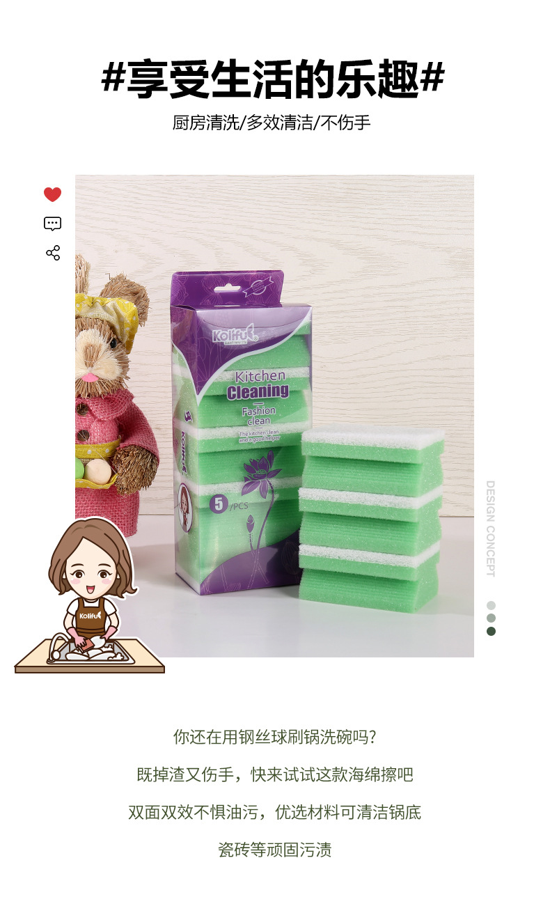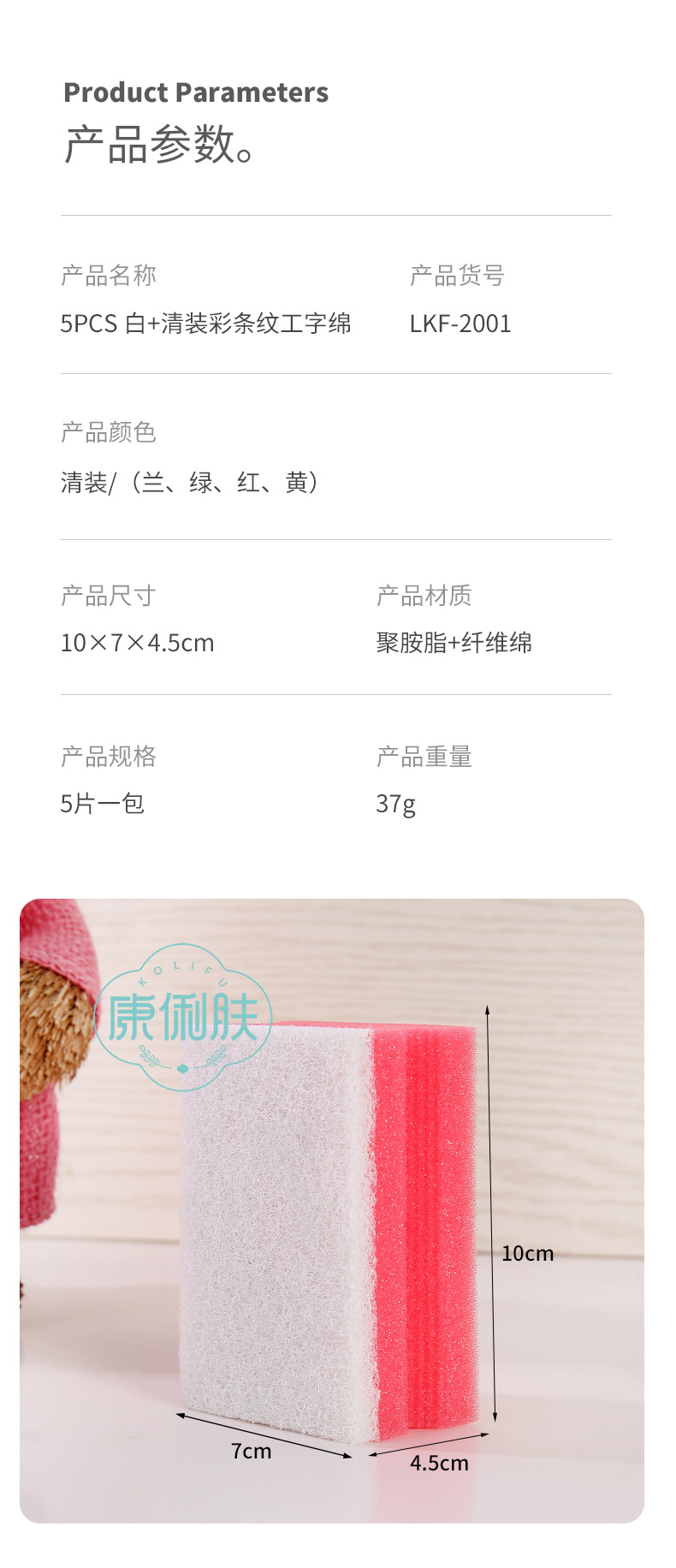 品牌: 康俐肤 材质: 聚胺脂+纤维绵 是否进口: 否 适用对象: 锅/碗 贸易属性: 内贸+外贸 重量: 37g 箱装数量: 120 产地: 义乌 产品上市时间: 2023 货号: LKF-2001 重量: 1.0 kg/套