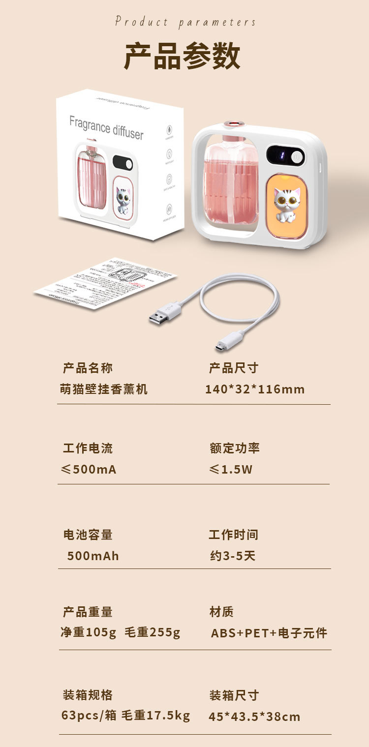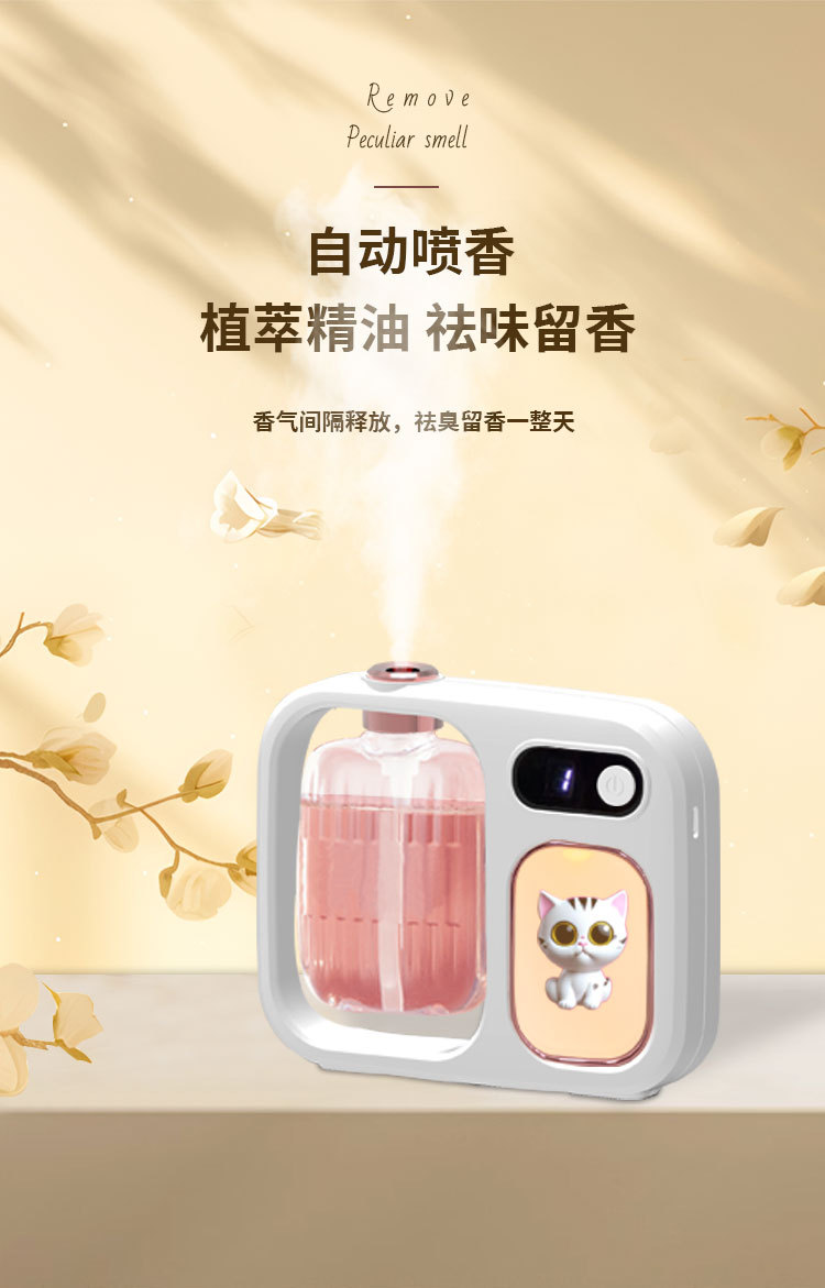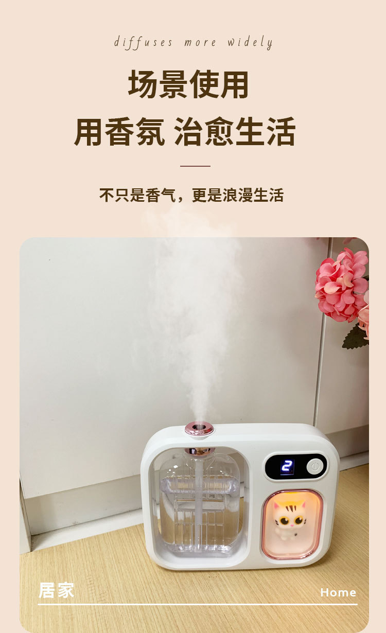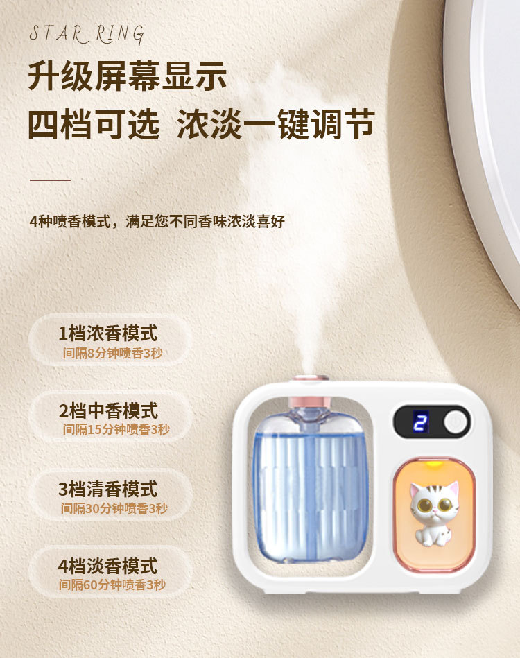 使用说明:短按开关键1秒开机,开机后默认为1档-浓香模式:显示屏显示数字1,显示屏3秒关闭显示,喷雾3秒,同时小夜灯亮3秒,此模式每间隔8分钟喷雾一次。