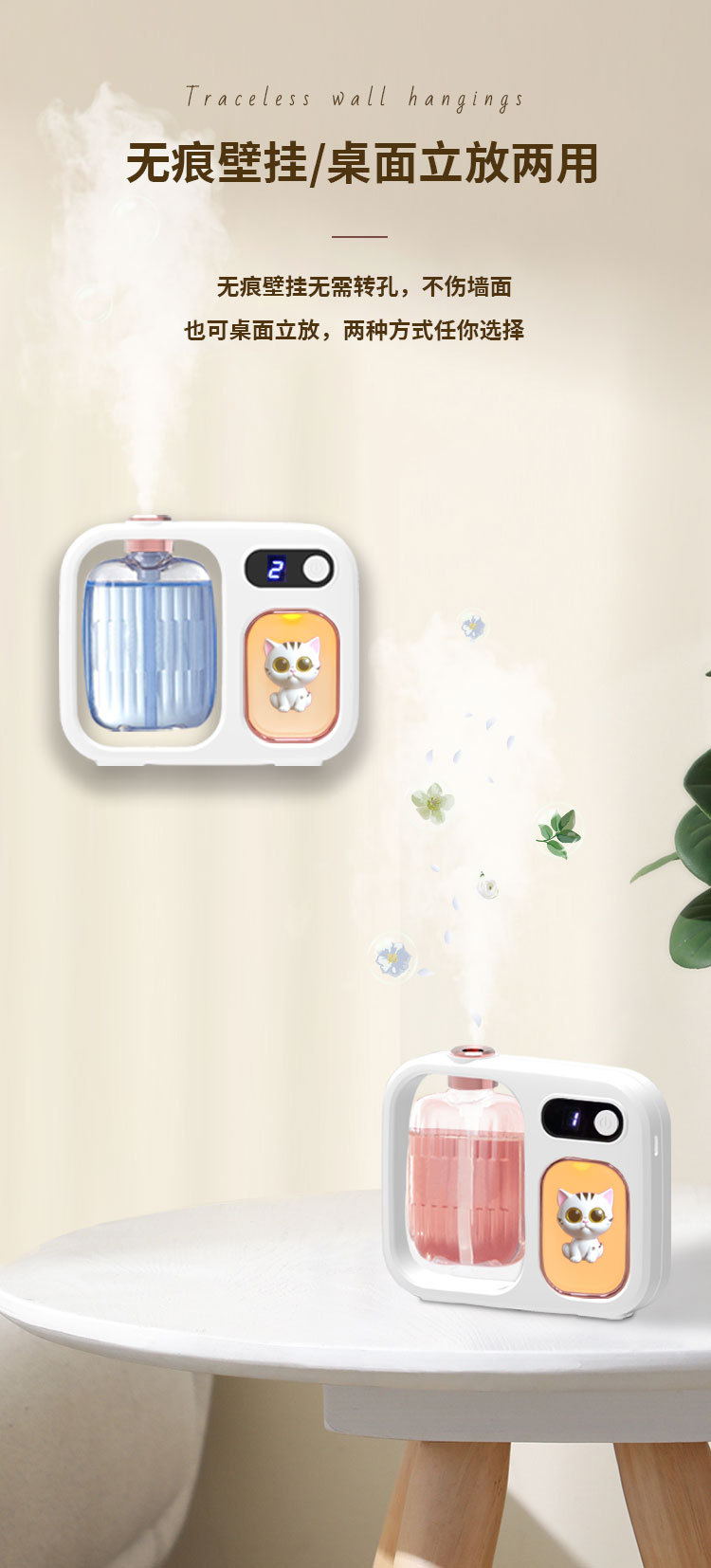 短按第二次默认2档-清香模式显示数字2:显示屏3秒关闭显示,喷雾3秒,同时小夜灯亮3秒,此模式每间隔15分钟喷雾一次,