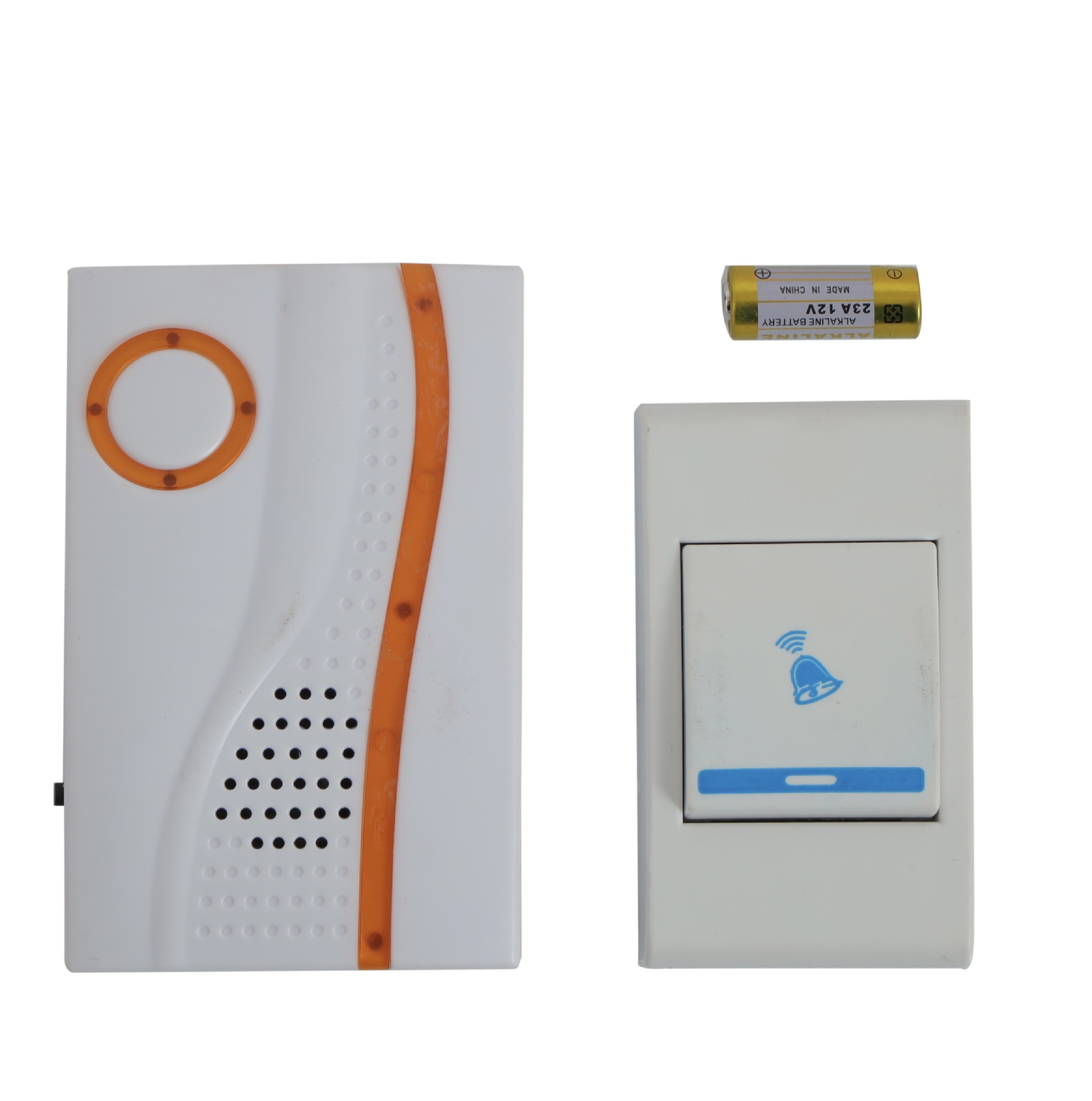 产品所包含:发射器(安装在门外的按键),接收器(室内门铃),12V23A小电池(安装在发射器上),双面胶(赠送)