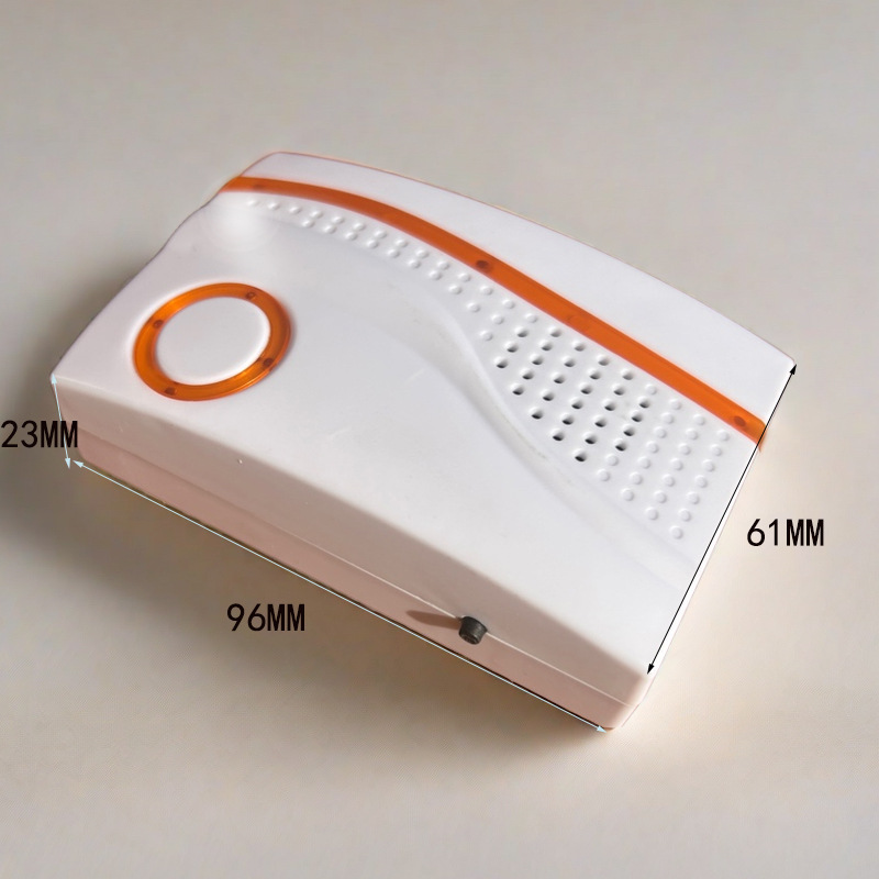 模拟无线门铃:距离100米左右,发射器带一颗12 V 23安的遥控电池,可以使用半年左右,接收器有直流两颗7号电池,或者交流电(110一270 V) 宽电压欧规两种类型,频段315的。36首歌曲,A B S塑料。