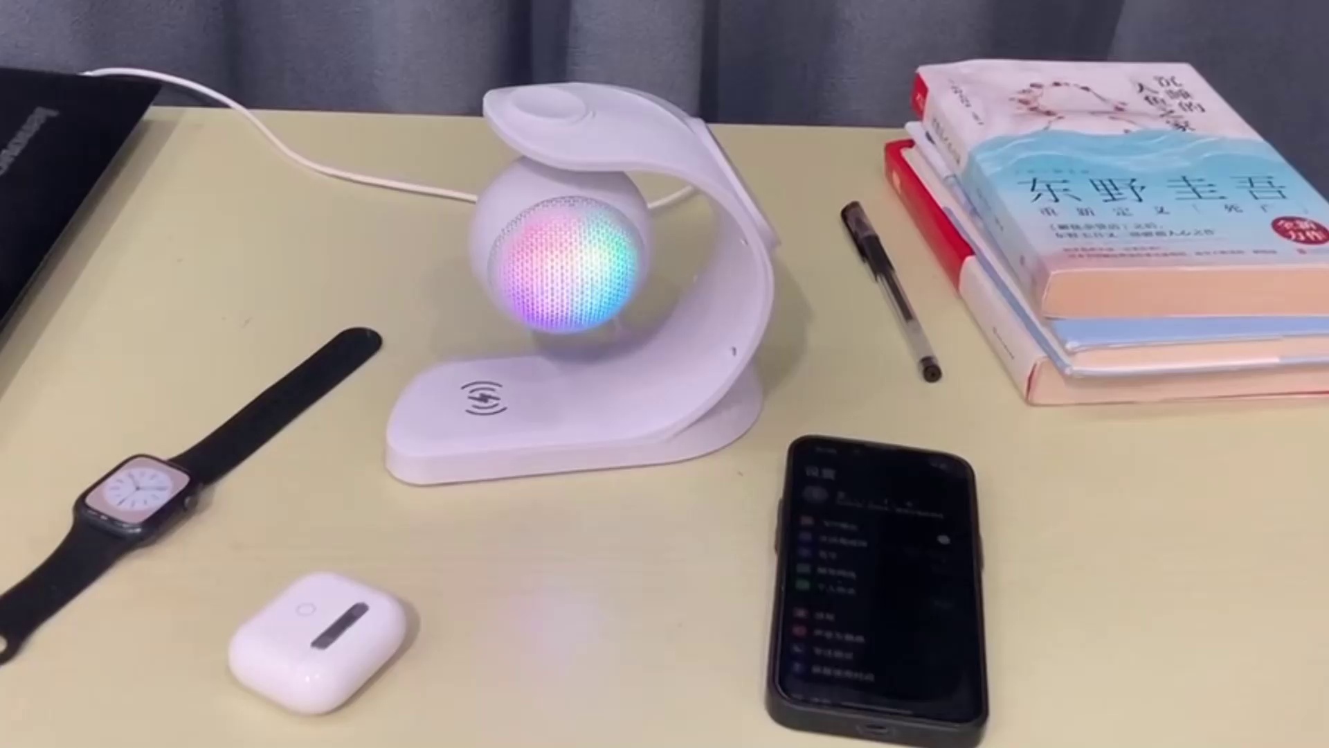 产品功能:磁吸手机无线充,手表,耳机三合一无线充;蓝牙音箱,RGB炫酷氛围灯,TF,U盘,AUX,FM.