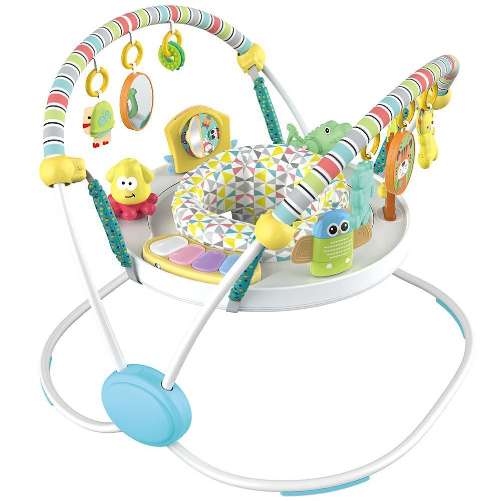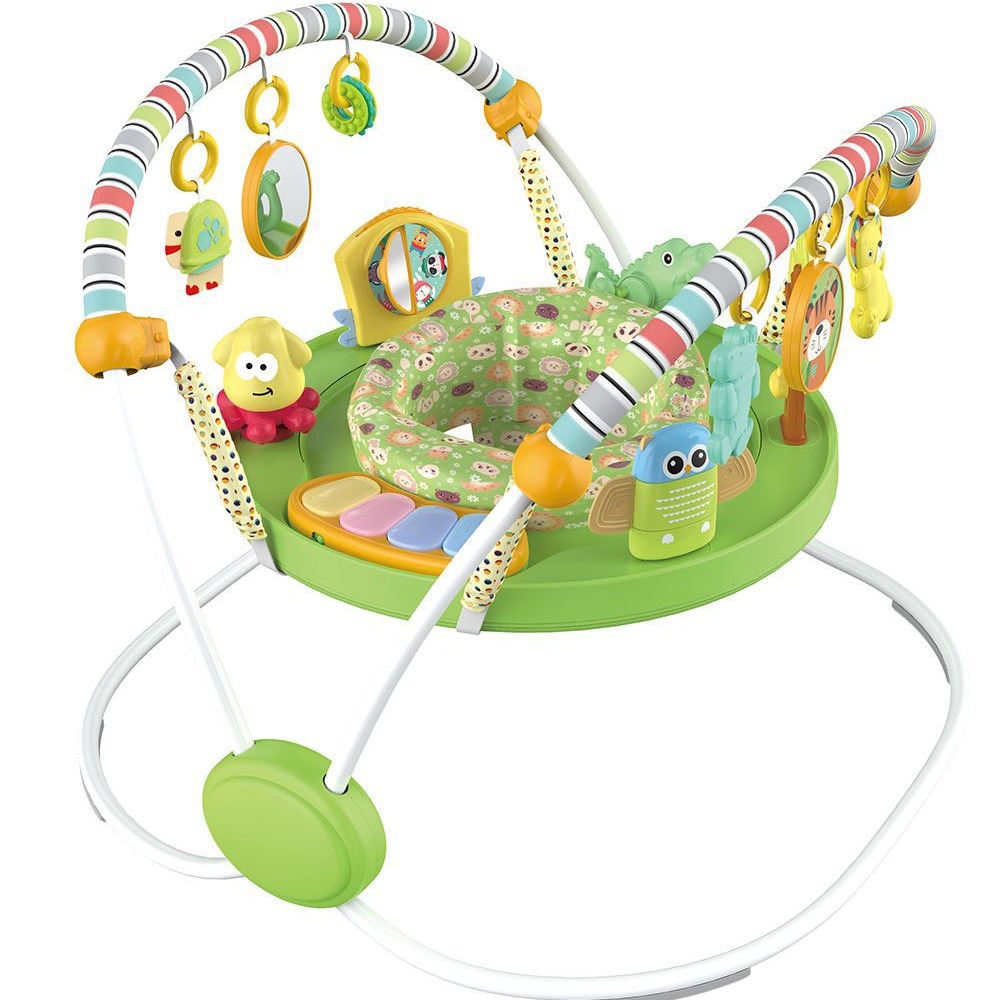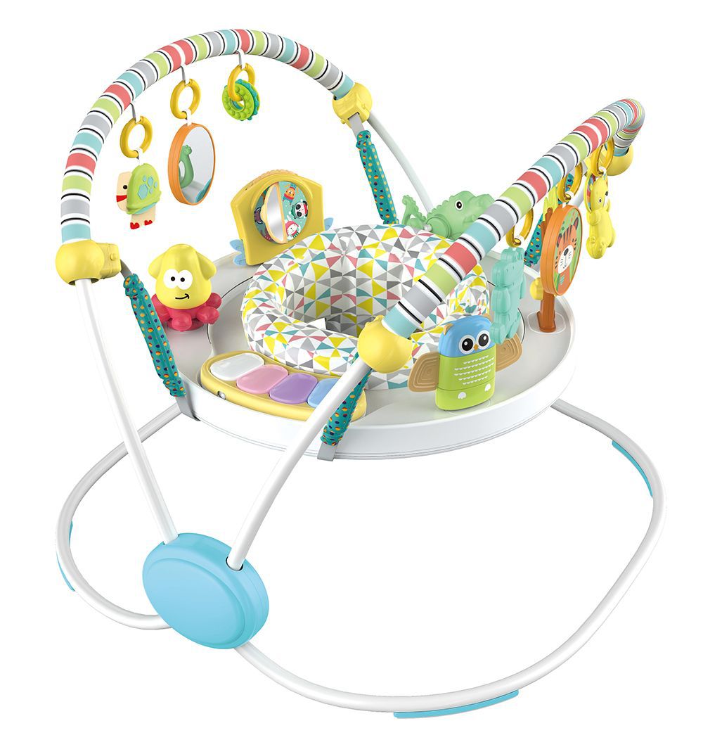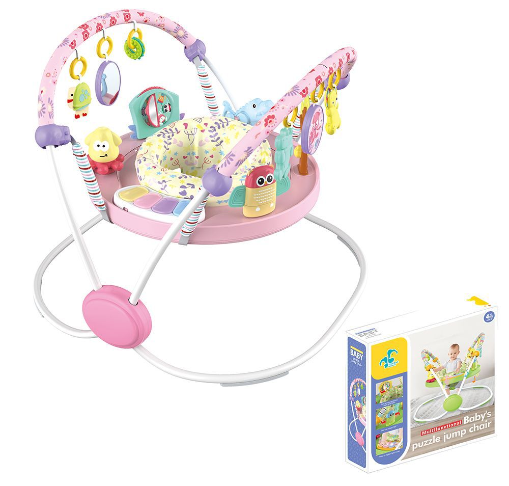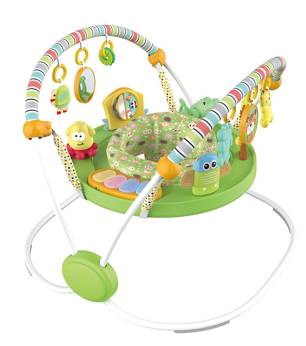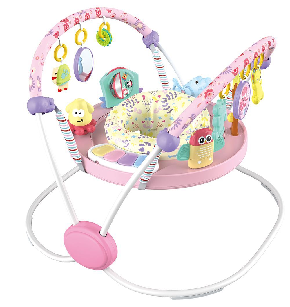 蝶形稳固结构,超大铁架空间,使得结构稳固。跳跳椅可360度旋转,座椅周围超过12种玩具,多功能玩具游戏给宝宝乐趣。电子琴有灯光和音量控制,提供经典旋律。座椅多档位调节高度,满足不同年龄宝宝的需求。蝶形游戏杆玩具分区:海洋区,可爱的小海龟和多图形圆圈,带一个小镜子。动物区,造型别致的鳄鱼和狮子,双面有可爱图案的椭圆盘。座垫可以拆卸清洗。