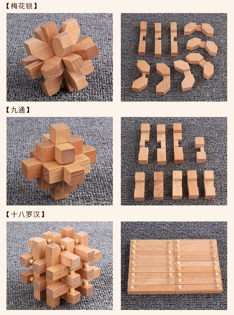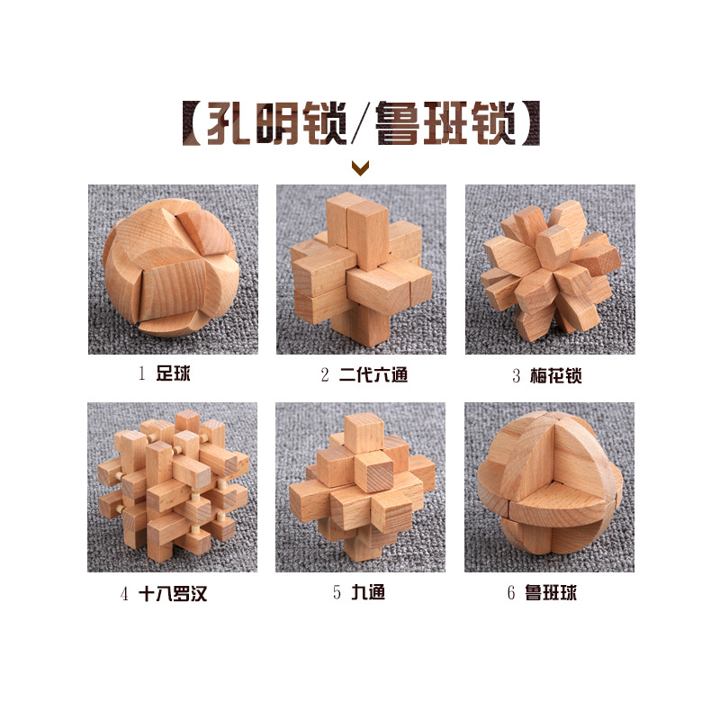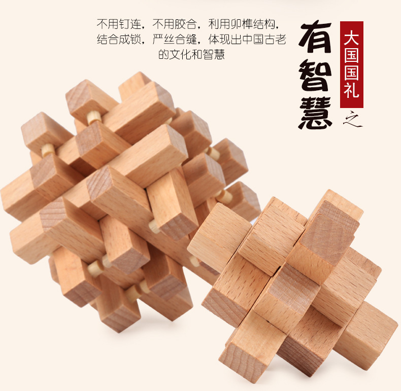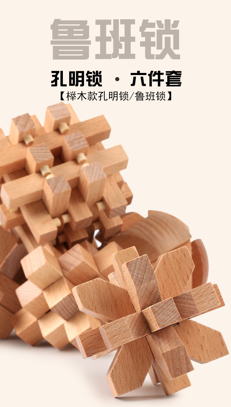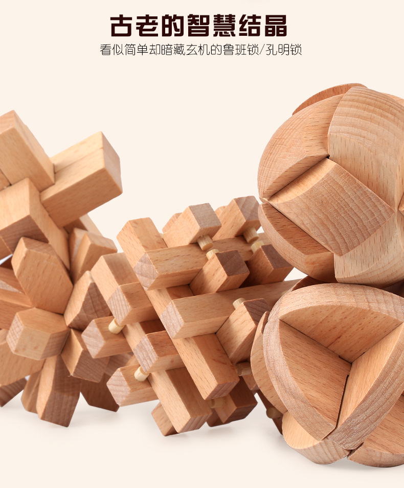 鲁班锁孔明锁全套礼盒木制益智玩具儿童成人智力解锁机关榉木 English | 投诉
