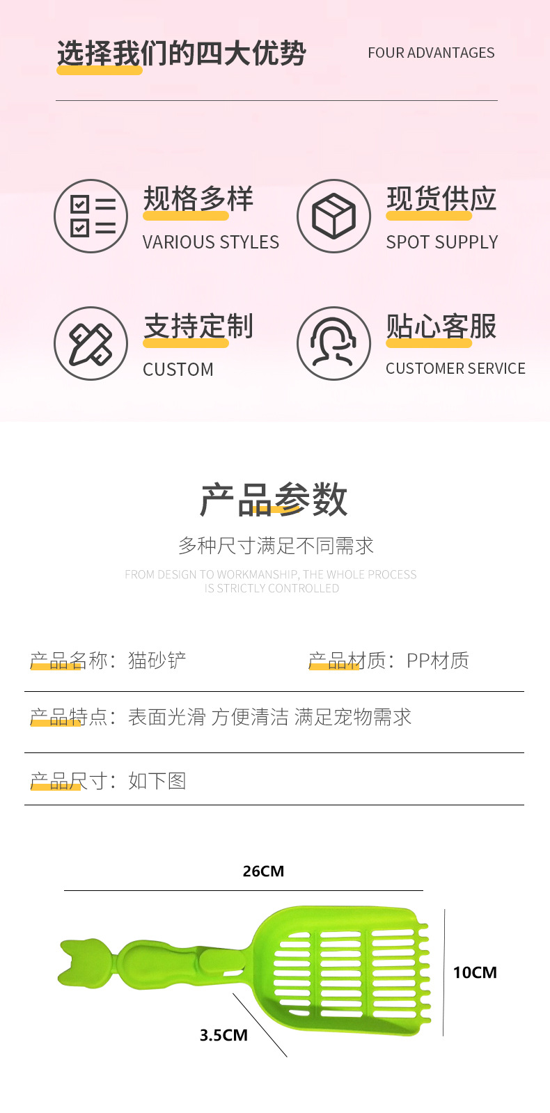 猫砂铲 糖果色新款大号宠物猫铲猫砂清洁用品拾便器塑料加工定制 English | 投诉