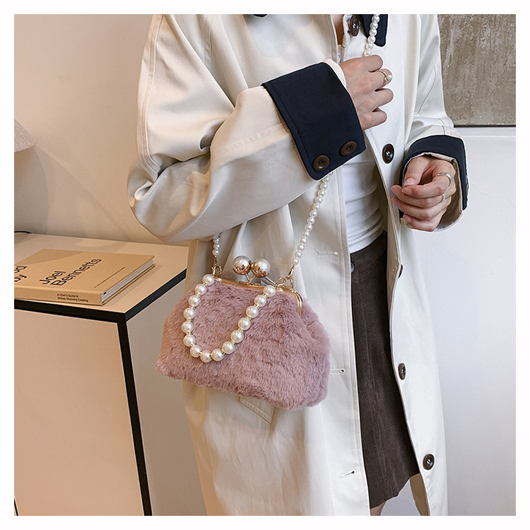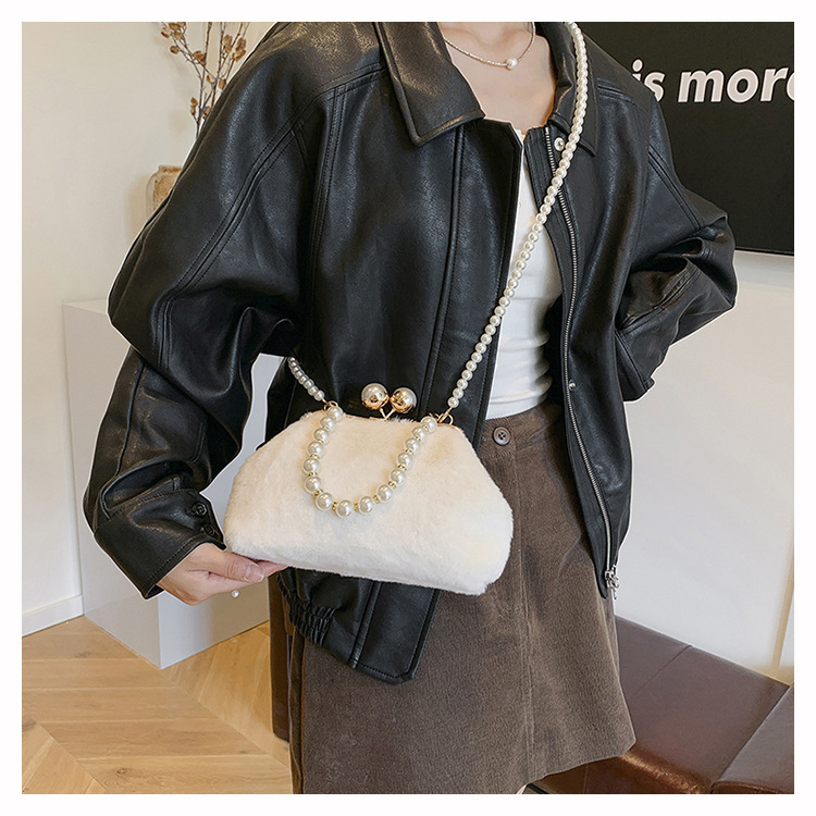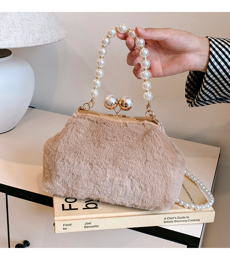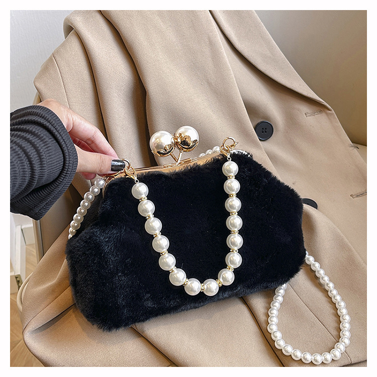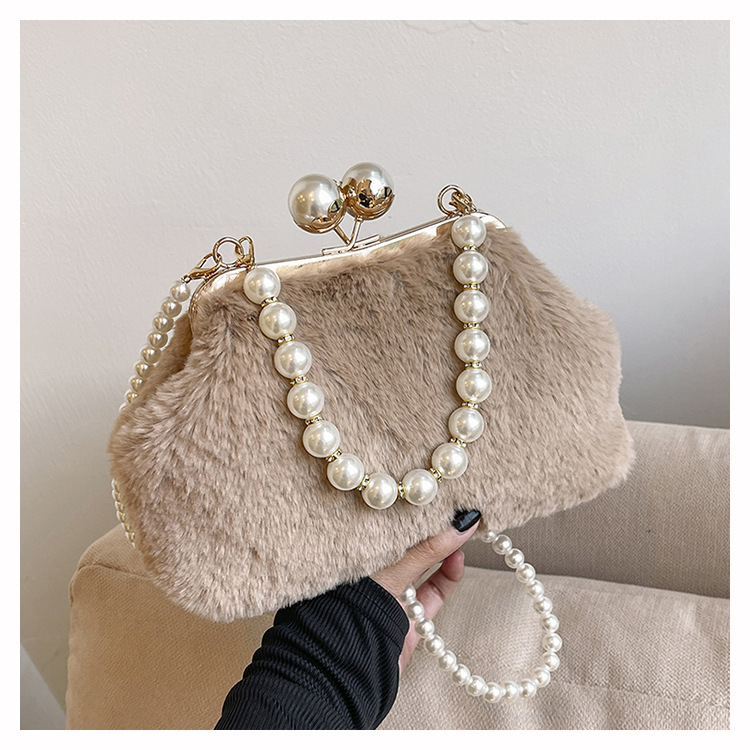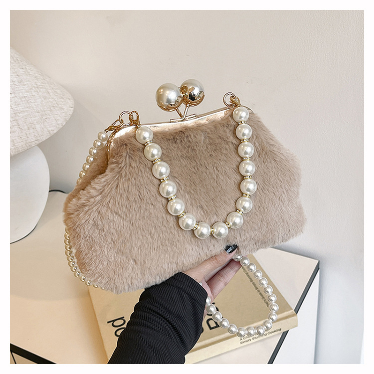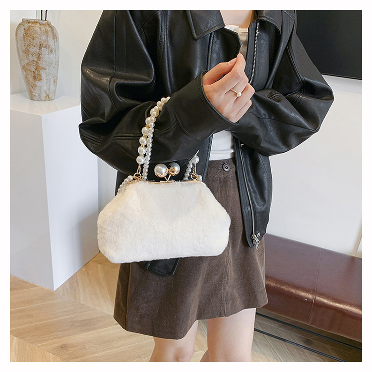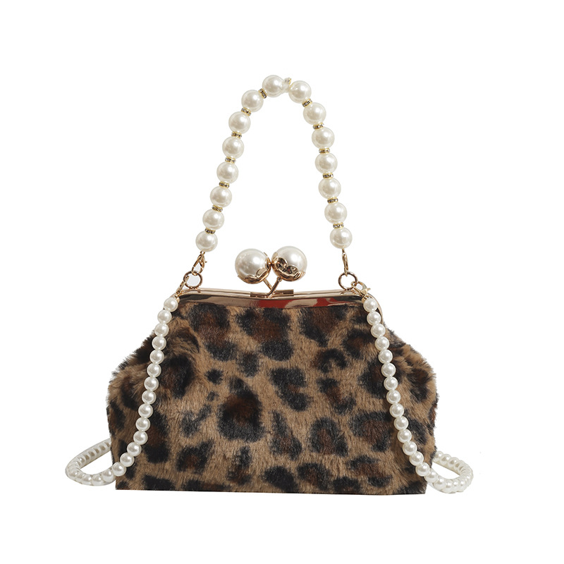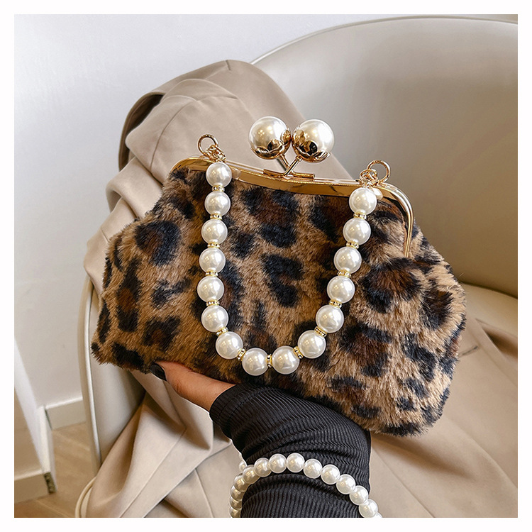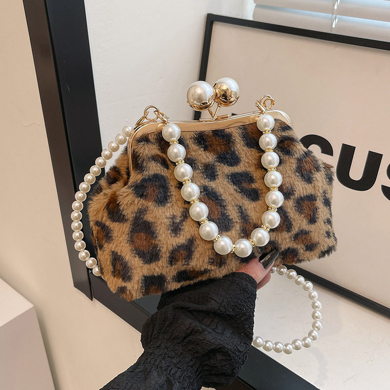 手提毛毛包女洋气珍珠链夹子包外贸冬季豹纹毛绒包单肩斜挎贝壳包