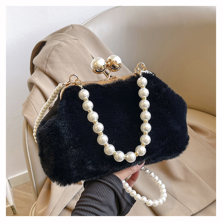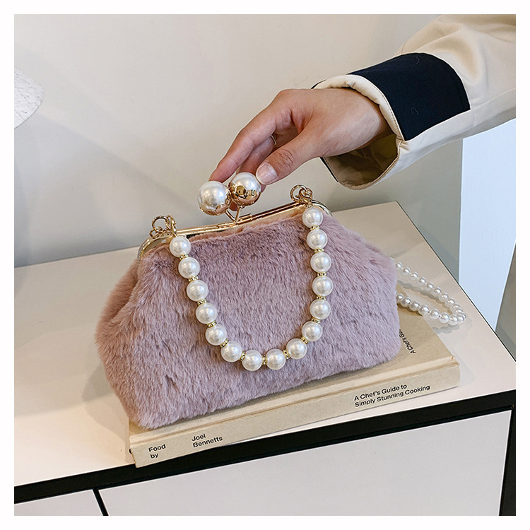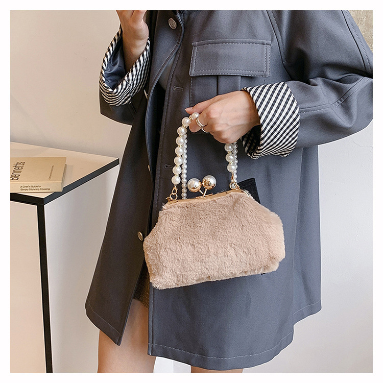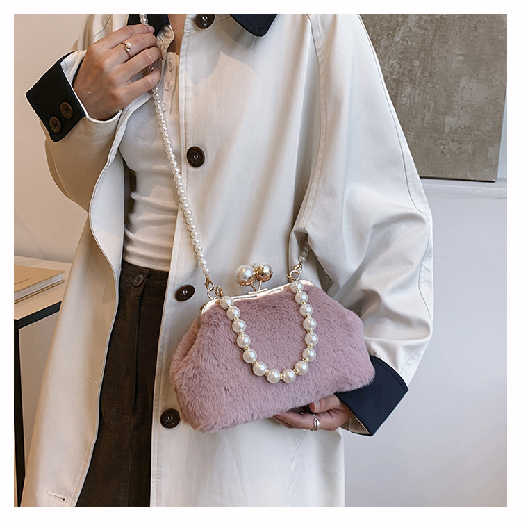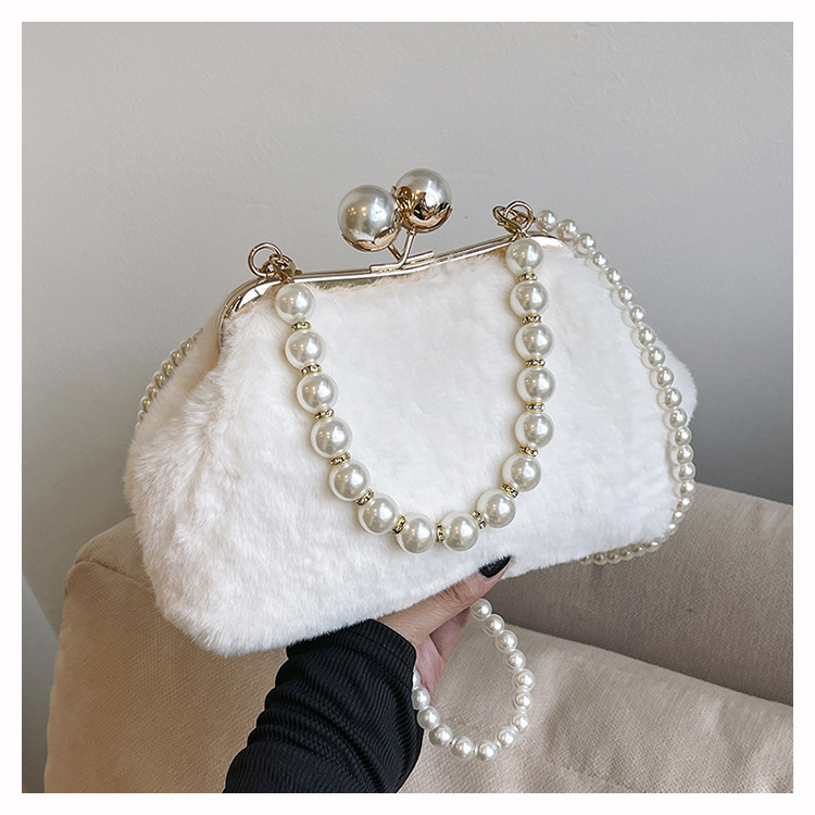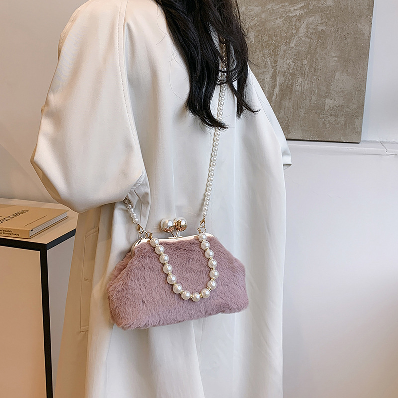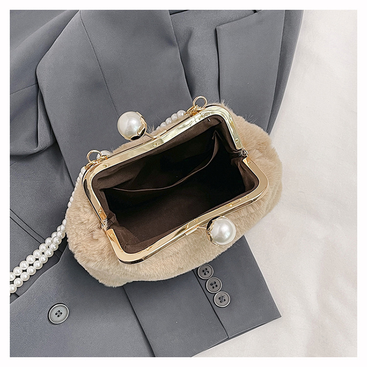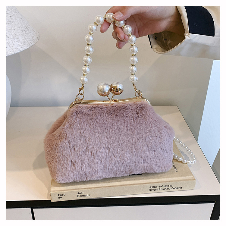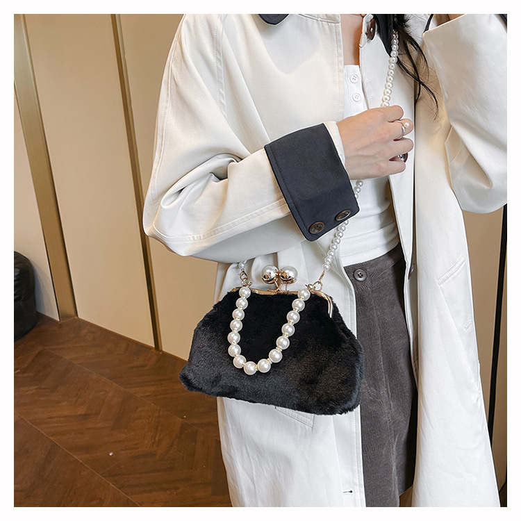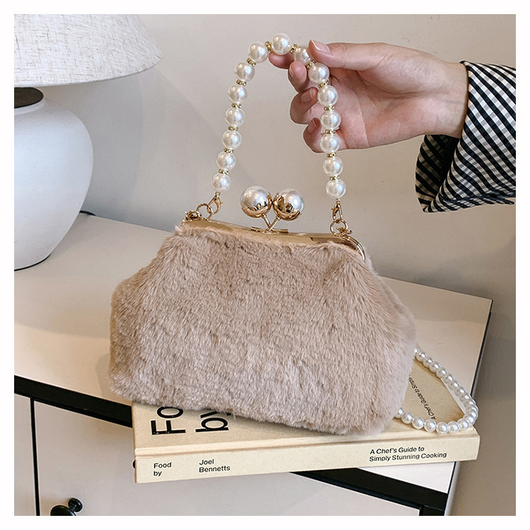 手提毛毛包女洋气珍珠链夹子包外贸冬季豹纹毛绒包单肩斜挎贝壳包