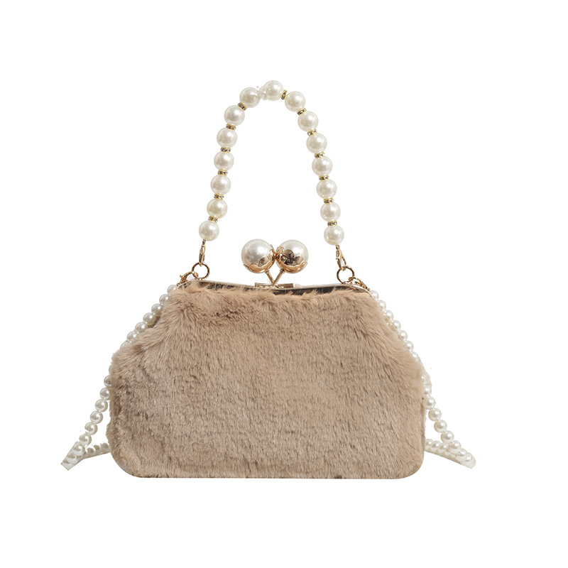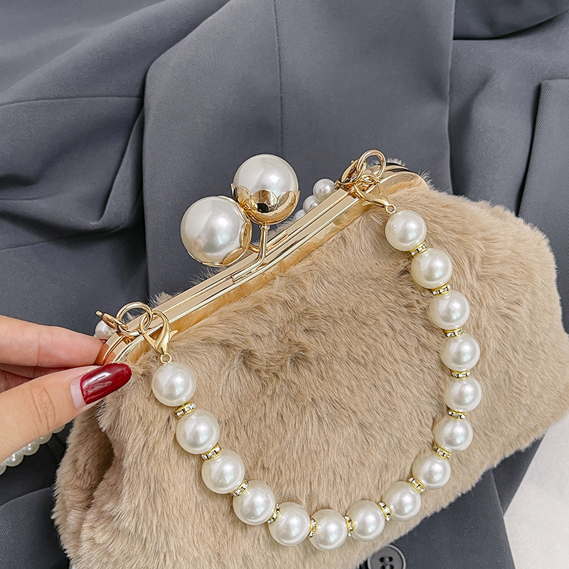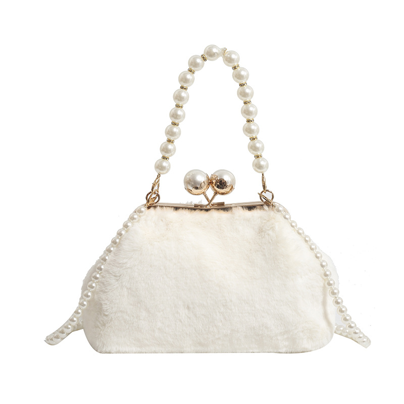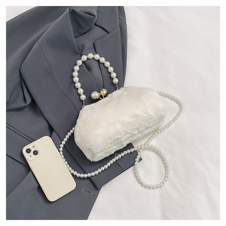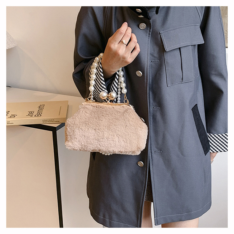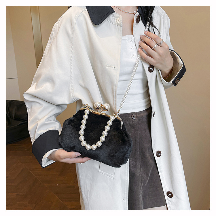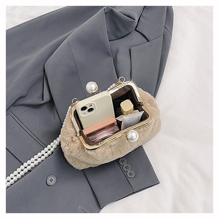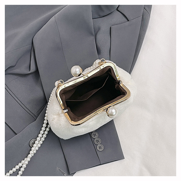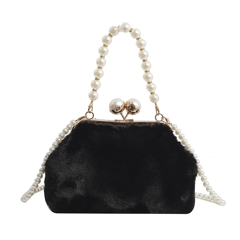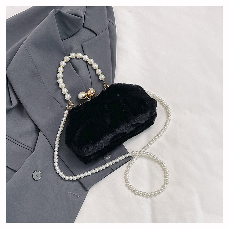 手提毛毛包女洋气珍珠链夹子包外贸冬季豹纹毛绒包单肩斜挎贝壳包