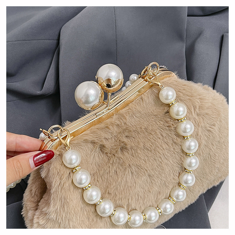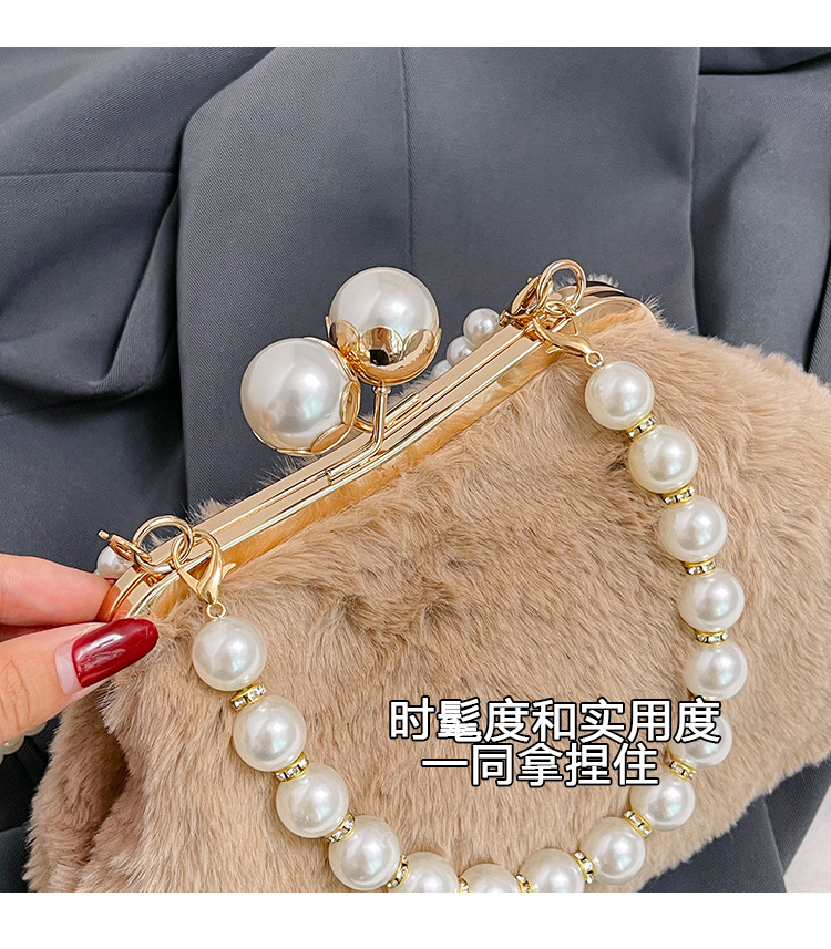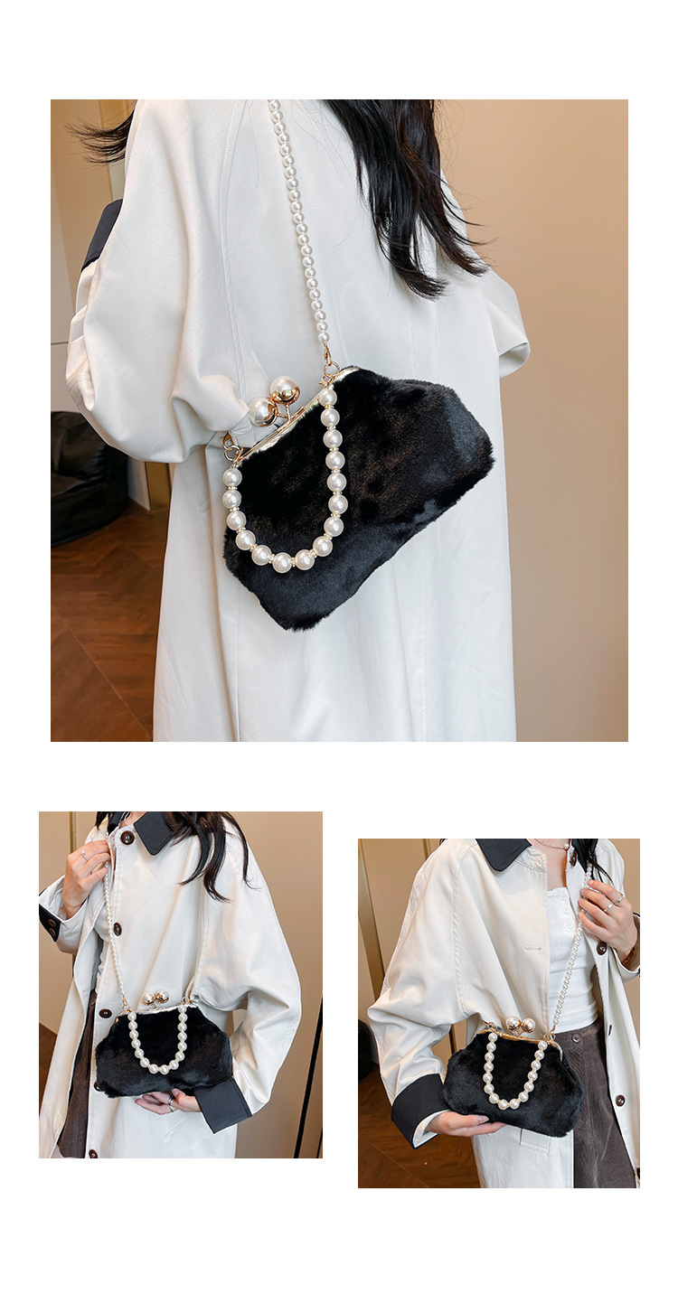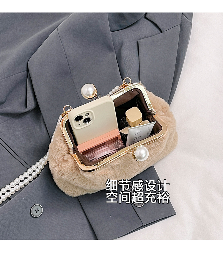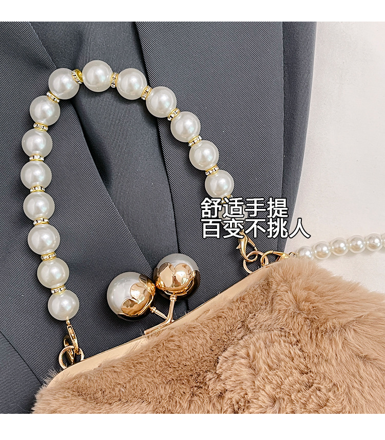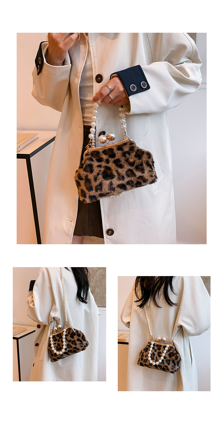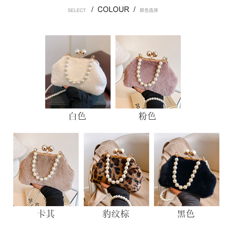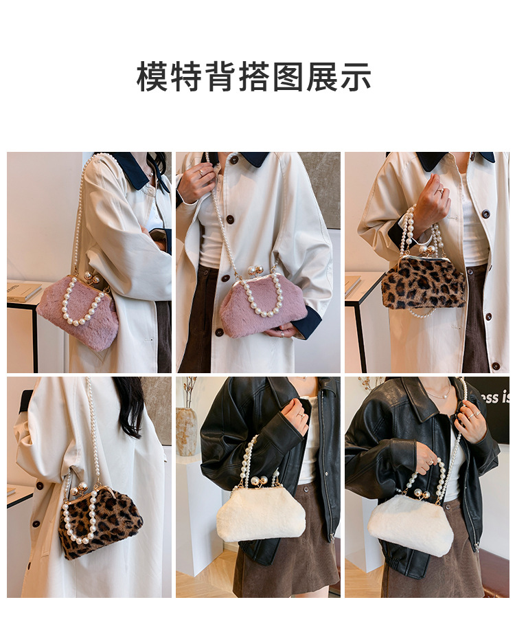 手提毛毛包女洋气珍珠链夹子包外贸冬季豹纹毛绒包单肩斜挎贝壳包 投诉