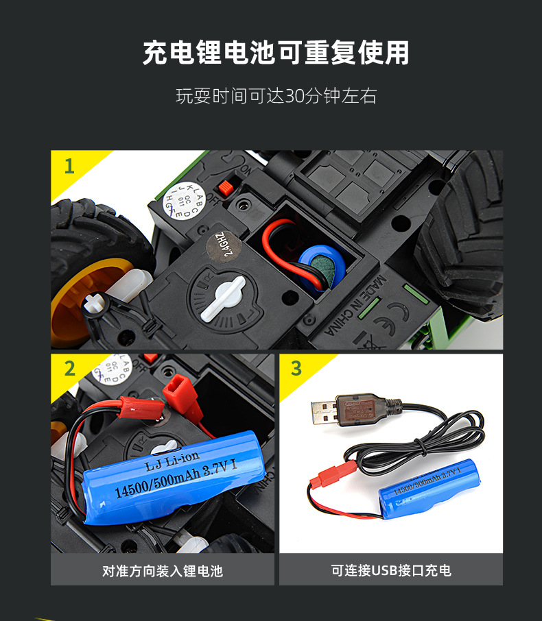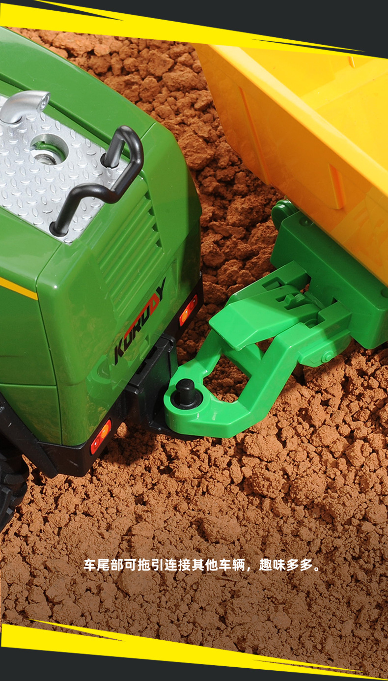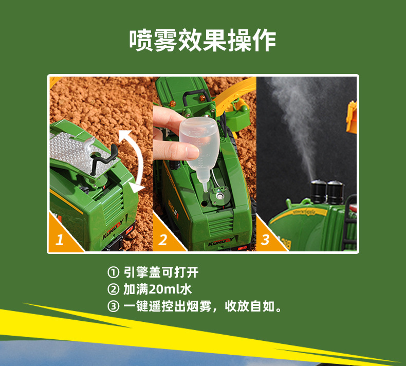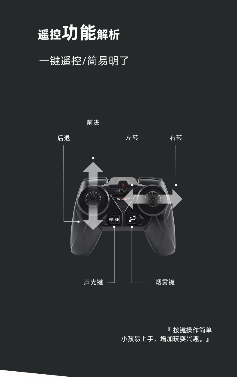 【产品功能】:仿真外观,仿真冒烟,软胶轮胎,车尾预留挂勾,前进,后退,向左转,向右转,灯光音效开启/关闭。