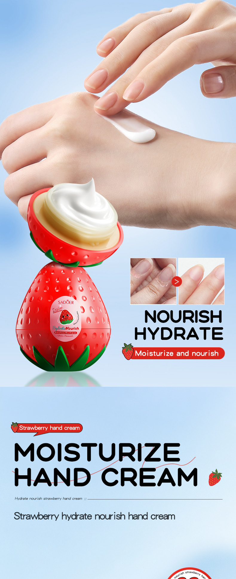 产品类别: 护手霜 品牌: SADOER 是否进口: 否 品牌类型: 精品国货 商品条形码: 6942349717819 适用人群: 通用 香型: 水果香 产地: 广州 执行质量标准: / 产品系列: 水果护手霜