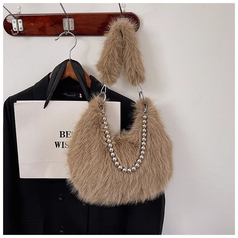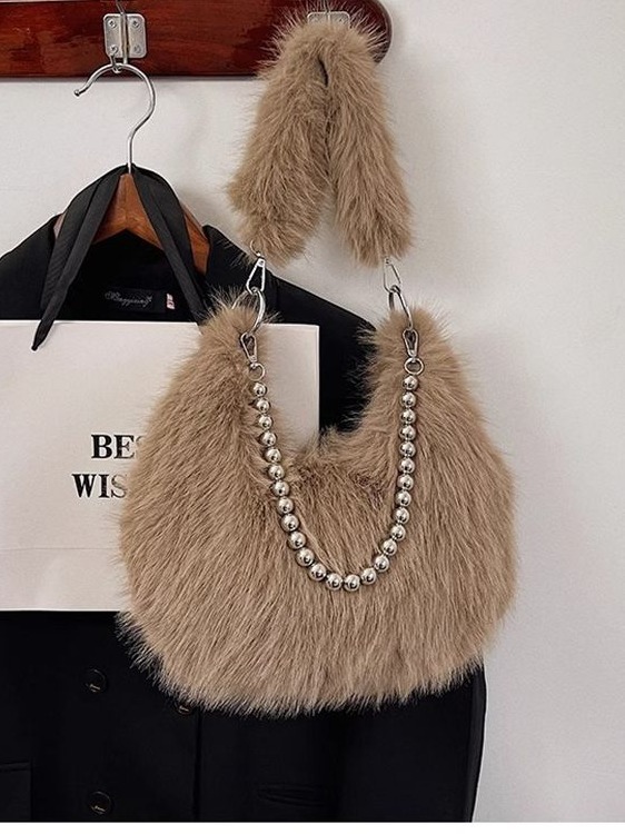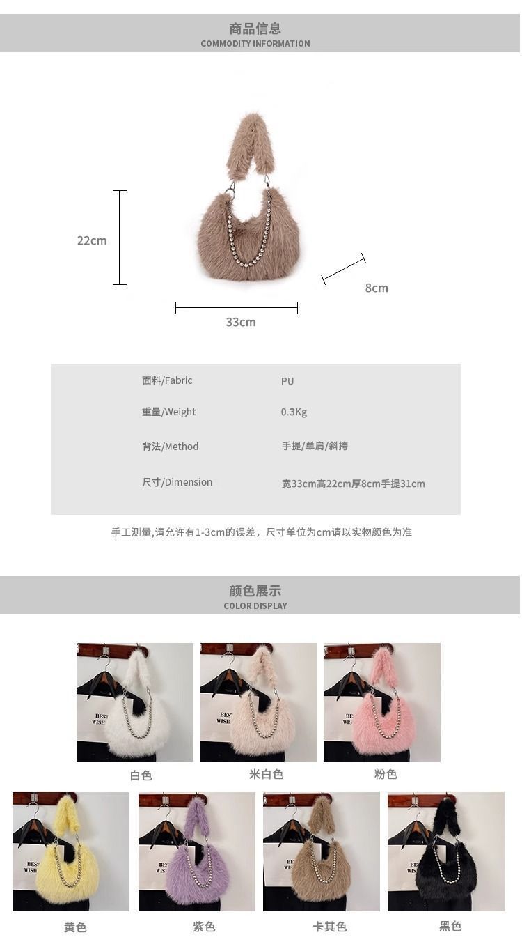 颜色: 咖色,白色,黑色,粉色,杏色,浅紫色 风格: 清新甜美 货号: Q链条包 材质: 仿狐狸毛 箱包潮流款式: 腋下包 箱包大小: 中 流行元素: 毛绒 上市年份季节: 2024年秋季 里料质地: 聚酯纤维 箱包形状: 水饺型 重量: 0.1 kg/个