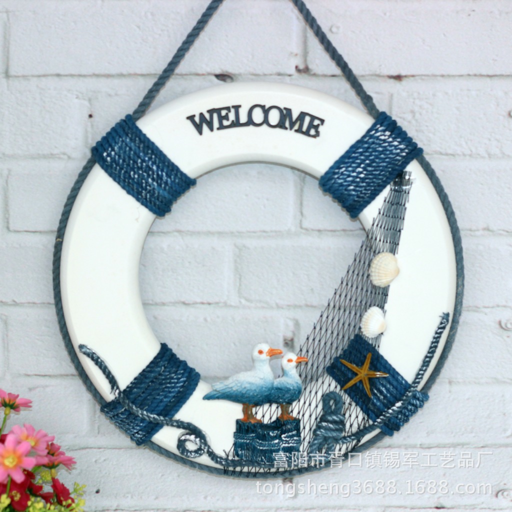 地中海风格木质救生圈装饰品 创意挂饰壁饰游泳圈工艺品 WELCOME