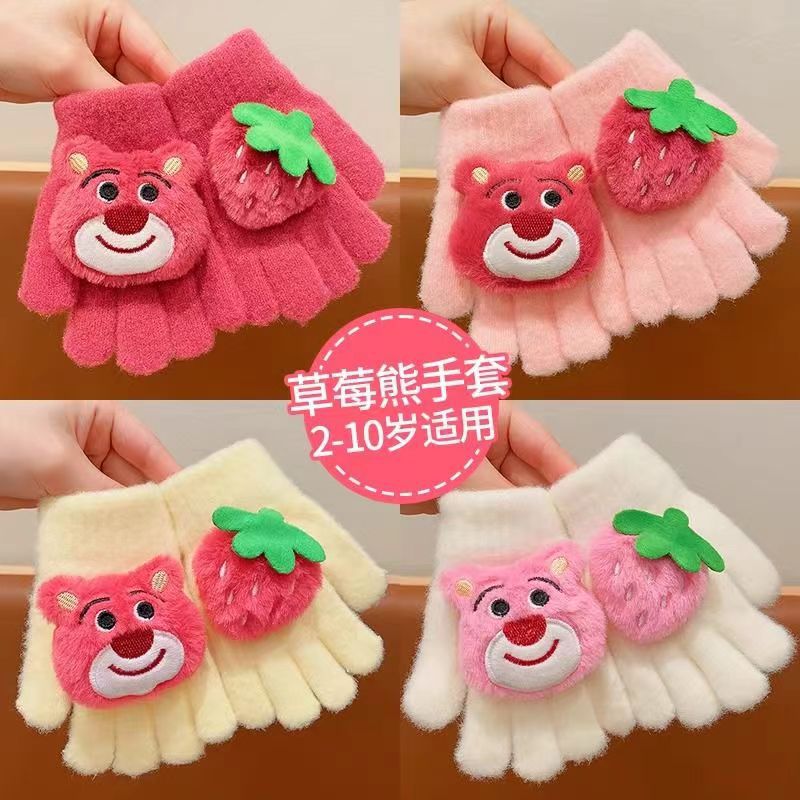 新款批发儿童卡通可爱草莓熊保暖分指写字手套