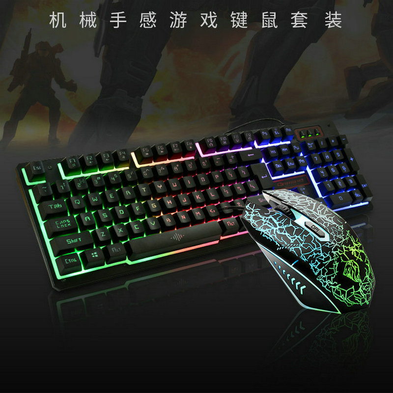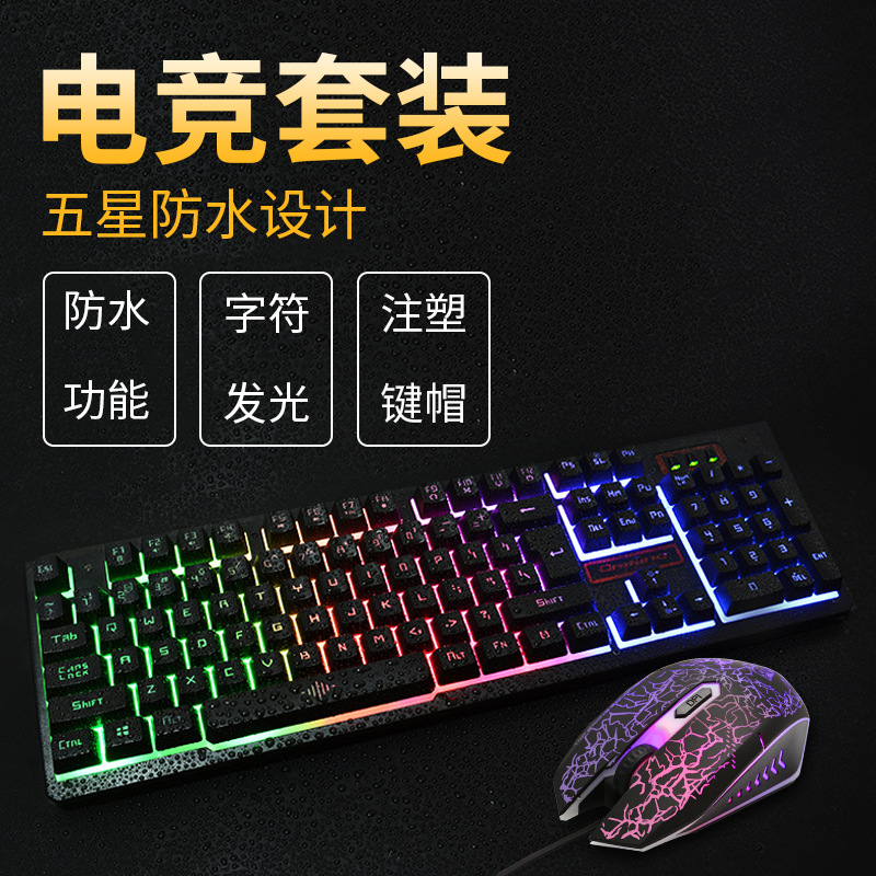 1、键鼠有线,标准USB口,键盘字符和缝隙都发彩虹光;鼠标炫酷爆裂纹七彩变光设计;