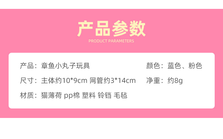 材质: 毛毡 产地: 沈阳 是否进口: 否 产品类别: 啃咬玩具 货号: XDY-WJ-KYGT 箱装数量: 300 重量: 23g 品牌: 喜多鱼 是否专利货源: 否 颜色: 粉色-章鱼小丸子,蓝色-章鱼小丸子