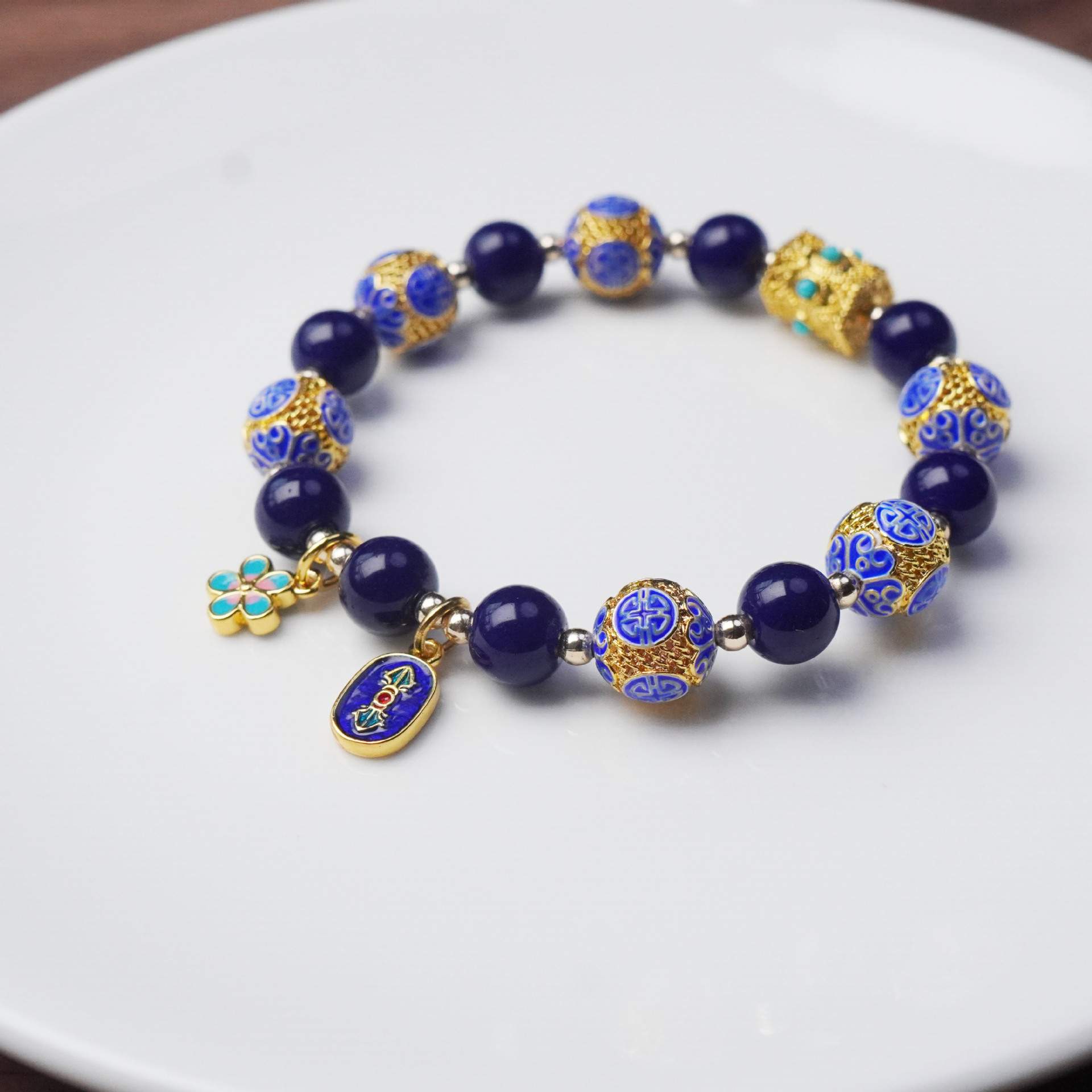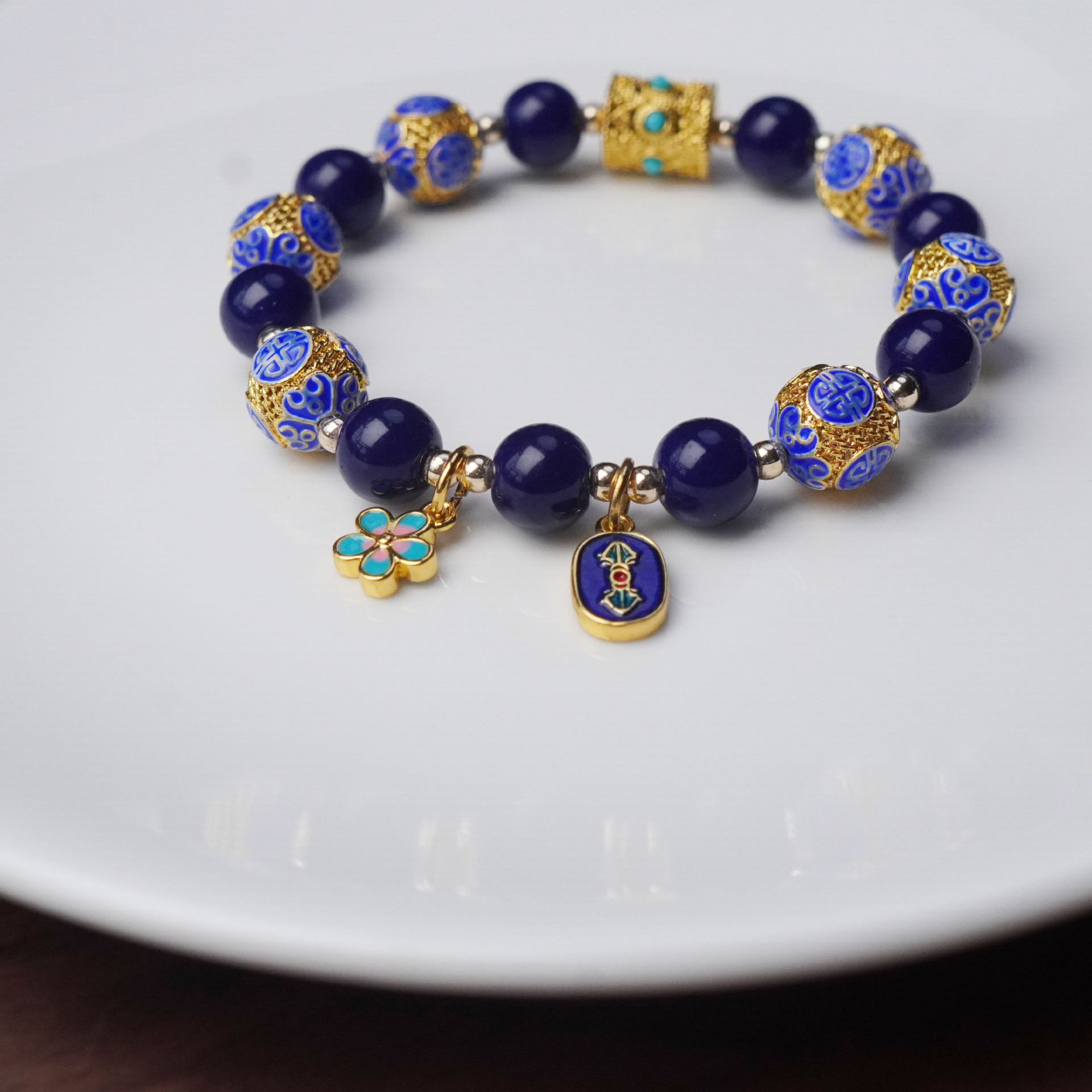 景泰蓝珐琅彩烤蓝手串民族风玛瑙串珠金刚杵花朵吊坠手链国风手饰