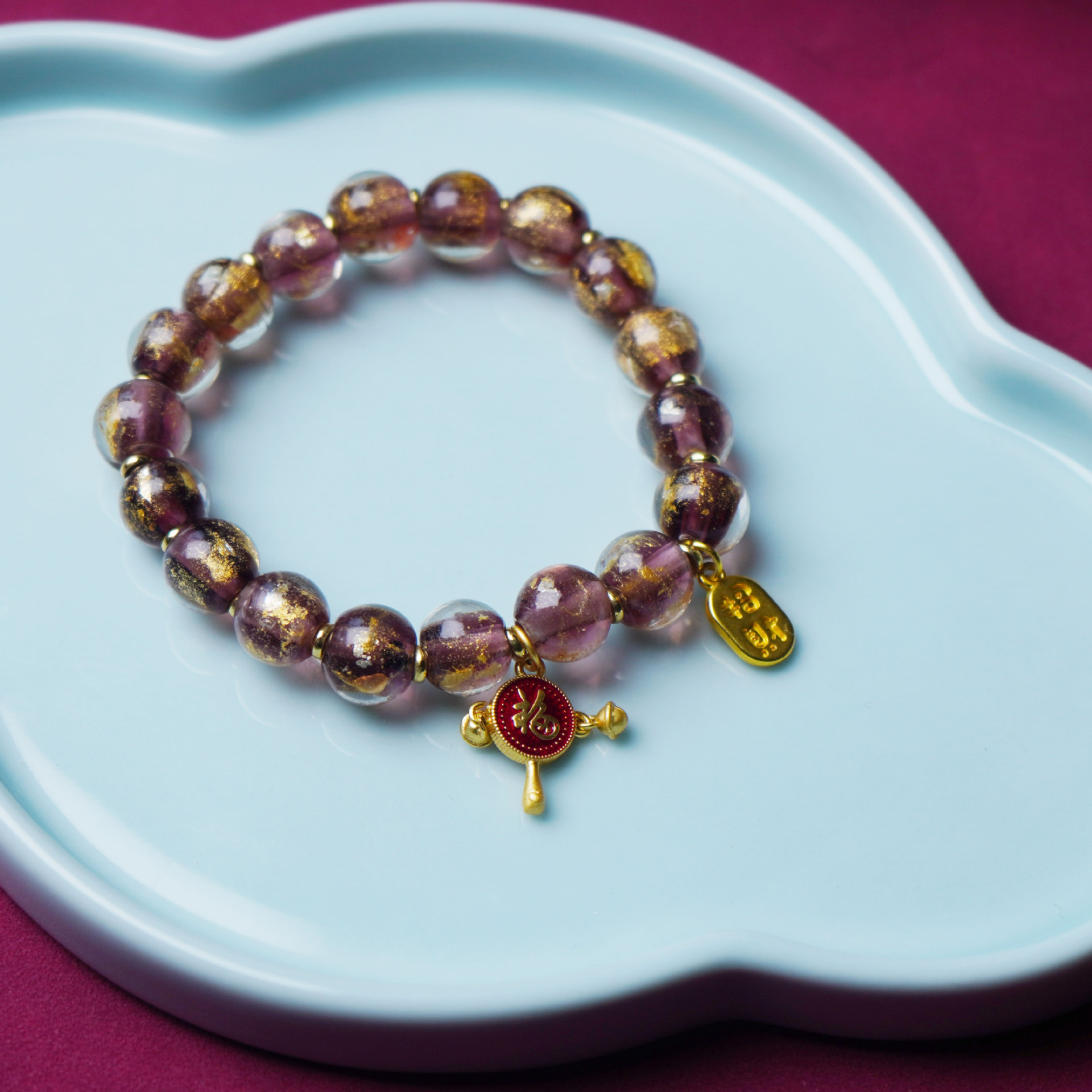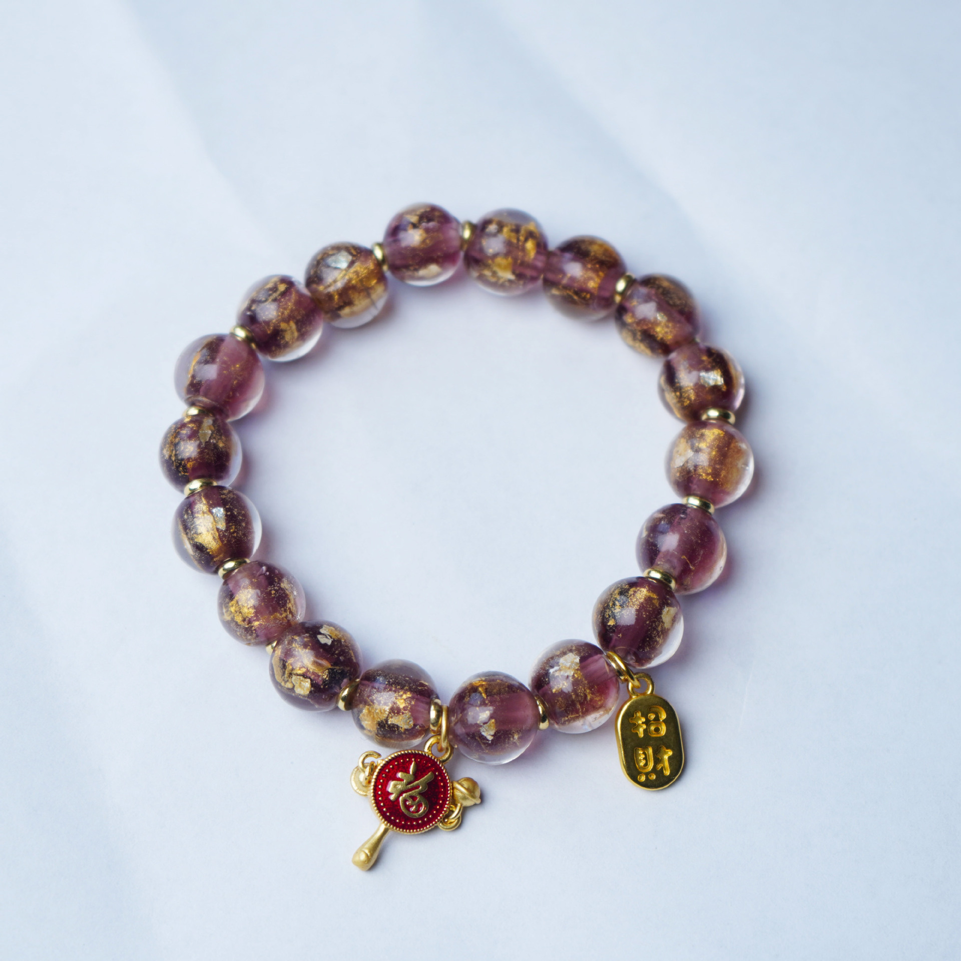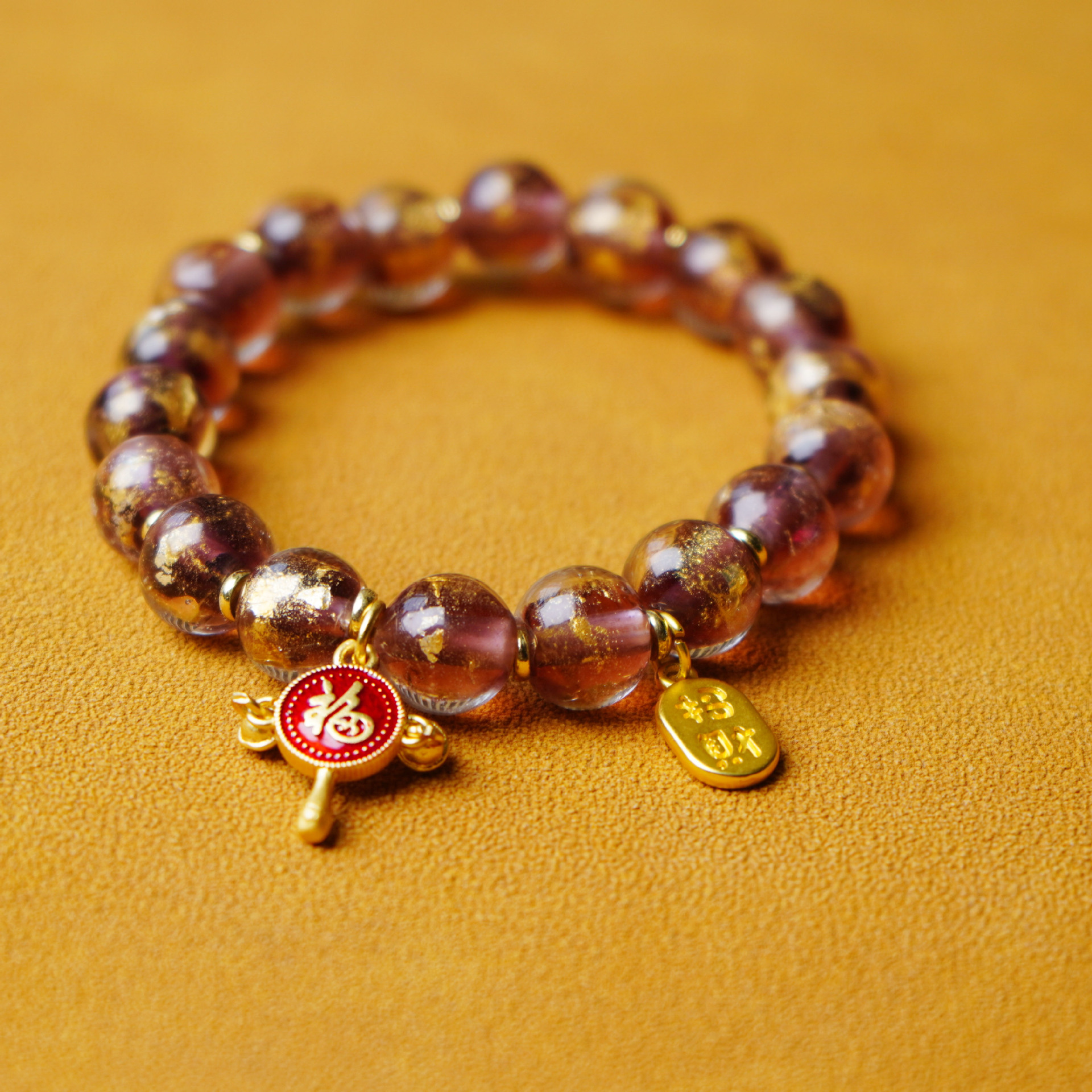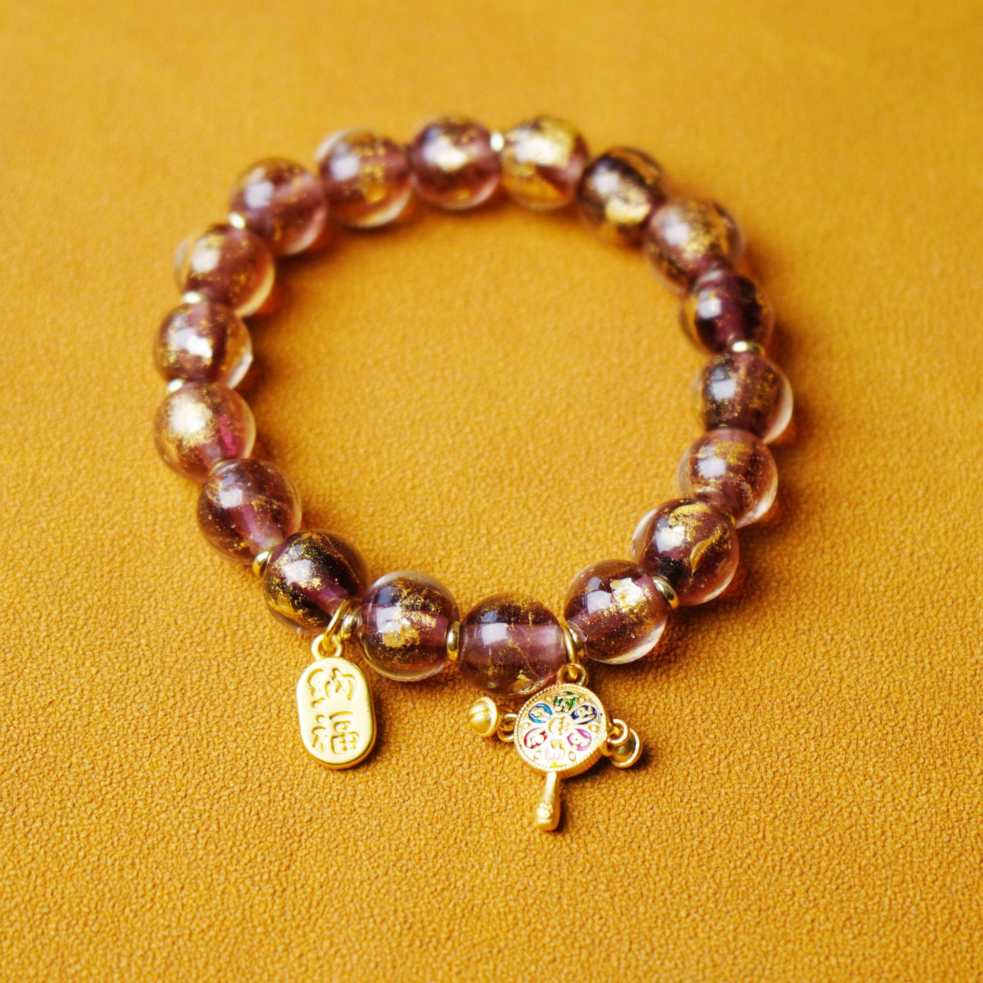 新款民族风紫色金箔琉璃手串女金沙拨浪鼓六字真言福字财财手链女