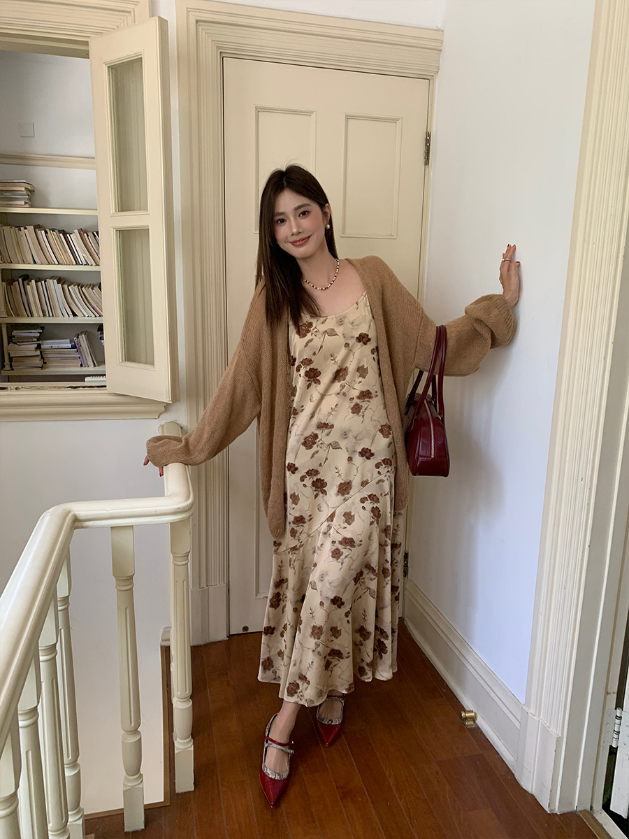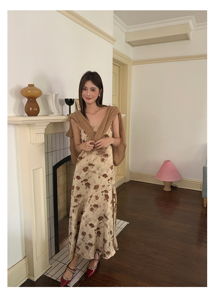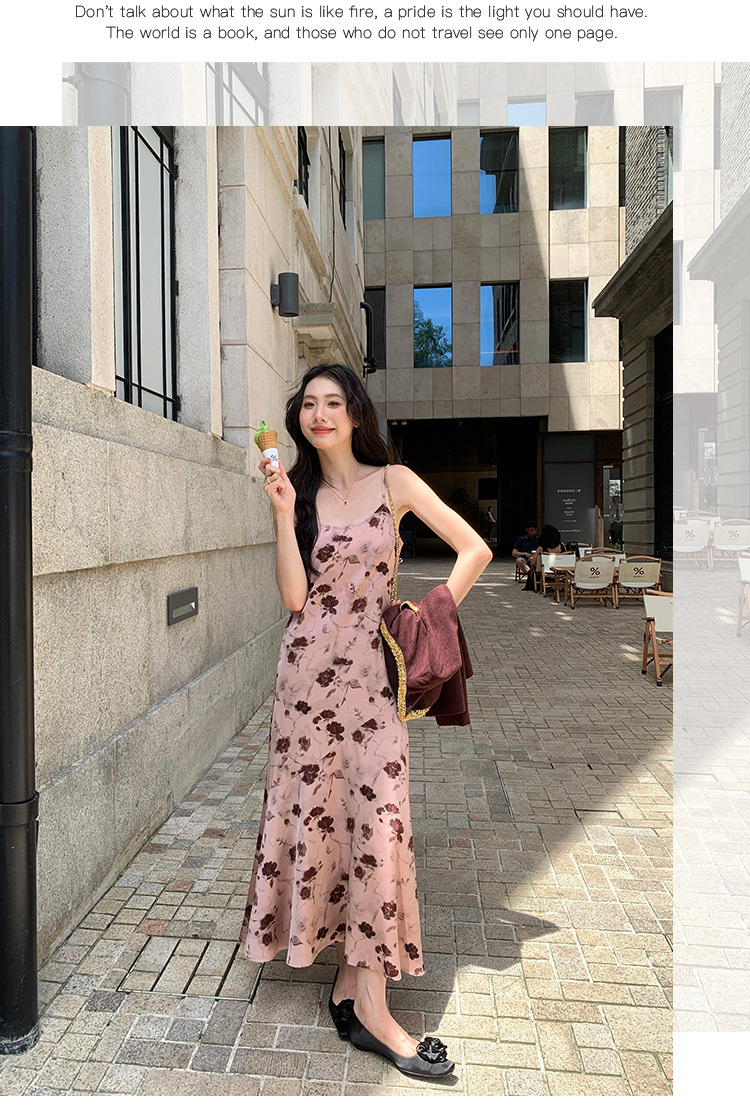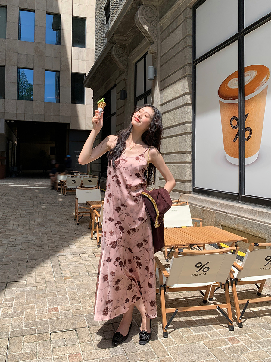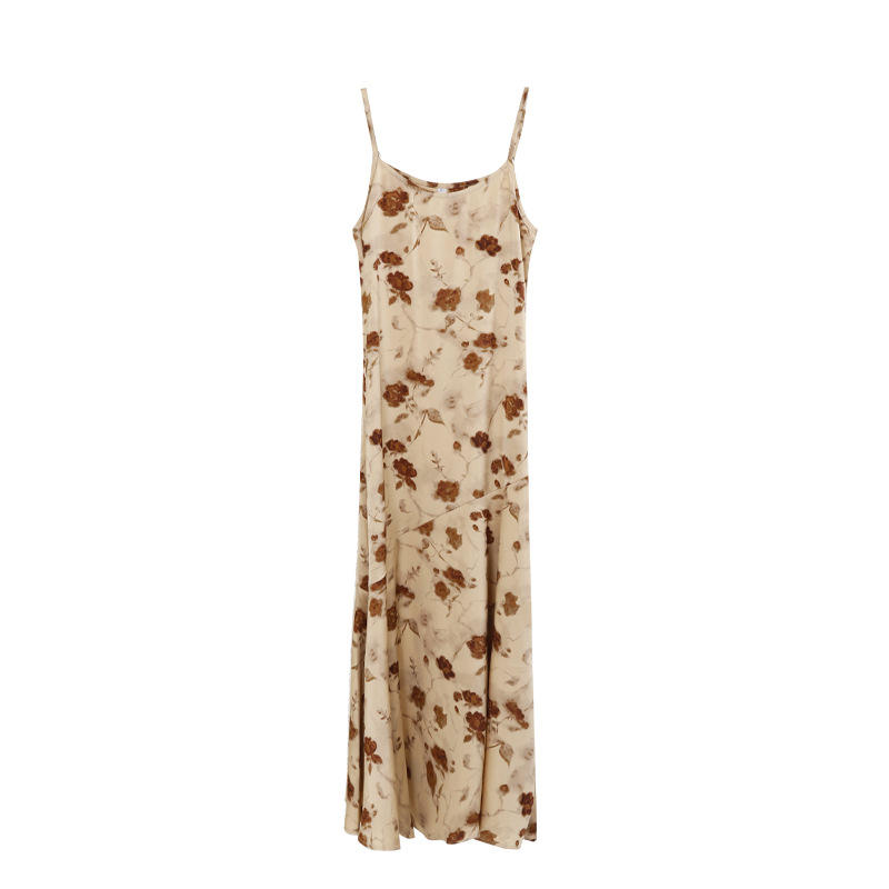 2025爱西里秋季韩系优雅气质吊带缎面印花连衣裙显瘦长裙女11731