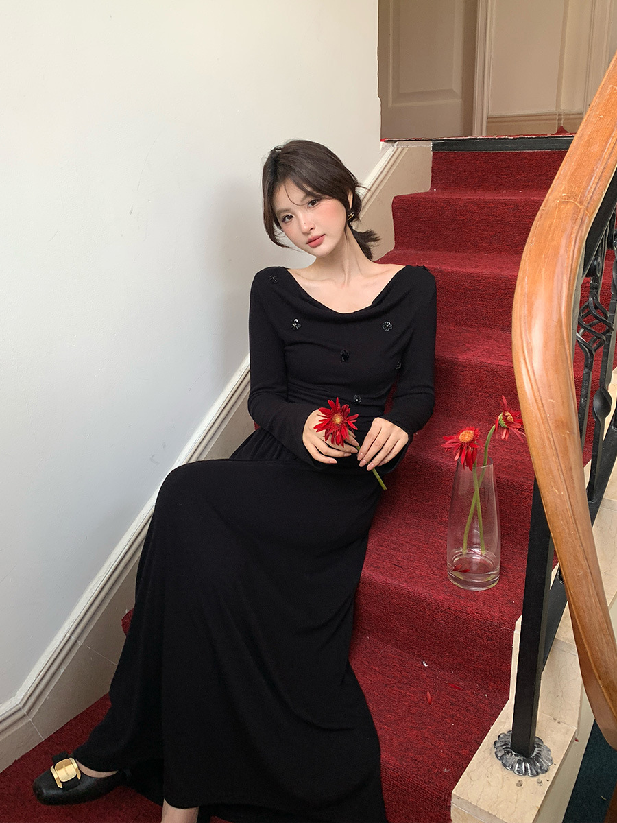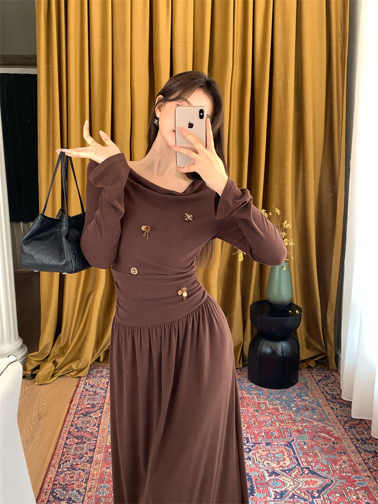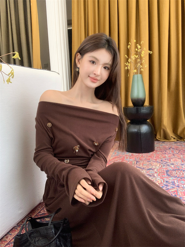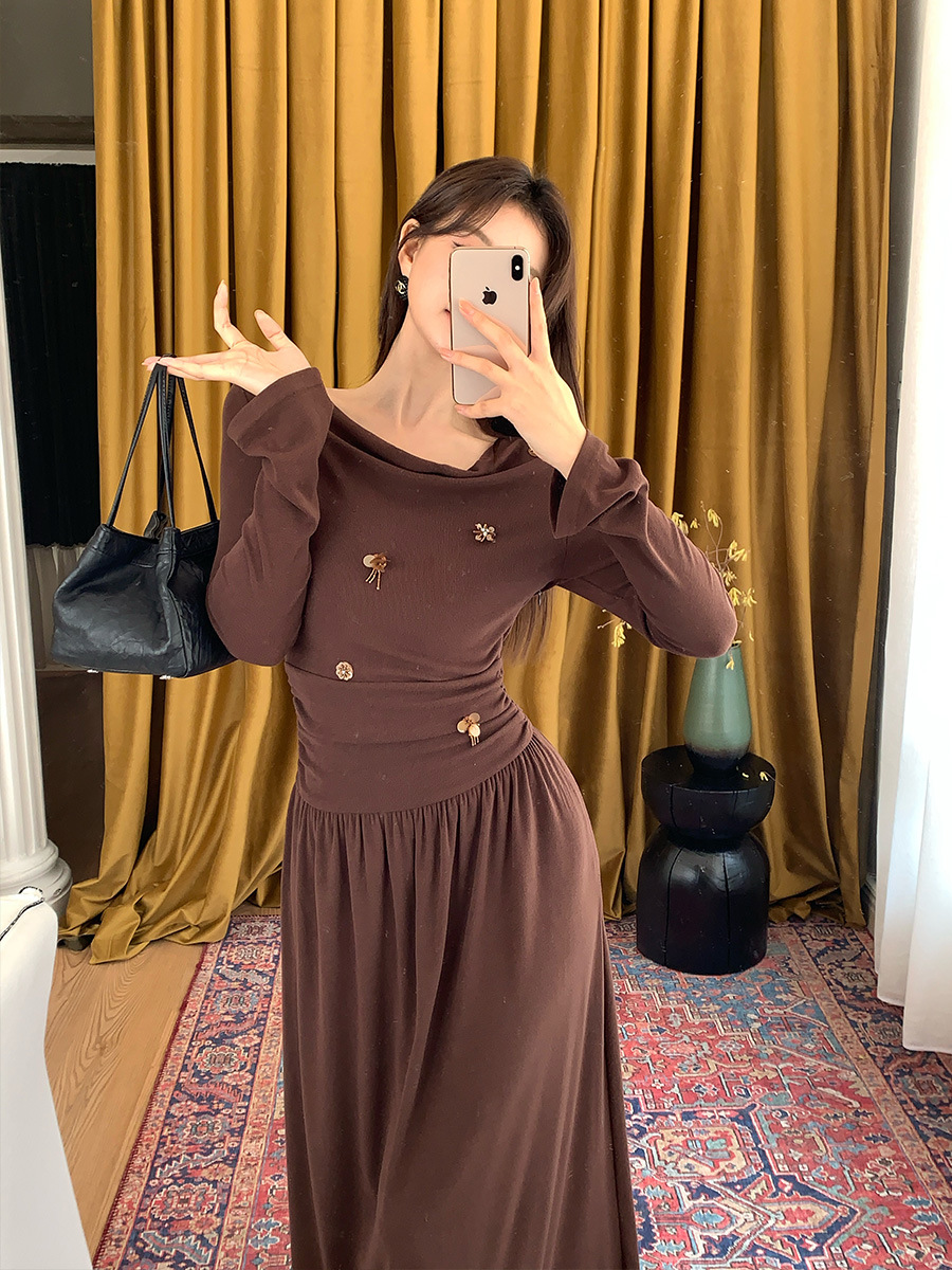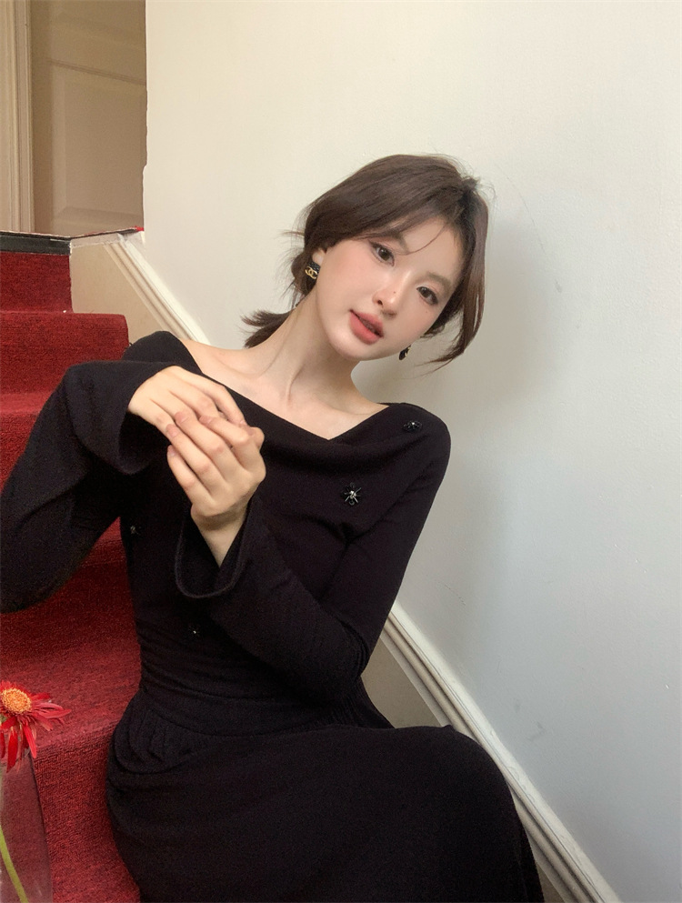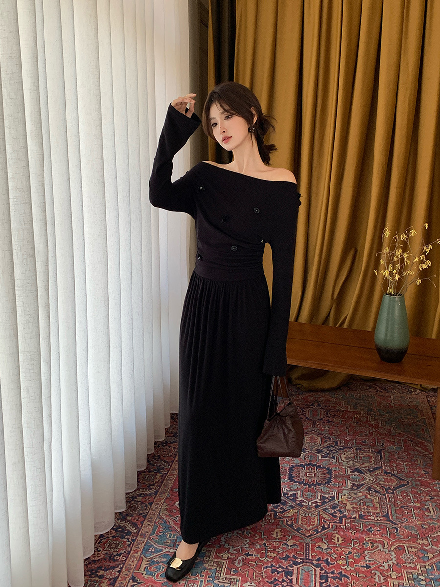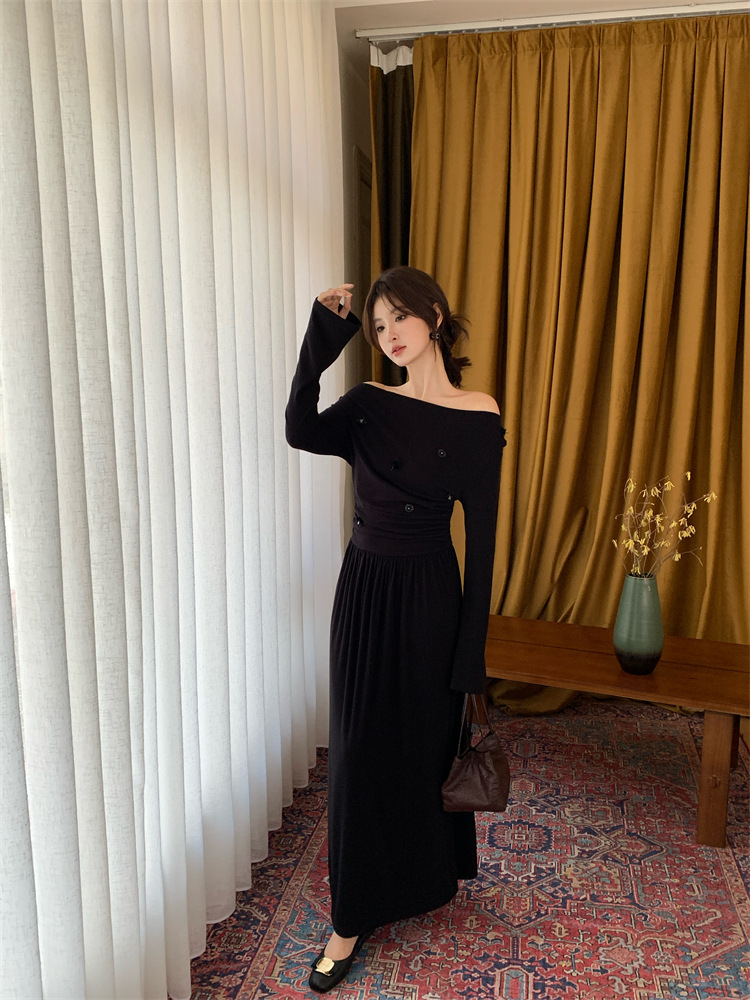 2025秋季新款气质优雅纯色一字领高腰长袖针织连衣裙88121