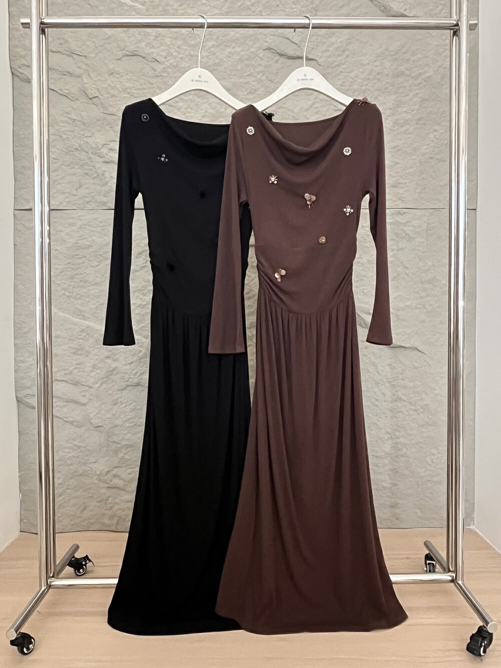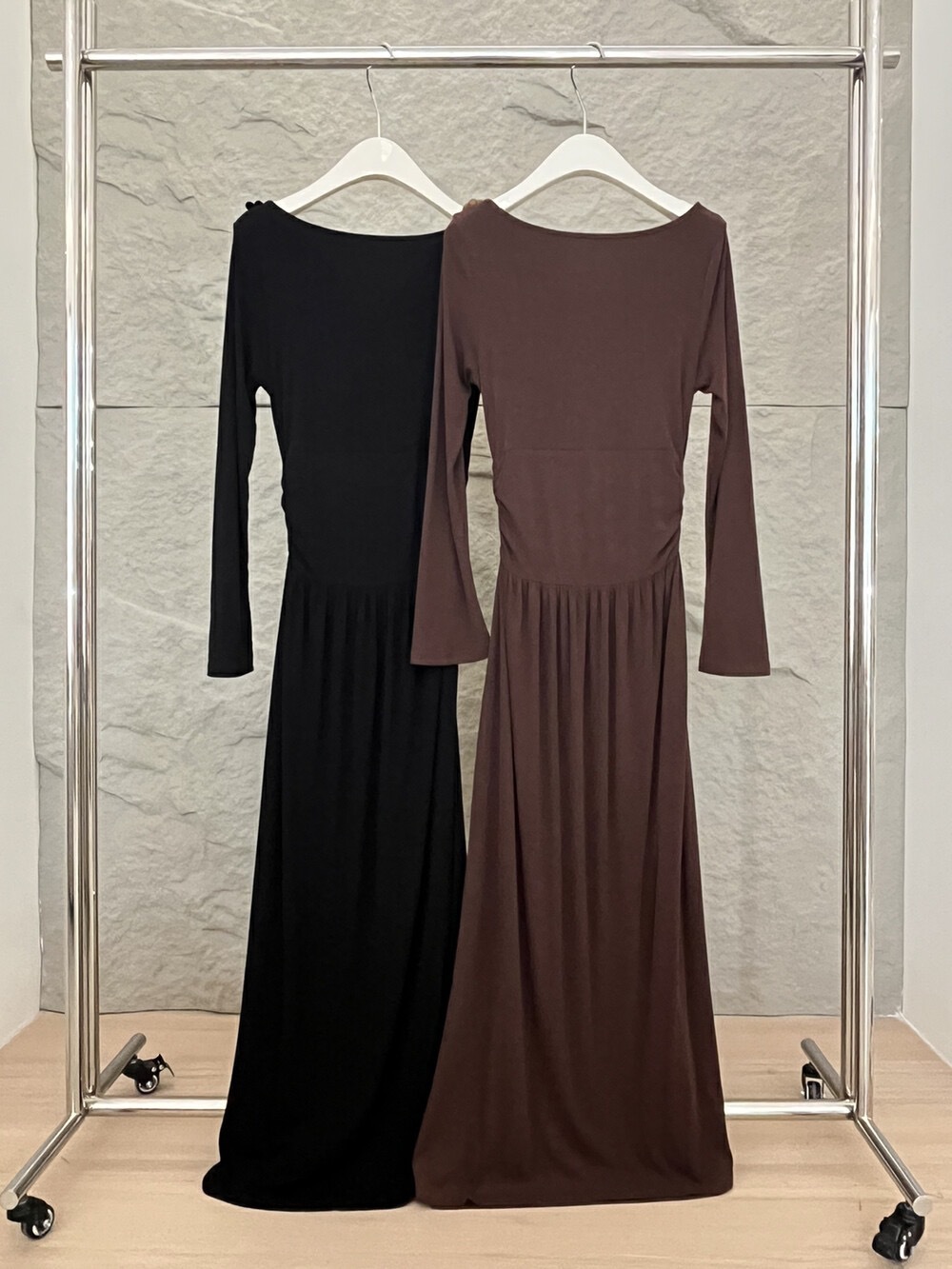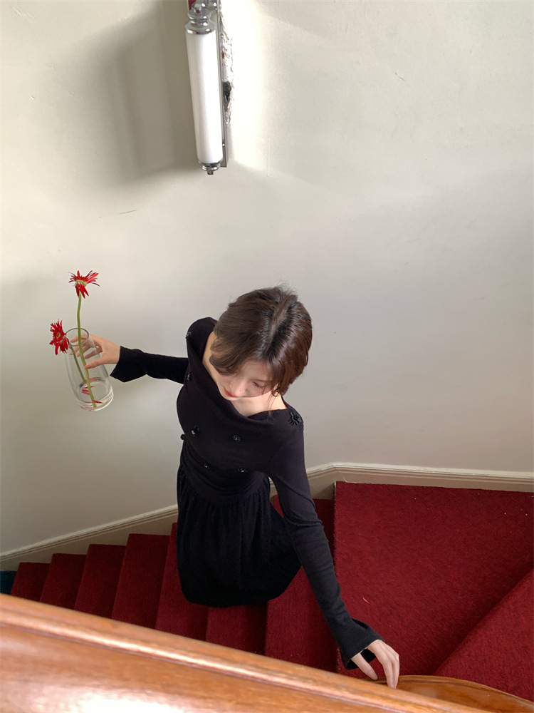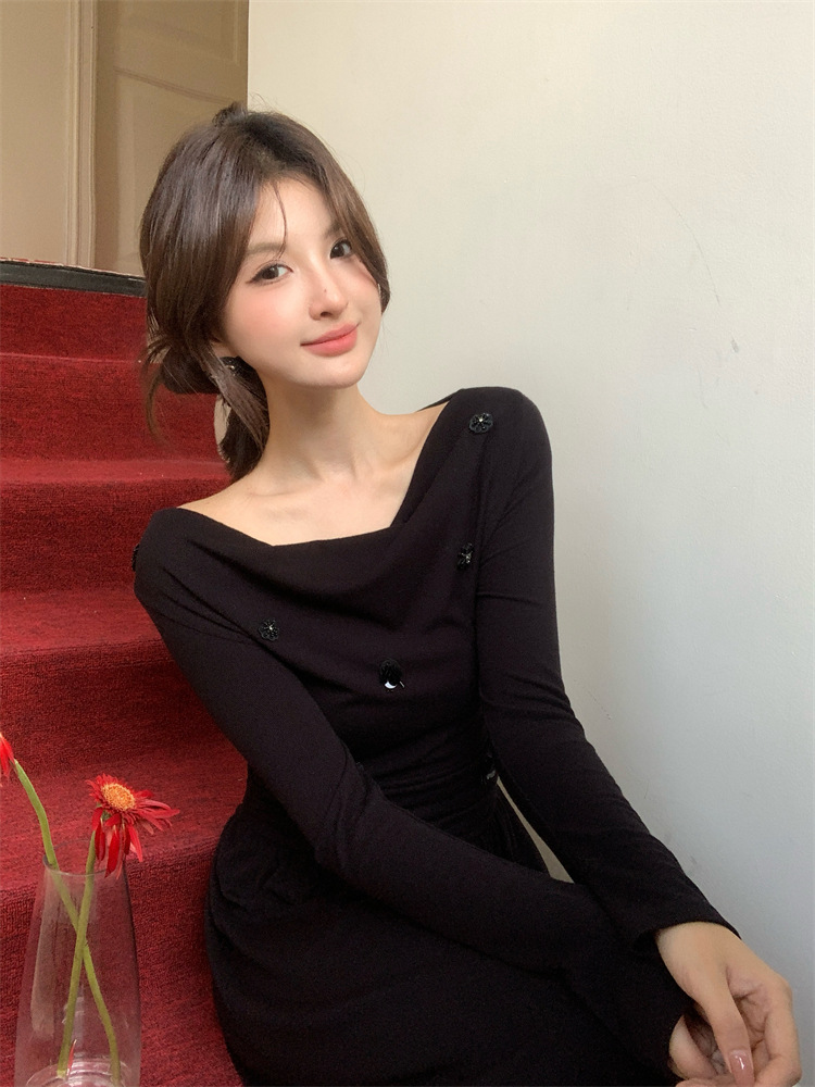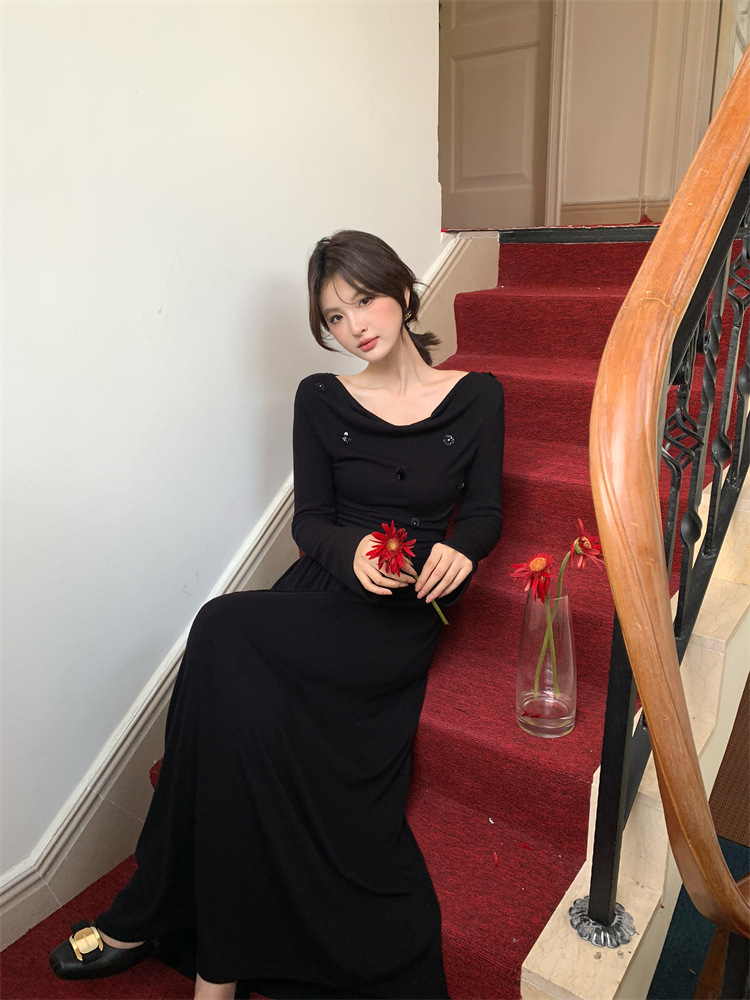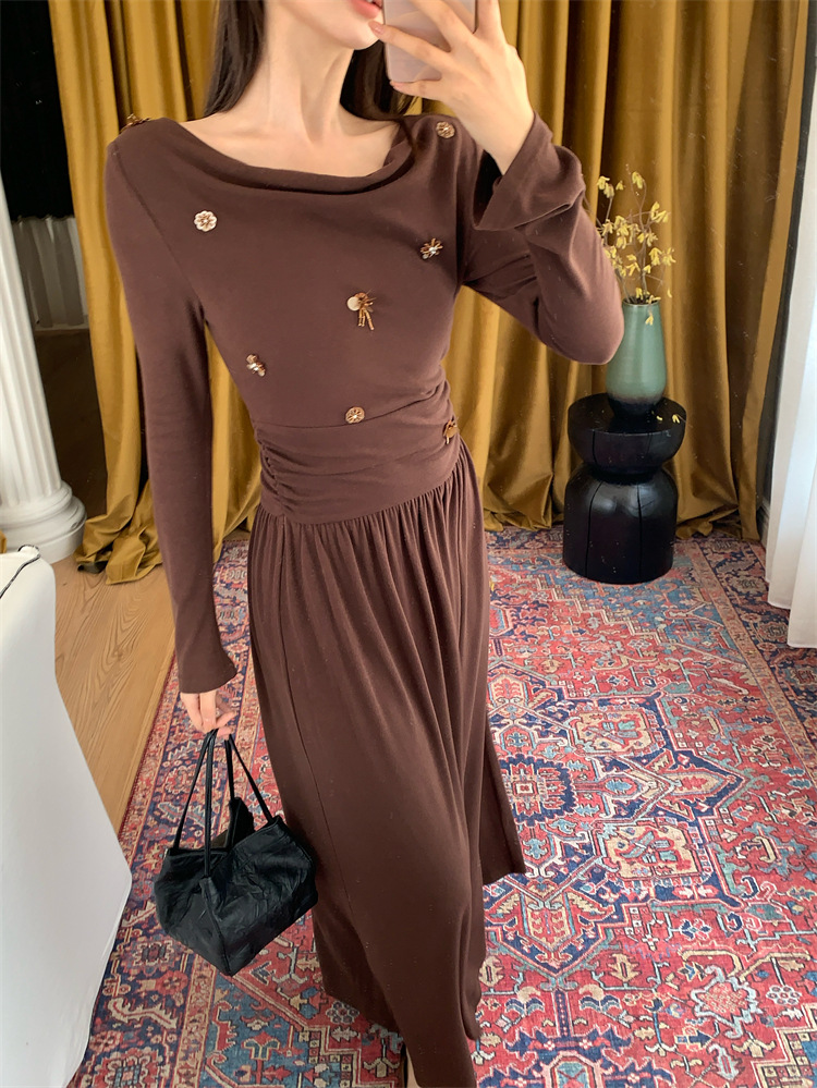 2025秋季新款气质优雅纯色一字领高腰长袖针织连衣裙88121