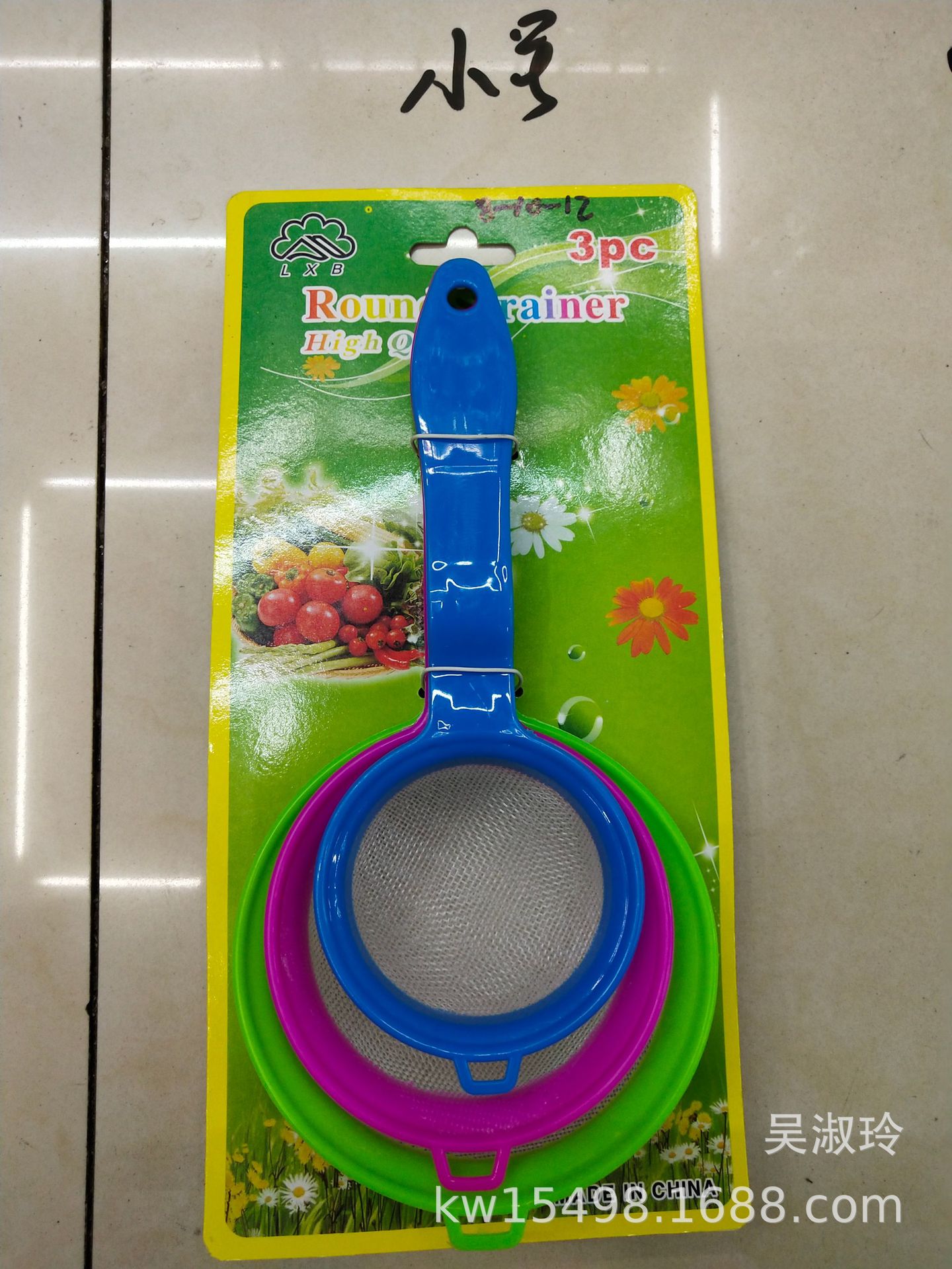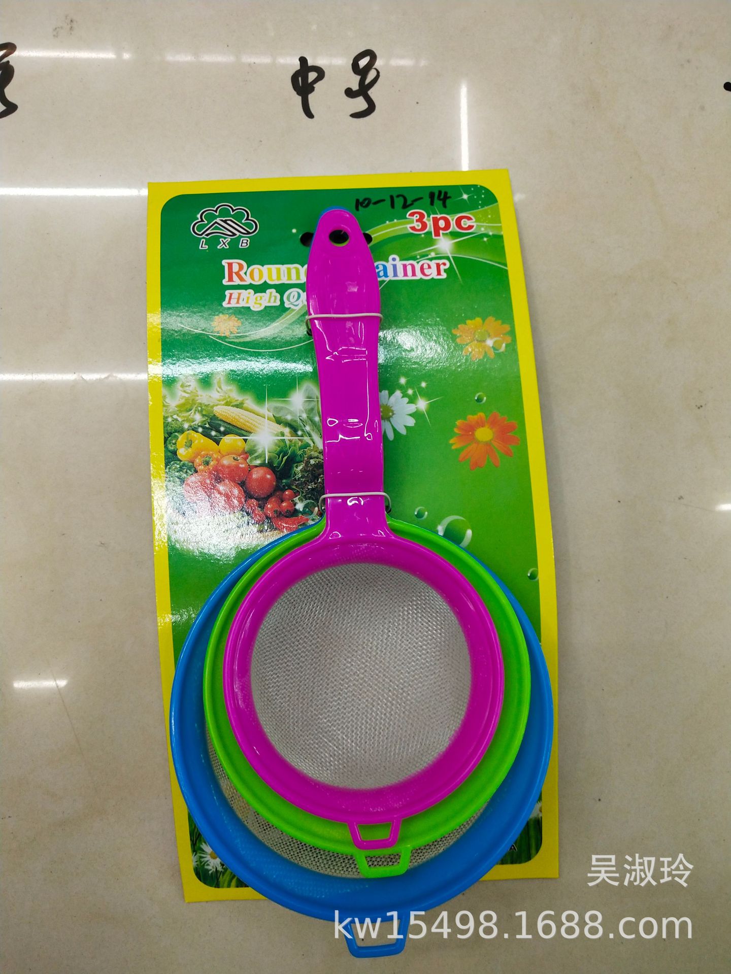 | 品名 大号塑料网漏宽边3件套 | 重量 95克一套 一件 8 KG | 颜色 混装 |
