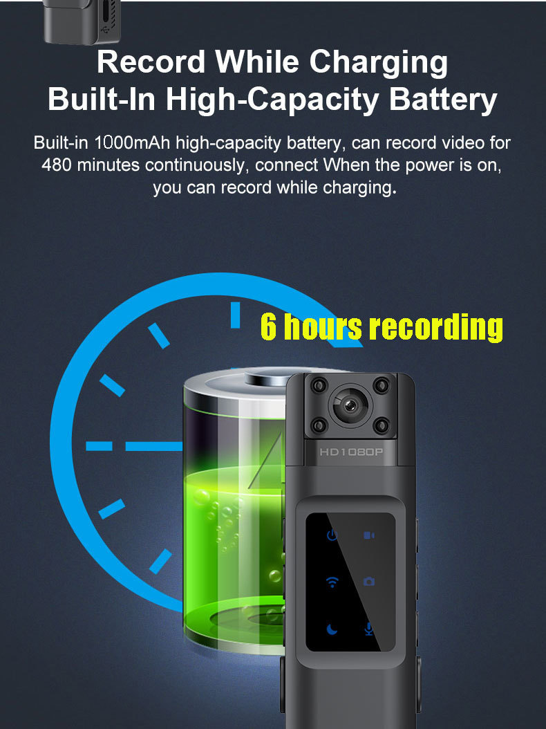 6.电池寿命:该产品内置1000mAh锂电池,视频工作时间约7小时,录音连续工作时间约8小时,电池寿命长