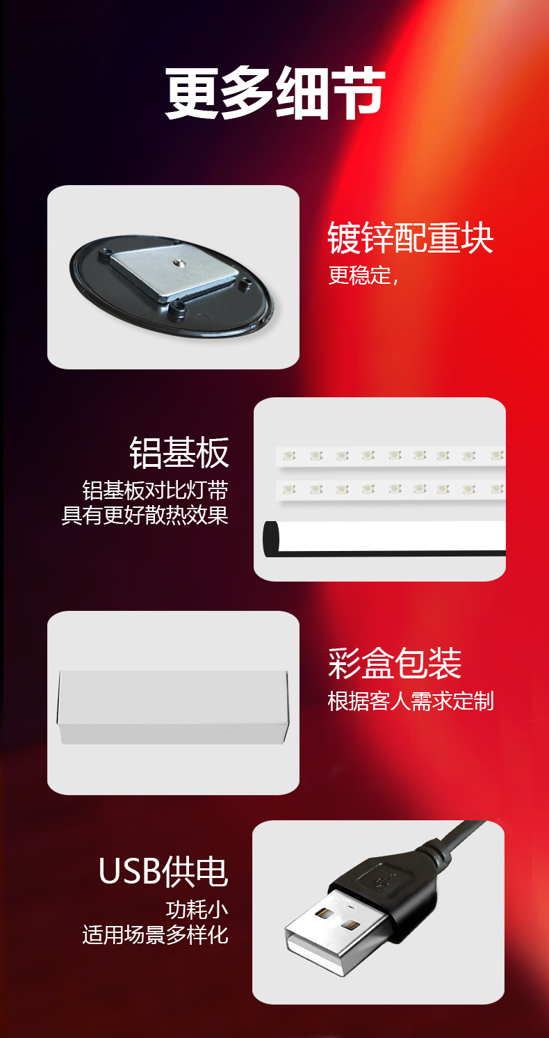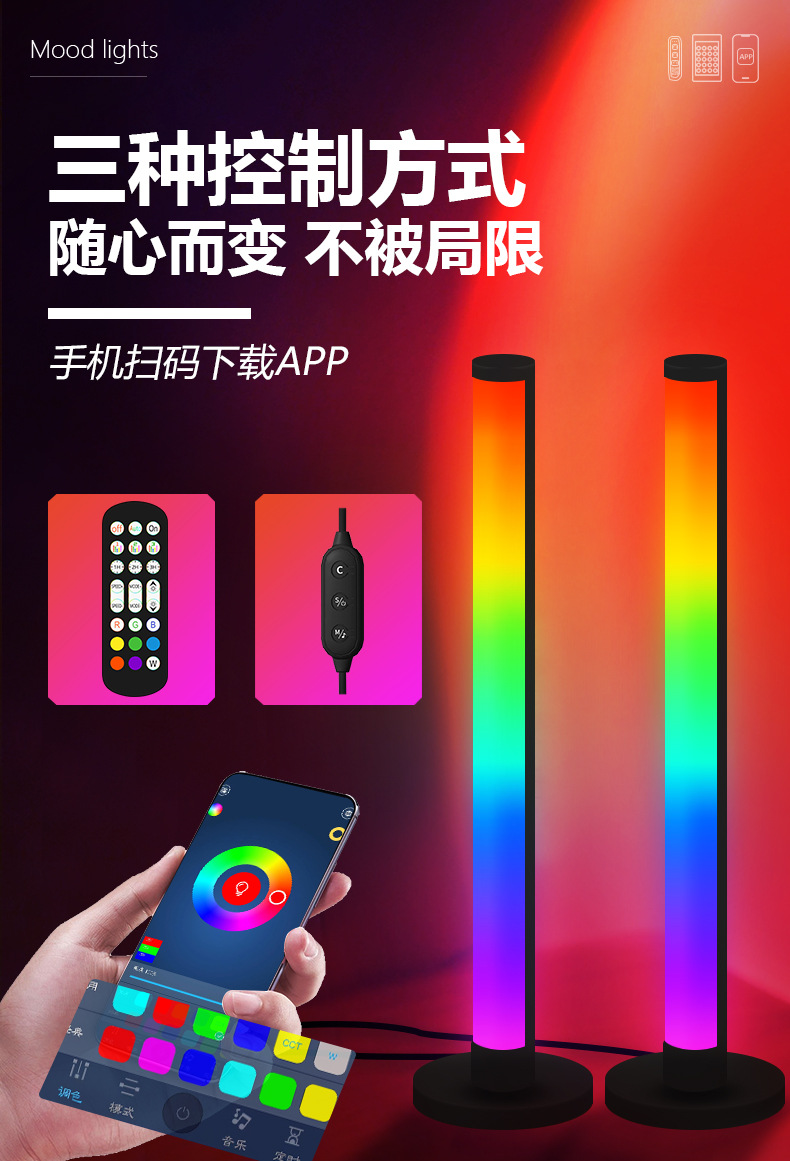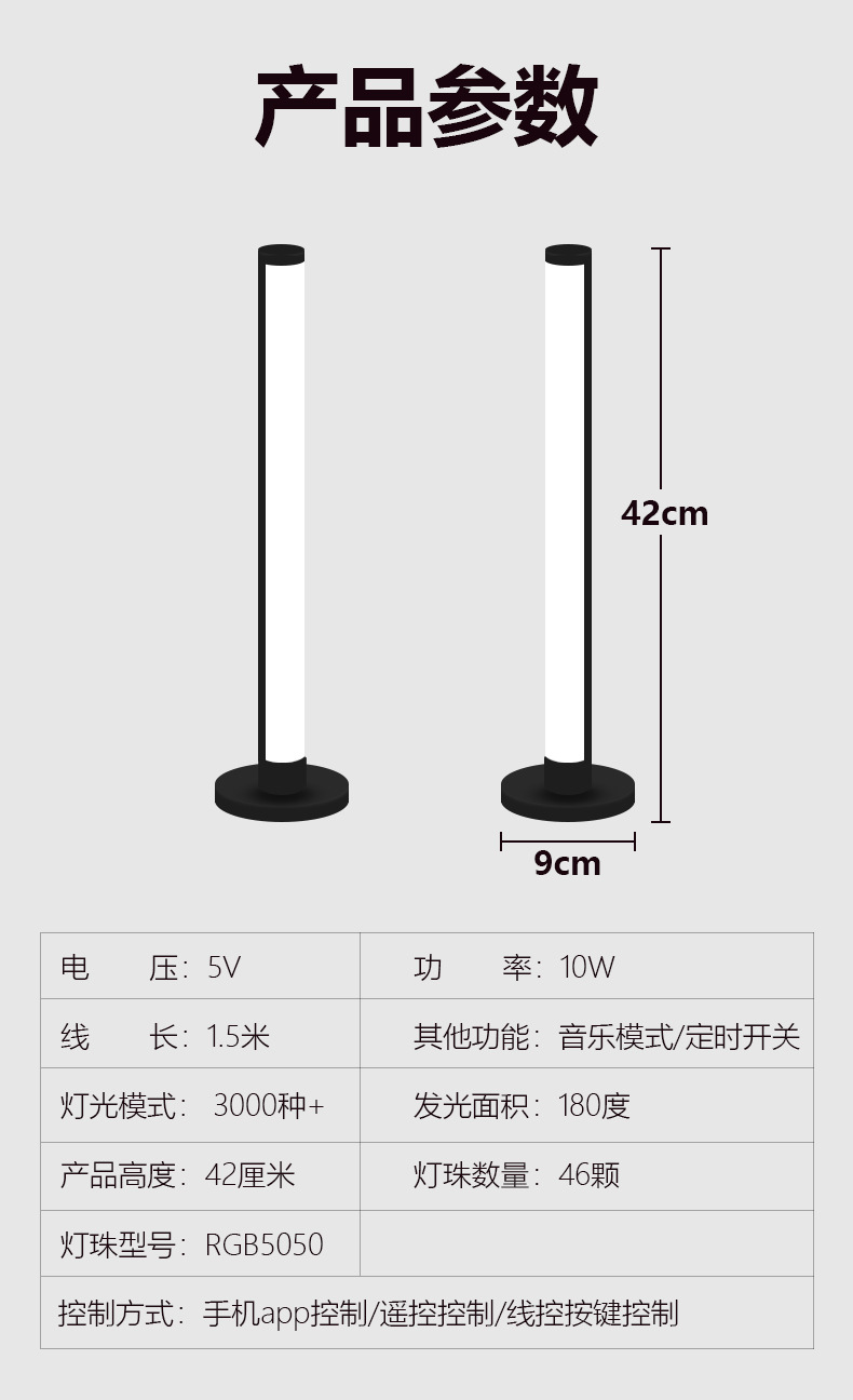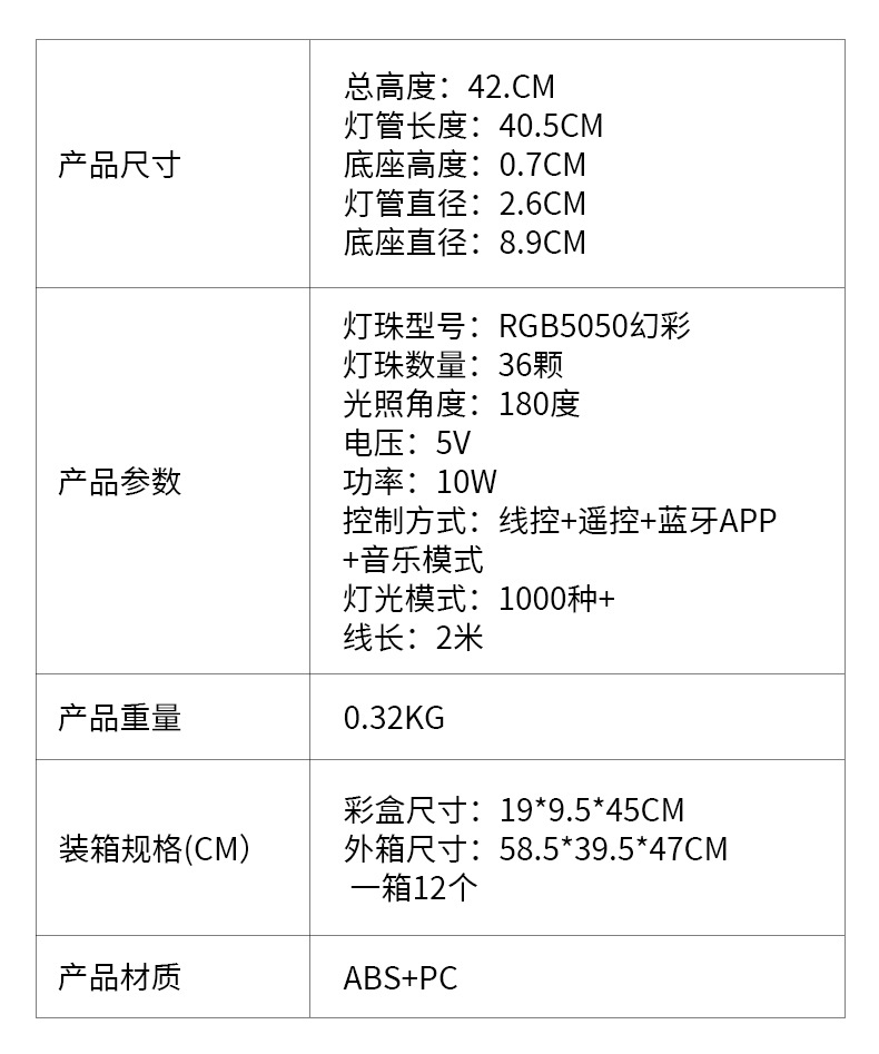 灯光颜色: RGB幻彩 光源功率: 一拖二(线控+遥控+app拾音) 供电方式: USB供电 附加功能: 手机APP控制 遥控控制 3000+色彩 是否智能操控: 其他 是否有专利: 无 是否一般纳税人: 是 安装方式: 台置,立式落地式 加工定制: 是 货号: 180度桌面双支(细管)