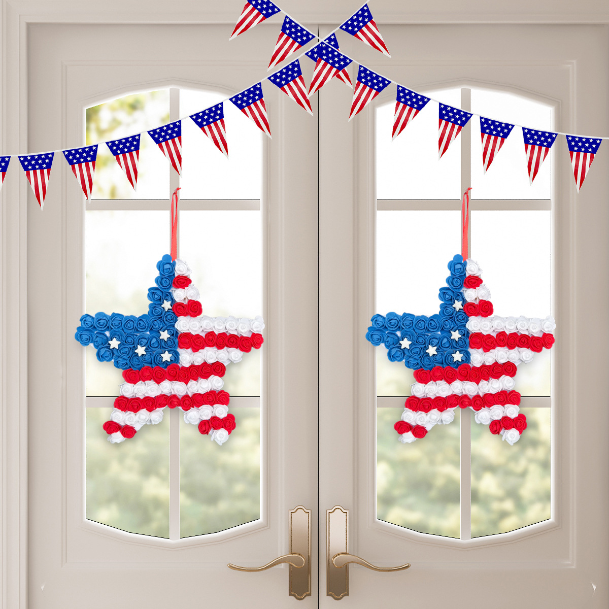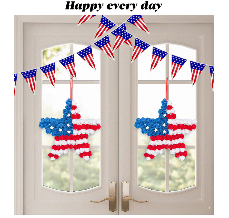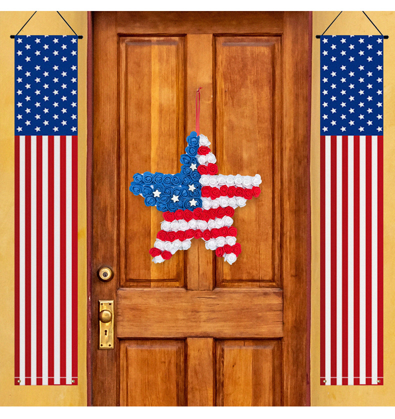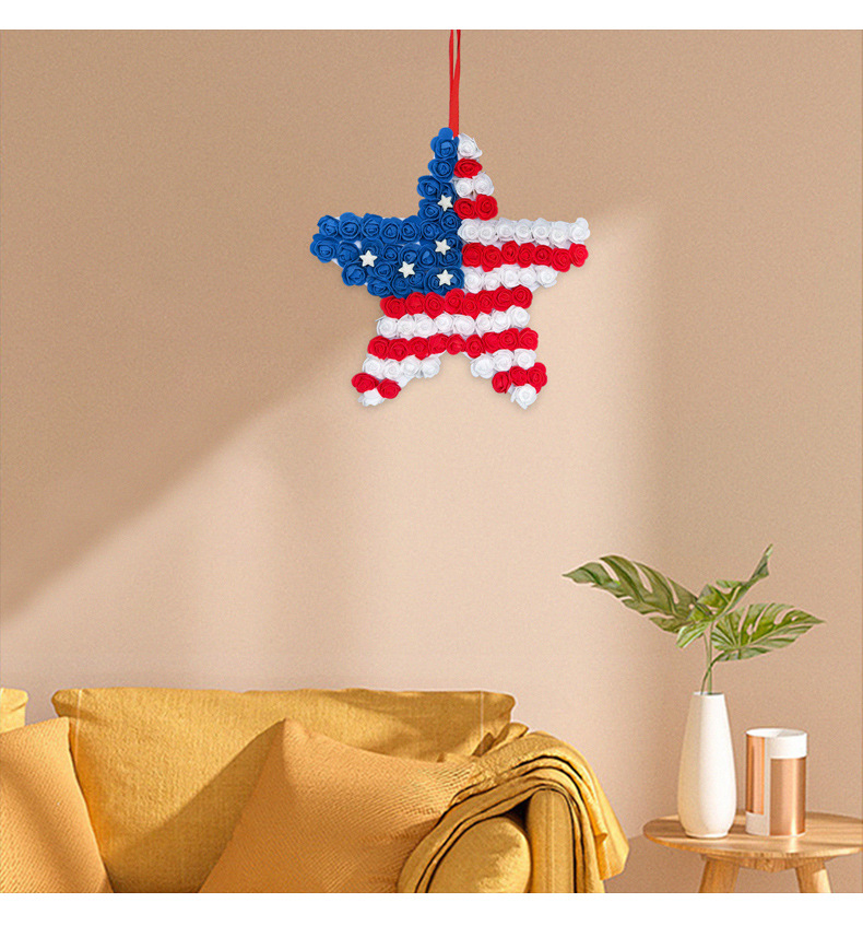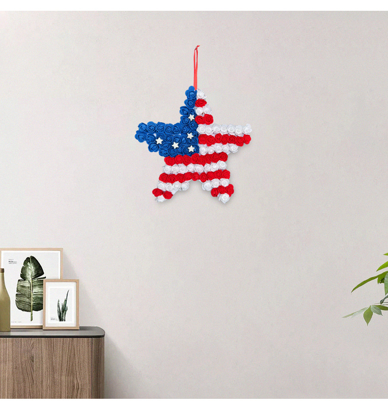 跨境美国独立日pu花五角星门挂 仿真红蓝白花环节庆庭院派对壁挂