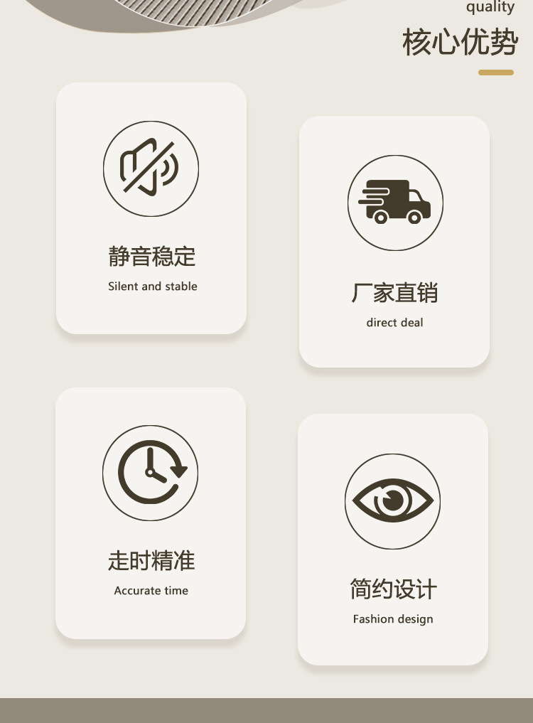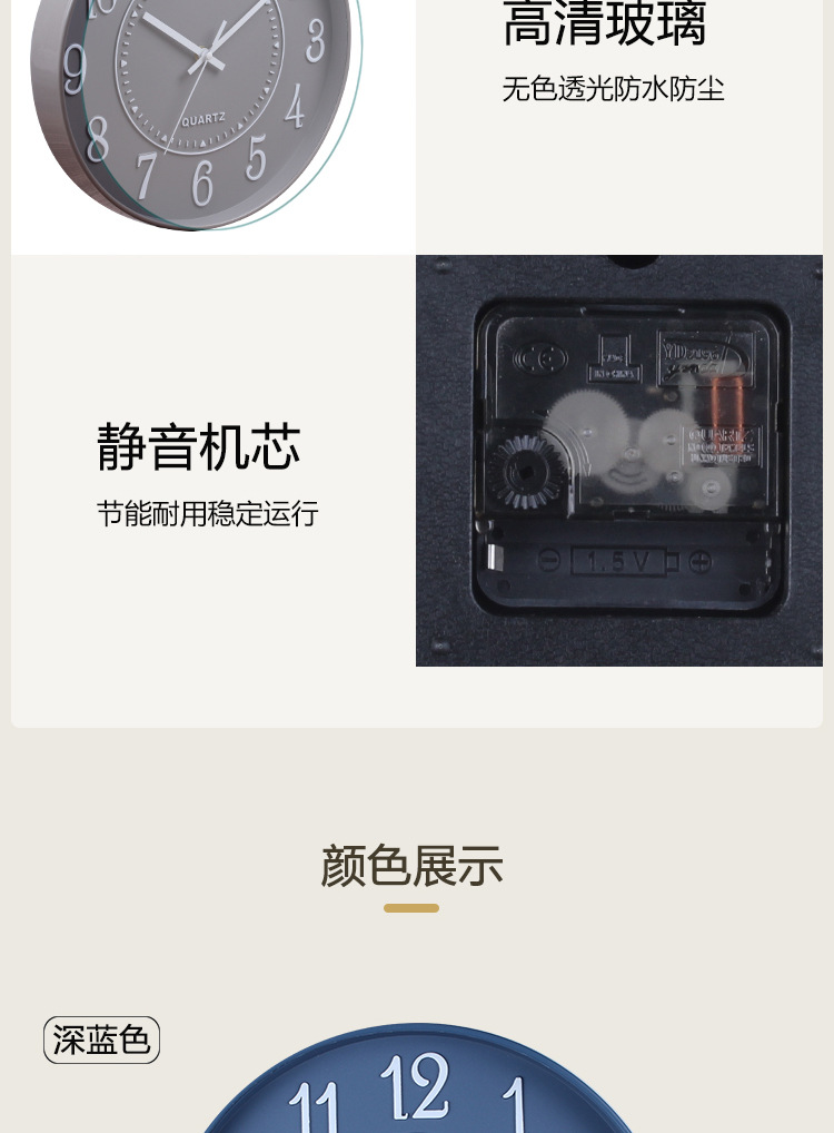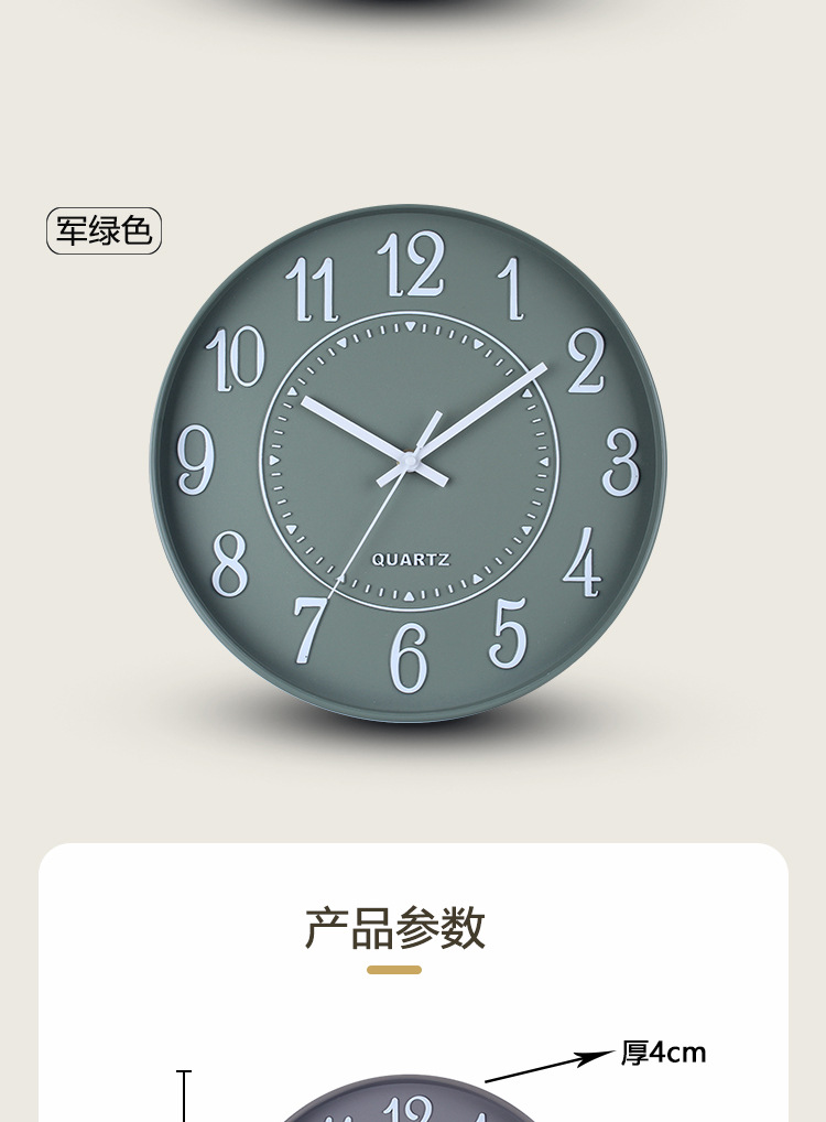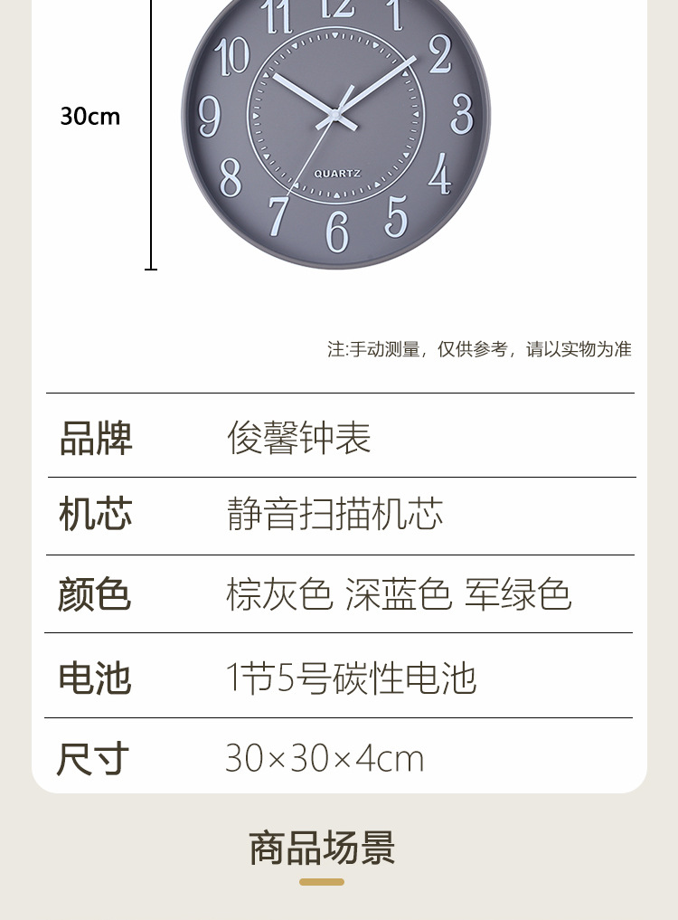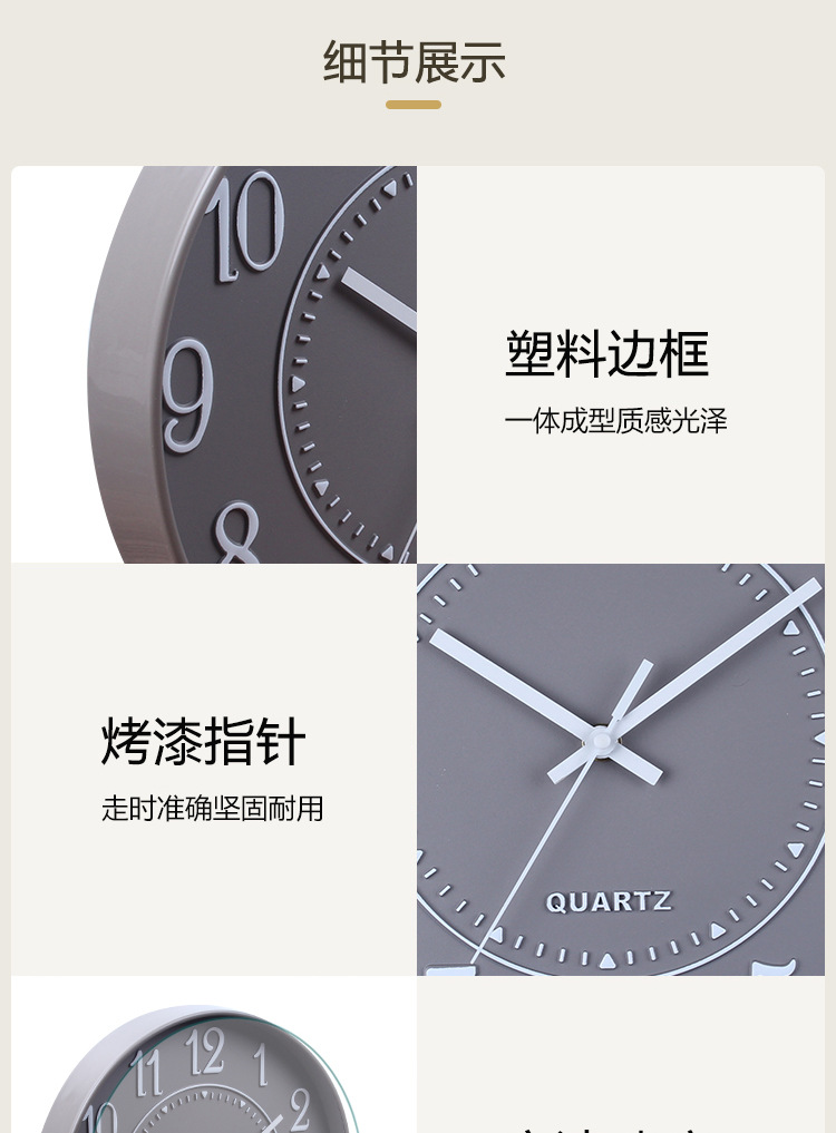 产品类别: 挂钟 品牌: 俊馨 是否进口: 否 型号: 简约42 是否专利货源: 否 加工定制: 是 加印LOGO: 可以 是否双面: 单面 风格: 现代简约 外观造型: 圆形 重量: 1.5 kg/个