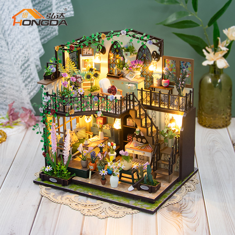 弘达diy手工小房子娃娃小屋双层花园房子别墅迷你3D建筑模型拼装
