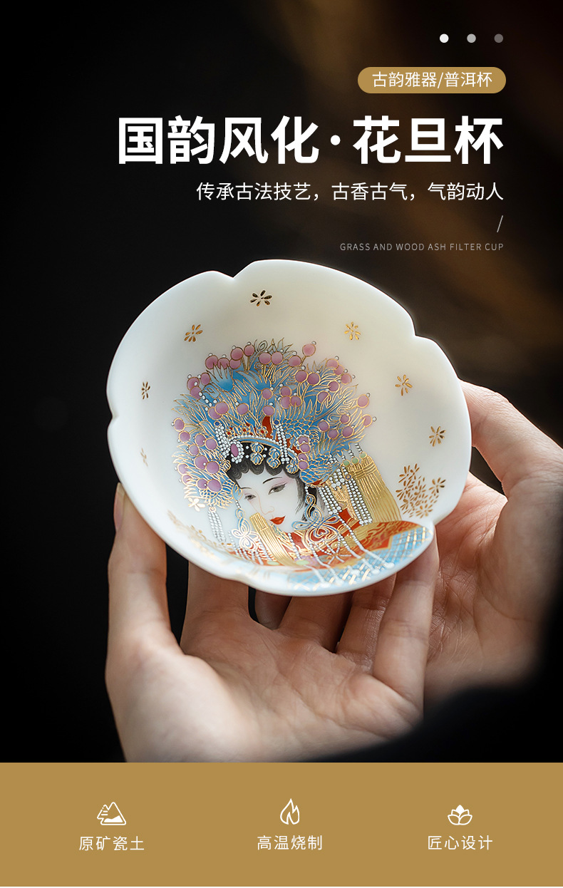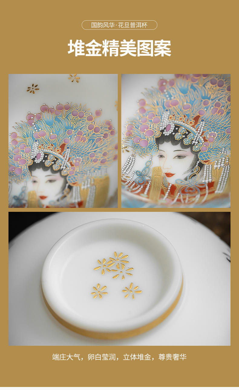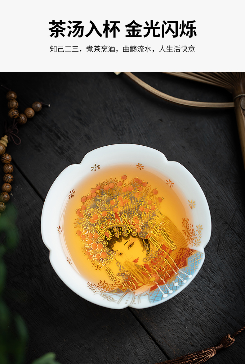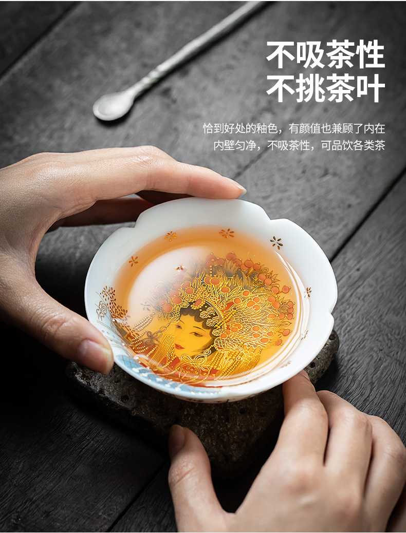 素烧羊脂玉瓷京剧花旦茶杯陶瓷花瓣普洱茶杯人物图案主人杯单杯 English | 投诉