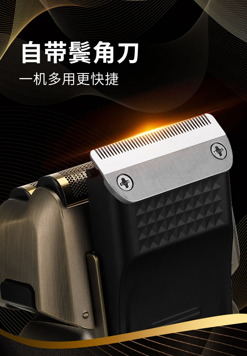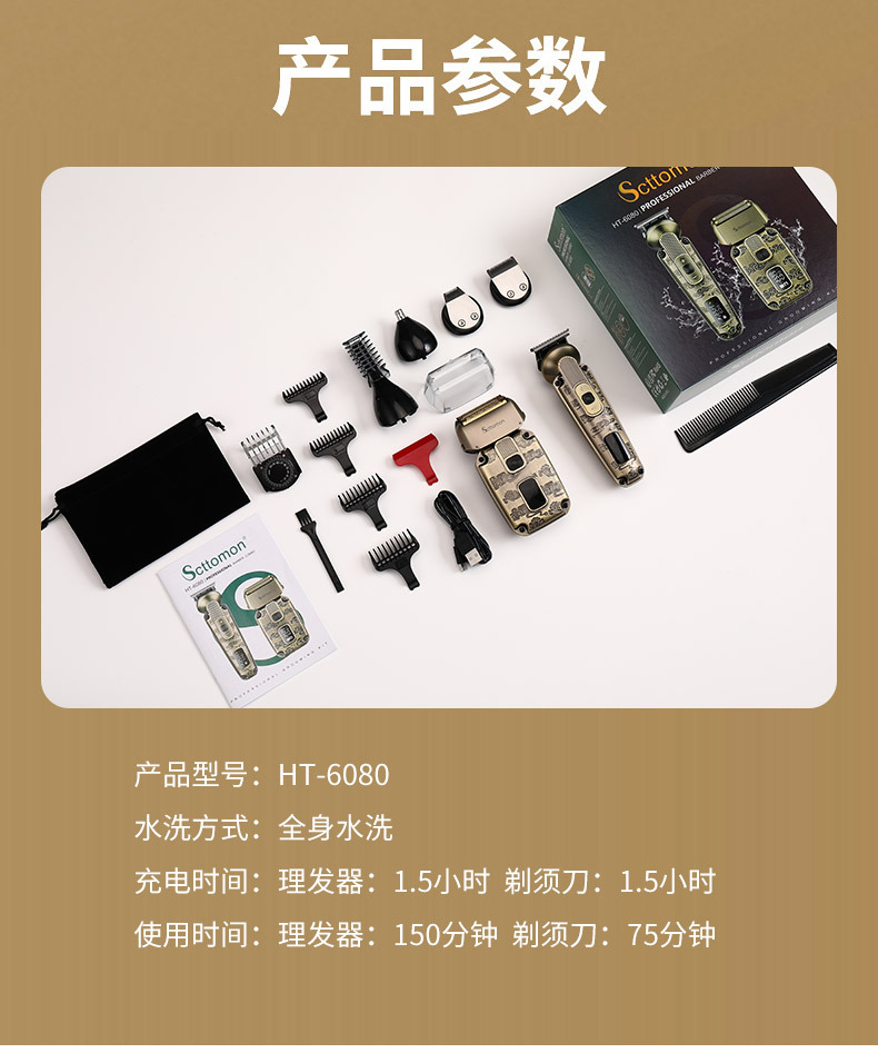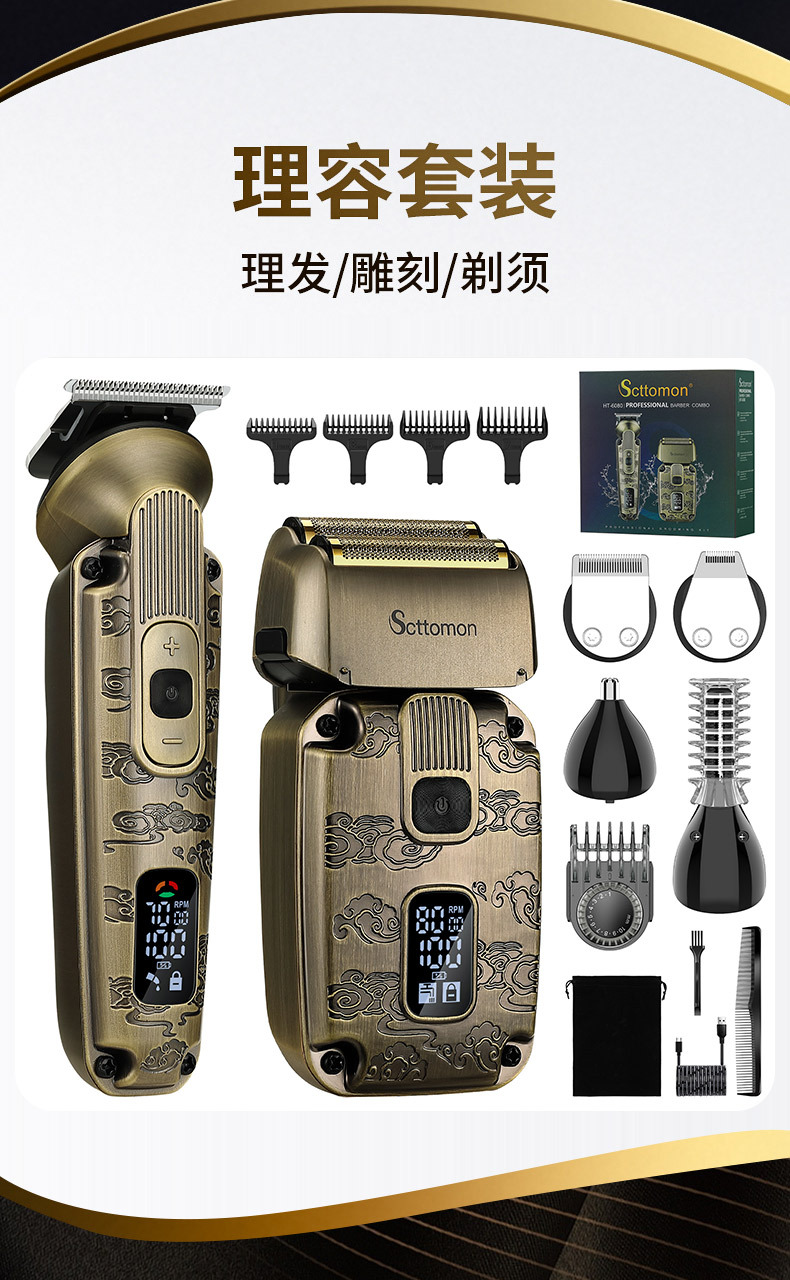 配件:理发器、雕刻刀头、U型刀头、剃须刀、鼻毛刀头、修眉剃毛刀头、收纳袋、清洁刷、润滑油、理发梳、多国说明书