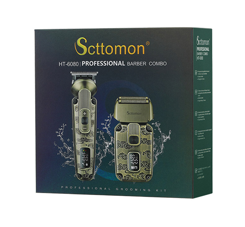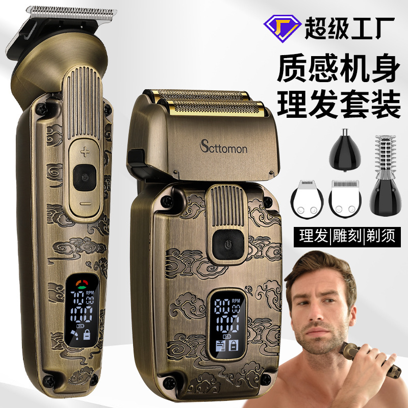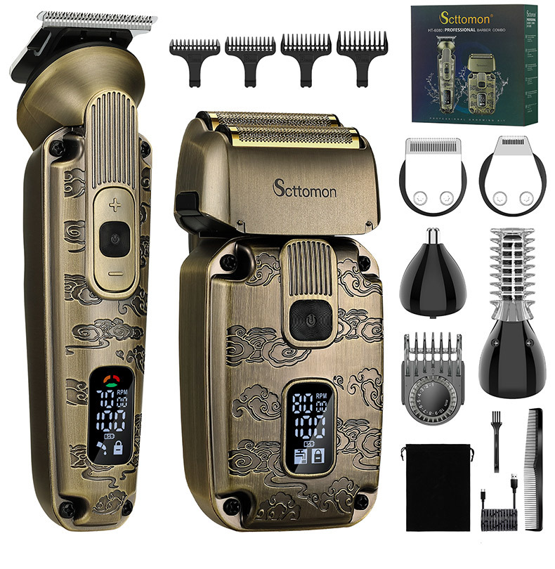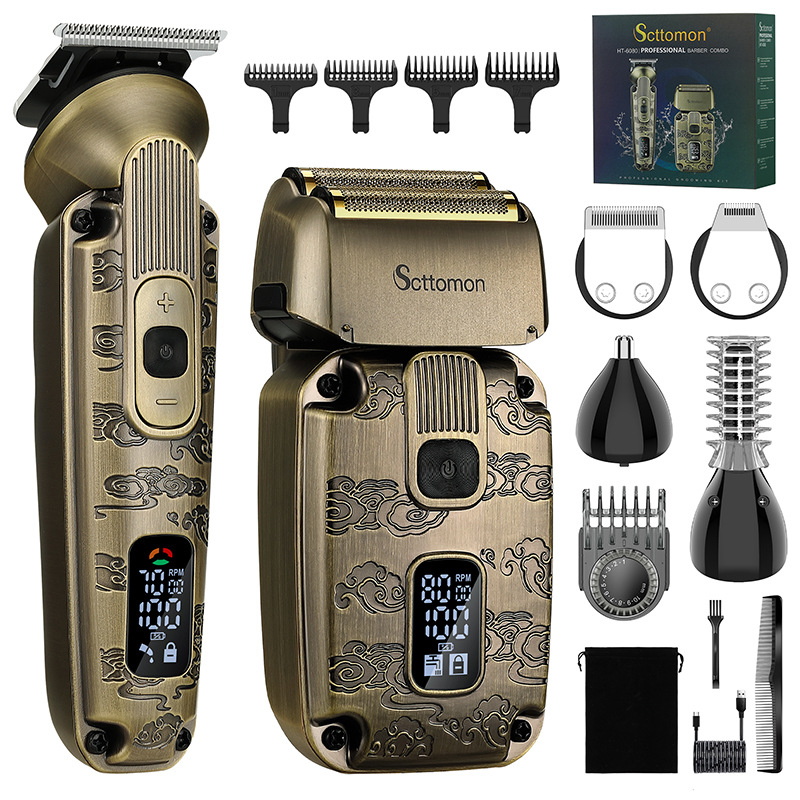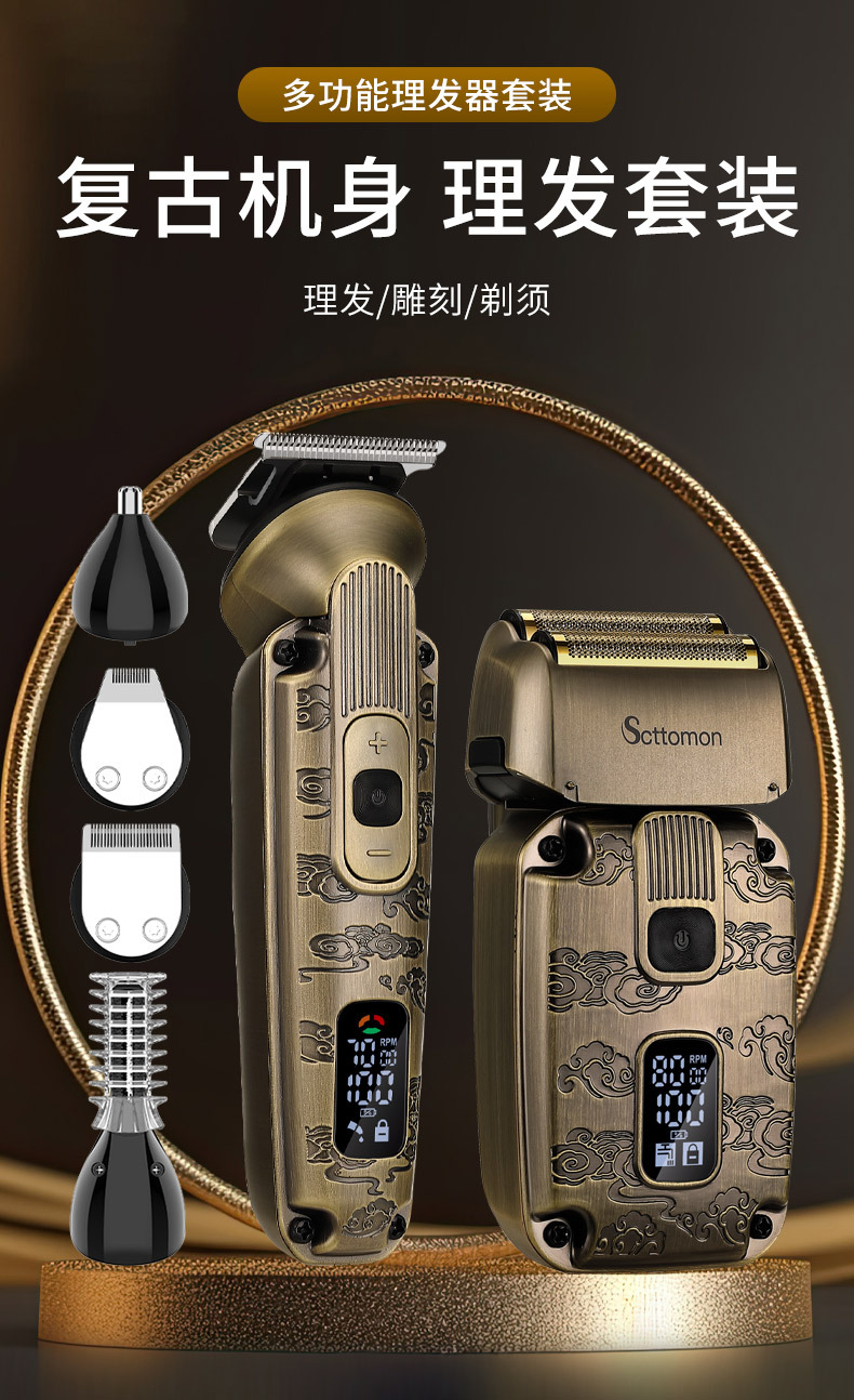 配件:理发器、雕刻刀头、U型刀头、剃须刀、鼻毛刀头、修眉剃毛刀头、收纳袋、清洁刷、润滑油、理发梳、多国说明书