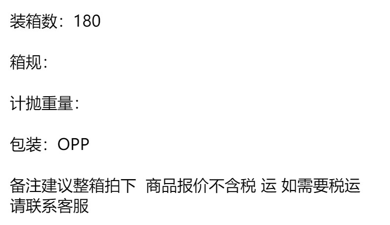 1: 1 1: 1 1: 1 1: 1 1: 1 重量: 0.12 kg/个 装箱信息:长宽高:1X1X1cm 装箱重量: 1KG 装箱数量:1pcs
