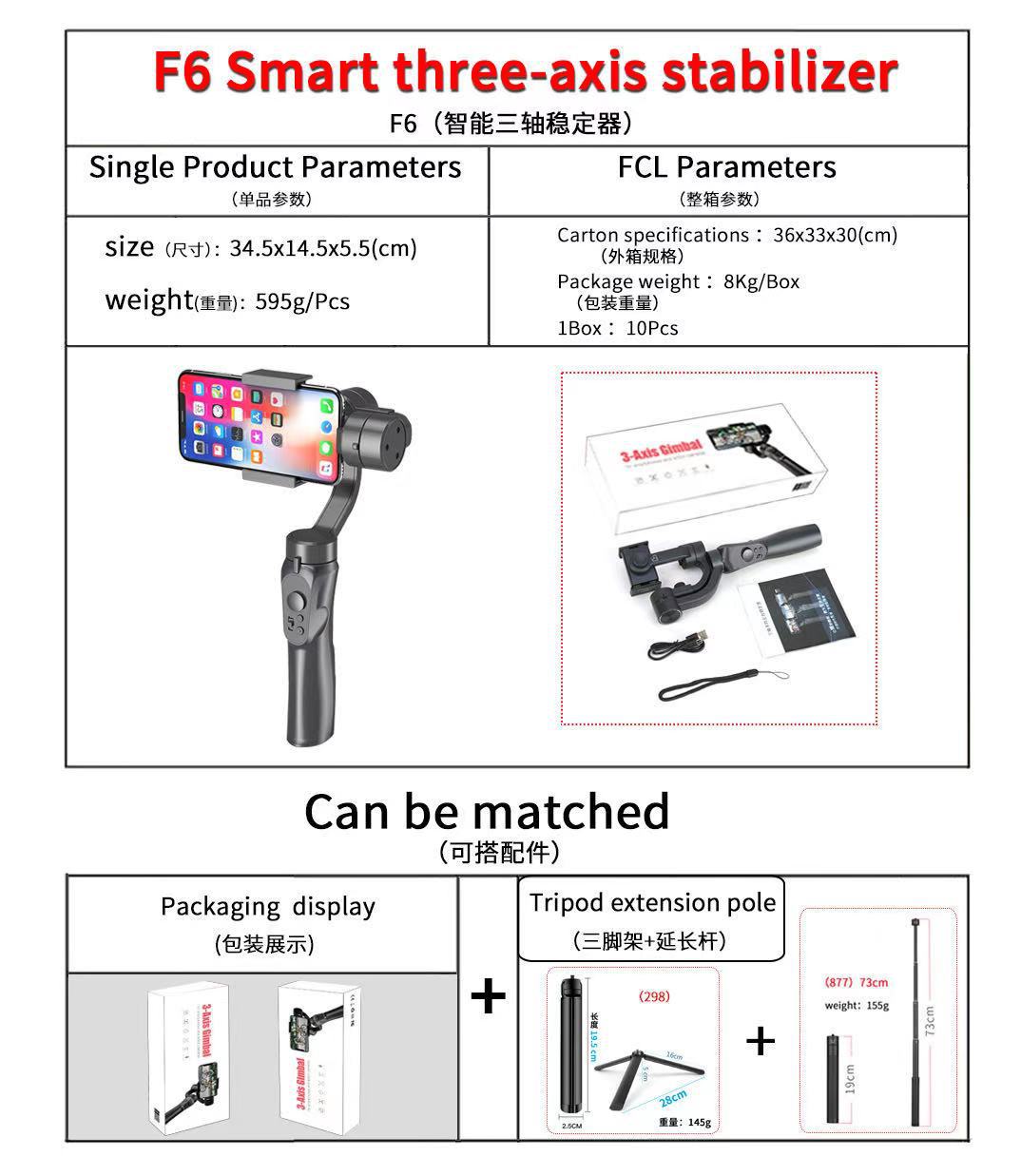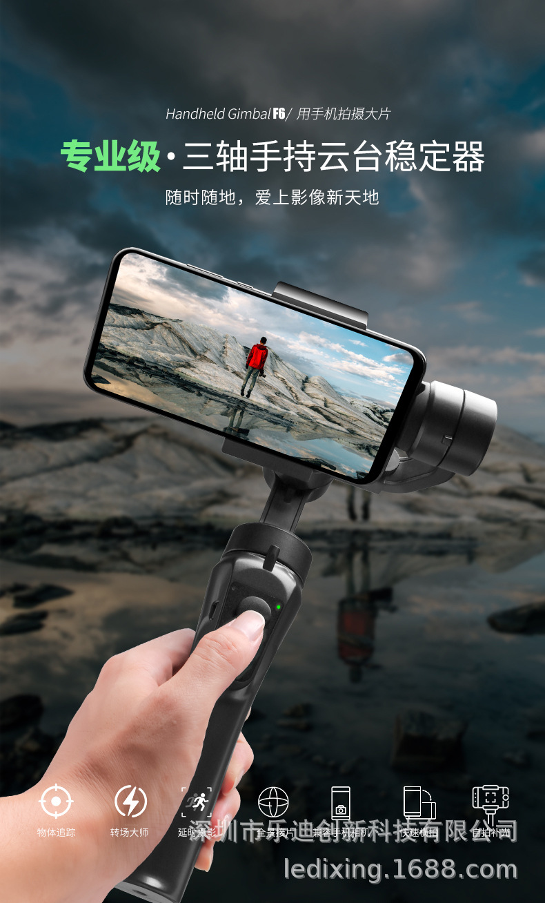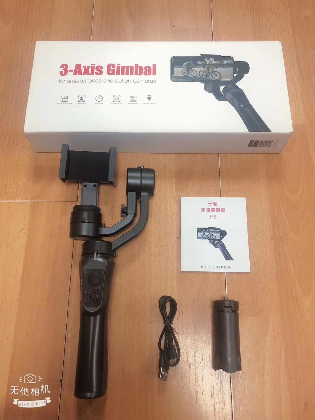 安装方式: 卡扣式 货号: F6手机稳定器 材质: 外壳ABS 垂直旋转角度: 325 垂直转速: 320 品牌: 乐迪创新 使用环境: 户外,室内 适用机型: 市面上屏幕手机,运动相机 水平旋转角度: 325 水平转速: 150°/s