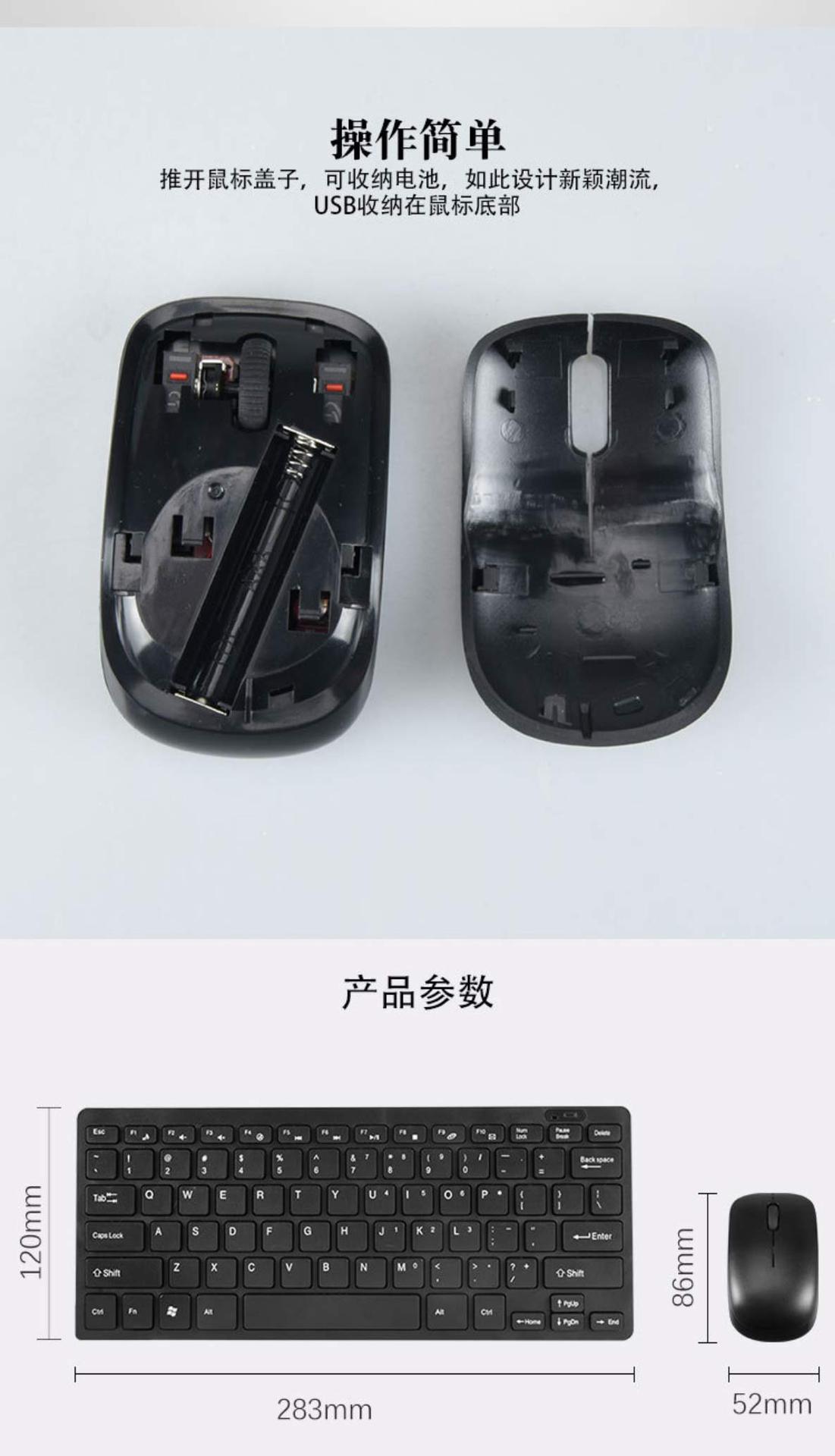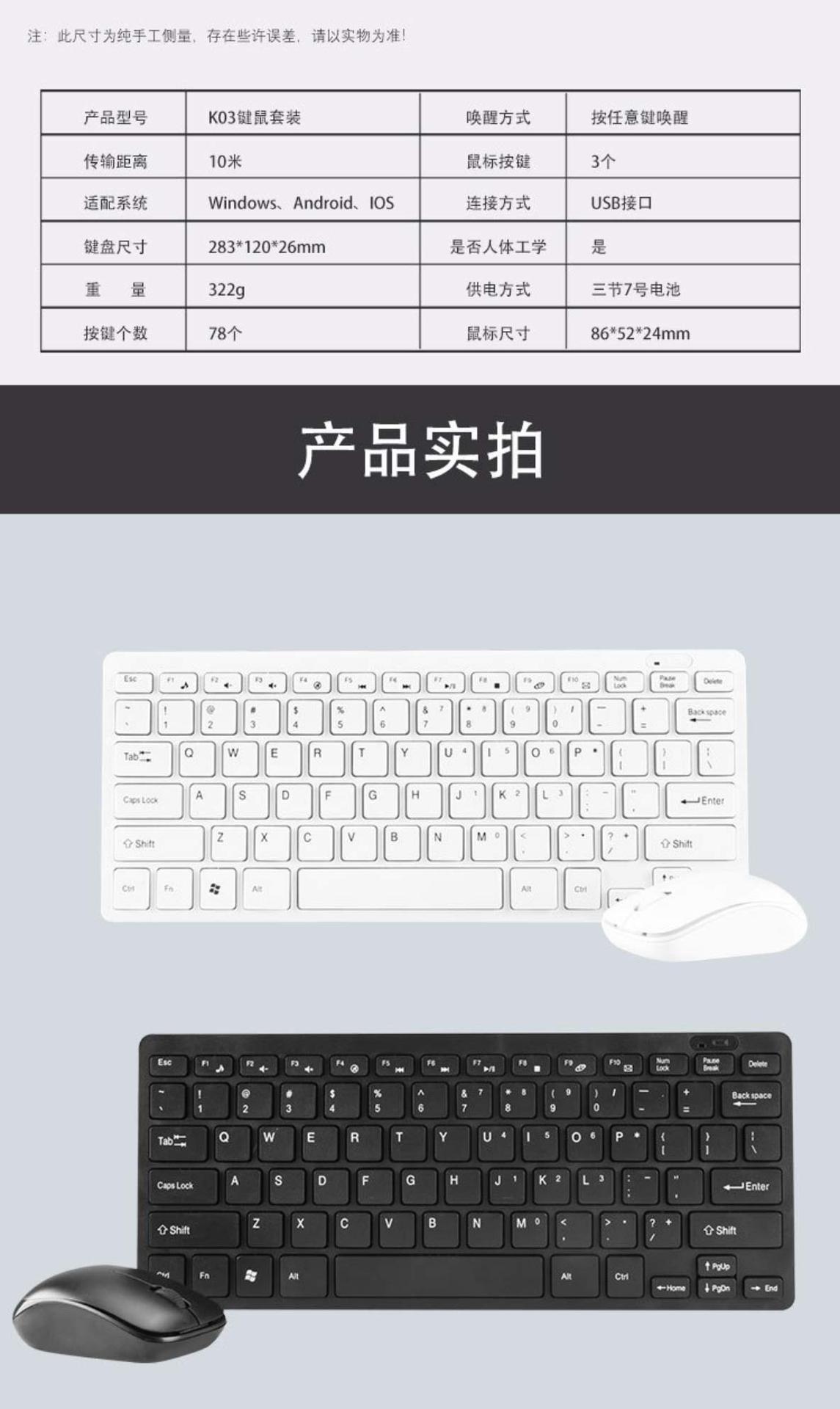 按键数: 87 货号: 03 产品尺寸: 键盘283*120*26mm鼠标86*5 工作方式: 2.4g 光学分辨率: 800-1200-1600 加印LOGO: 支持 类型: 无线键盘鼠标 品牌: 中性 适用对象: 商务办公 线长: 0m 重量: 0.7 kg/套