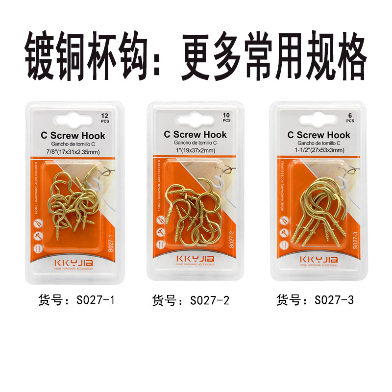 卡卡五金S027-2/镀铜杯钩1.0 ″吸塑卡装小五金百货仓储现货供应