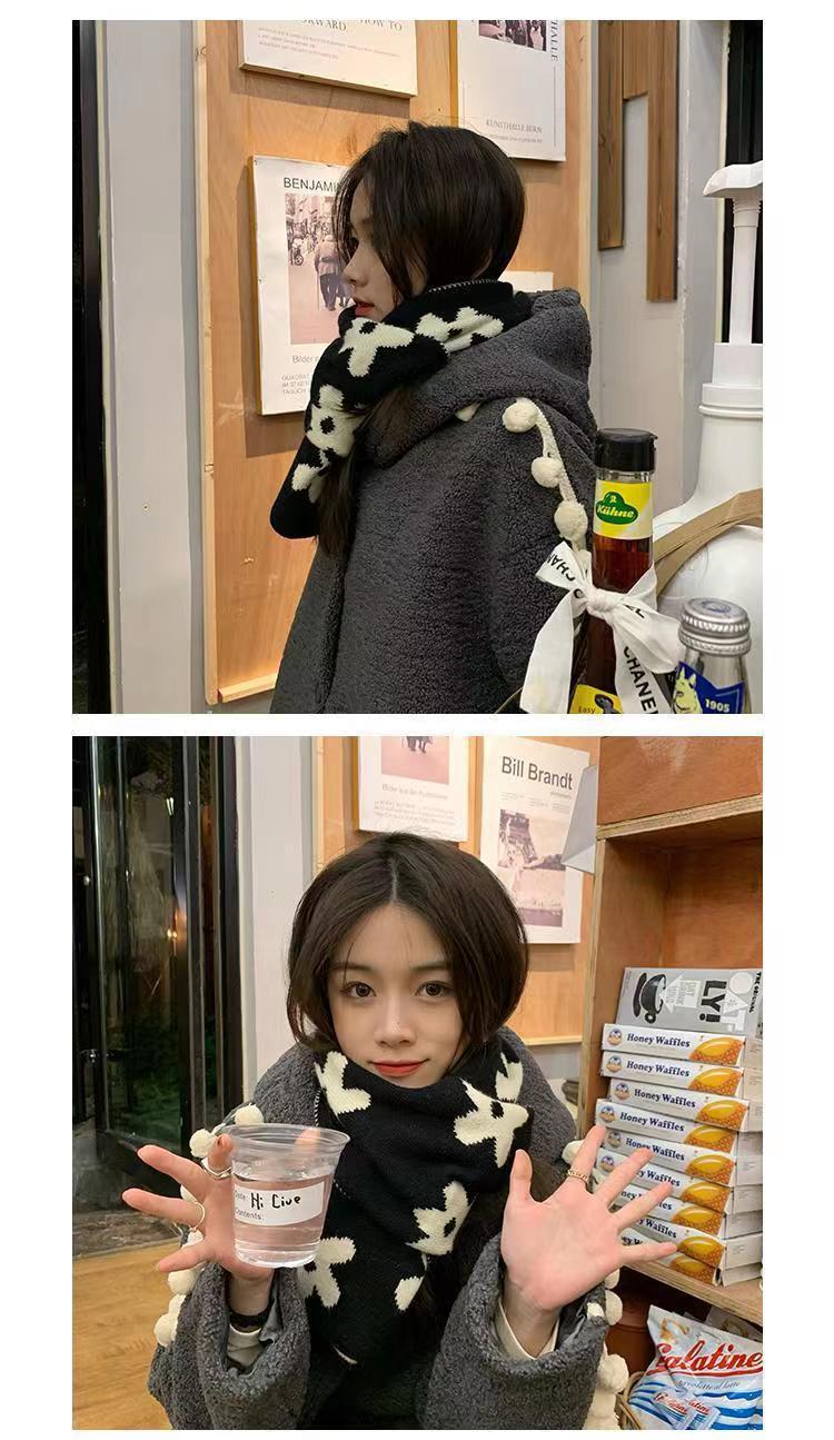 秋冬新款小花图案仿羊绒围巾女冬季韩版针织围巾日系保暖加厚围脖