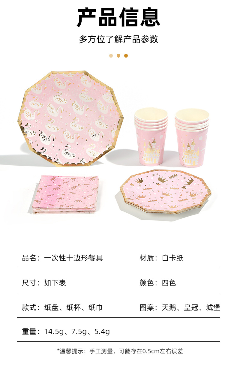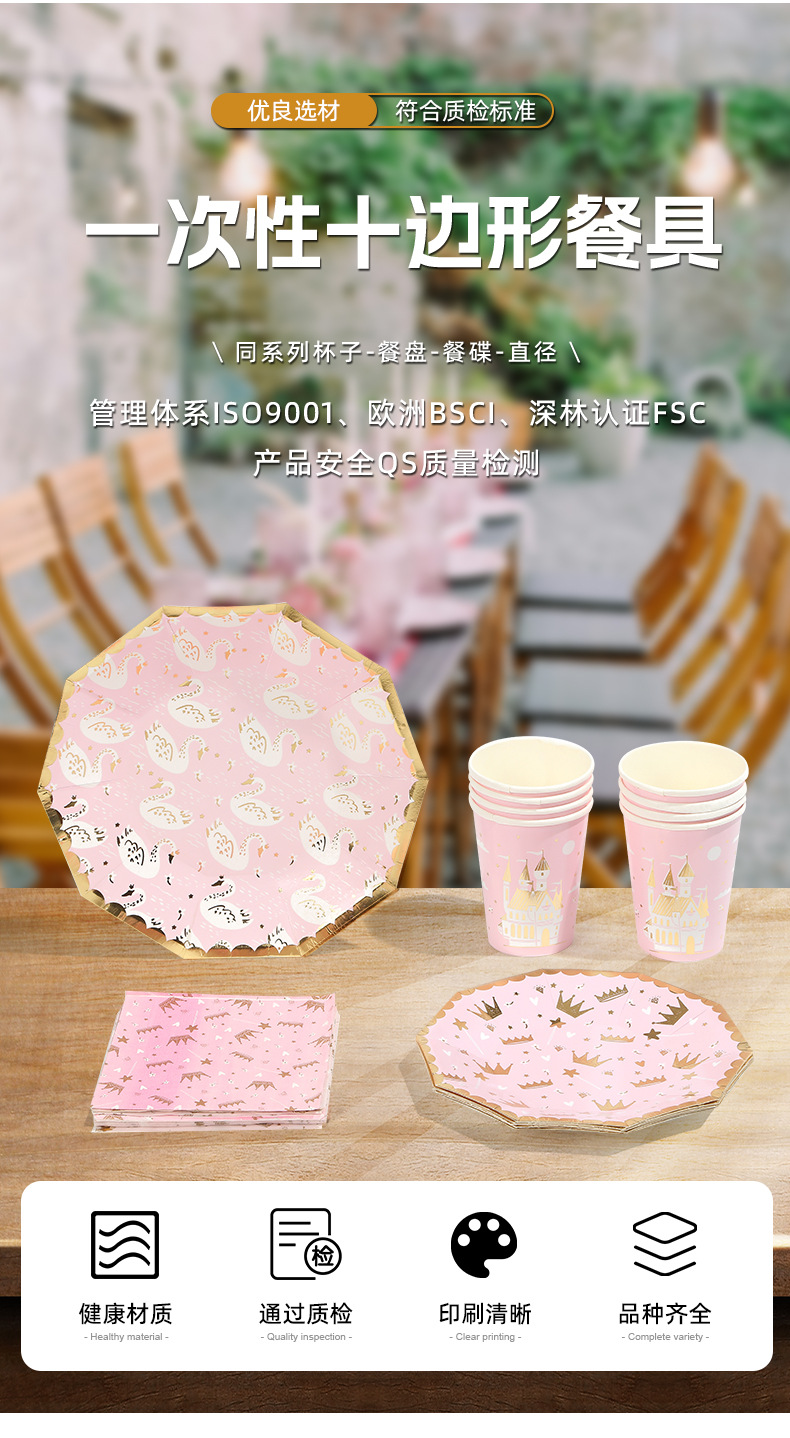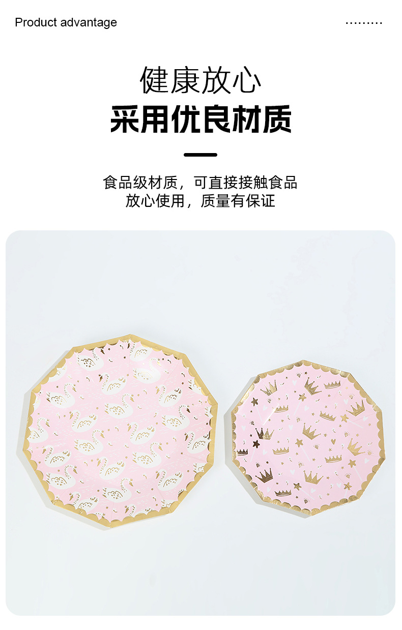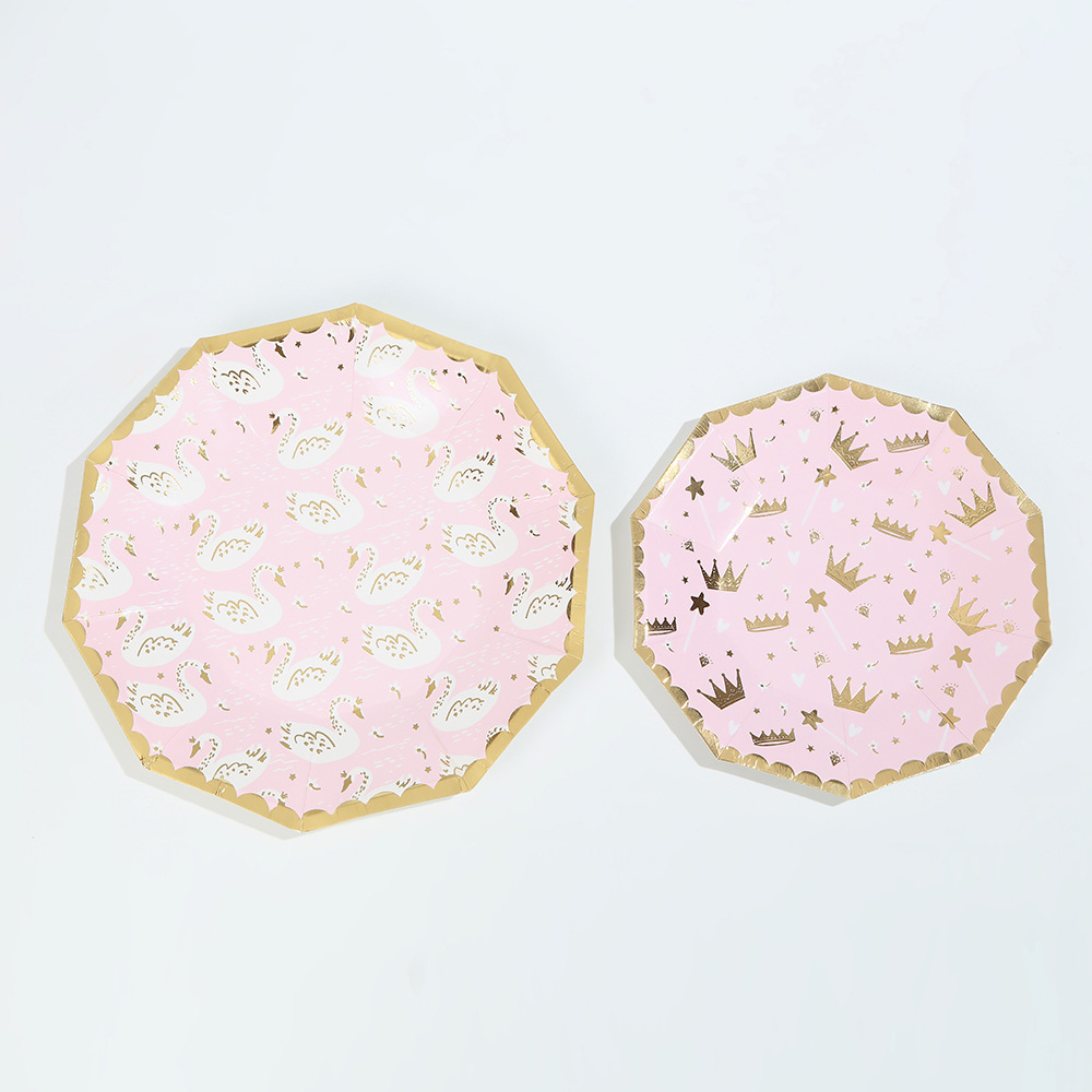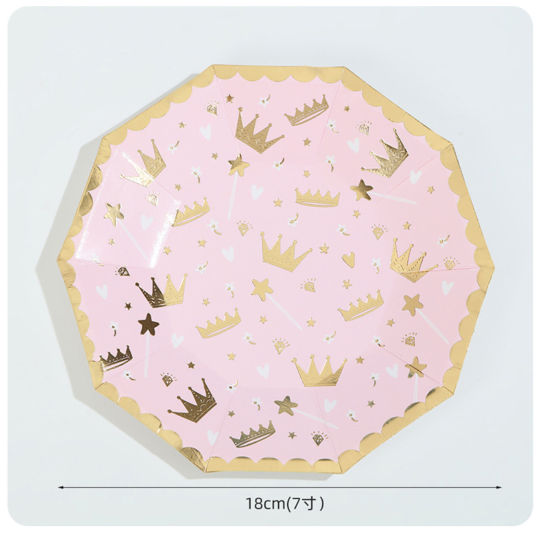 亚马逊十边形粉色城堡皇冠纸盘派对餐具生日蛋糕盘一次性纸碟套装