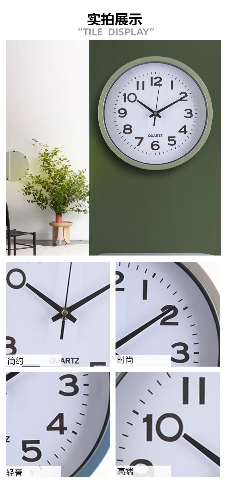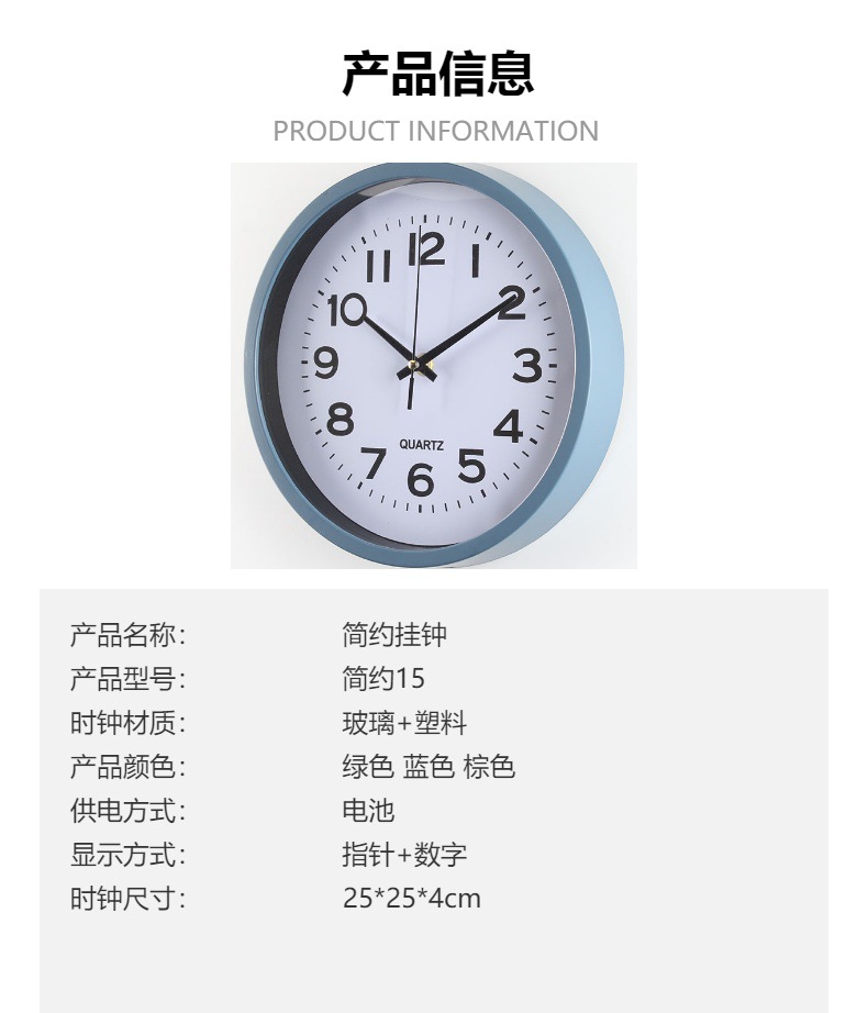 产品类别: 挂钟 品牌: 俊馨 是否进口: 否 型号: 简约15 是否专利货源: 否 加工定制: 是 加印LOGO: 可以 是否双面: 单面 风格: 现代简约 外观造型: 圆形 重量: 1.5 kg/个