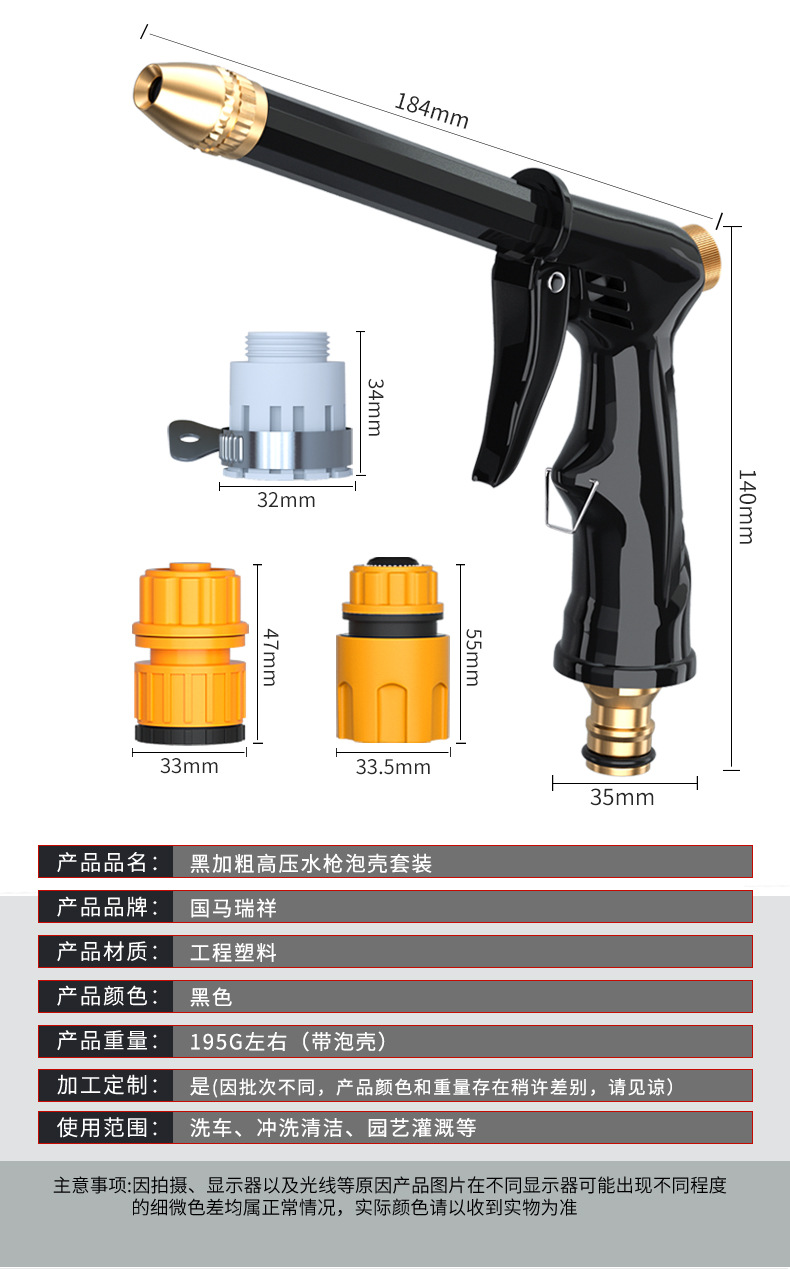 品牌: 国马瑞祥 水枪尺寸: 184*35*140 喷射距离: 10 单枪重量: 195 枪头材质: 合金 把手材质: 塑料 水压: 自来水水压 重量: 1.0 kg/套