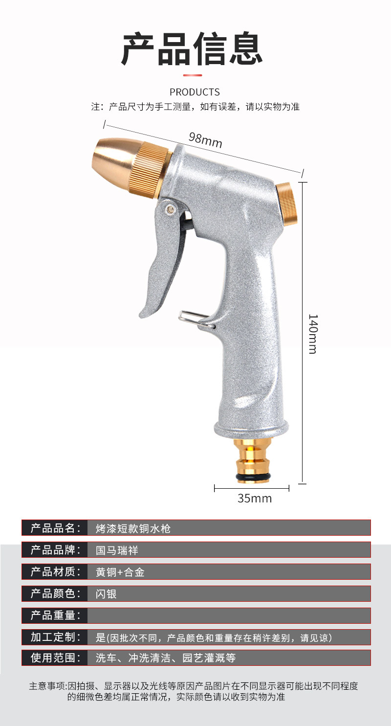 品牌: 国马瑞祥 喷射距离: 10-20 单枪重量: 咨询 枪头材质: 铜 适用范围: 洗车浇花 把手材质: 合金 水压: 5 外形尺寸: 15X15 长度: 0.15 重量: 1.0 kg/把