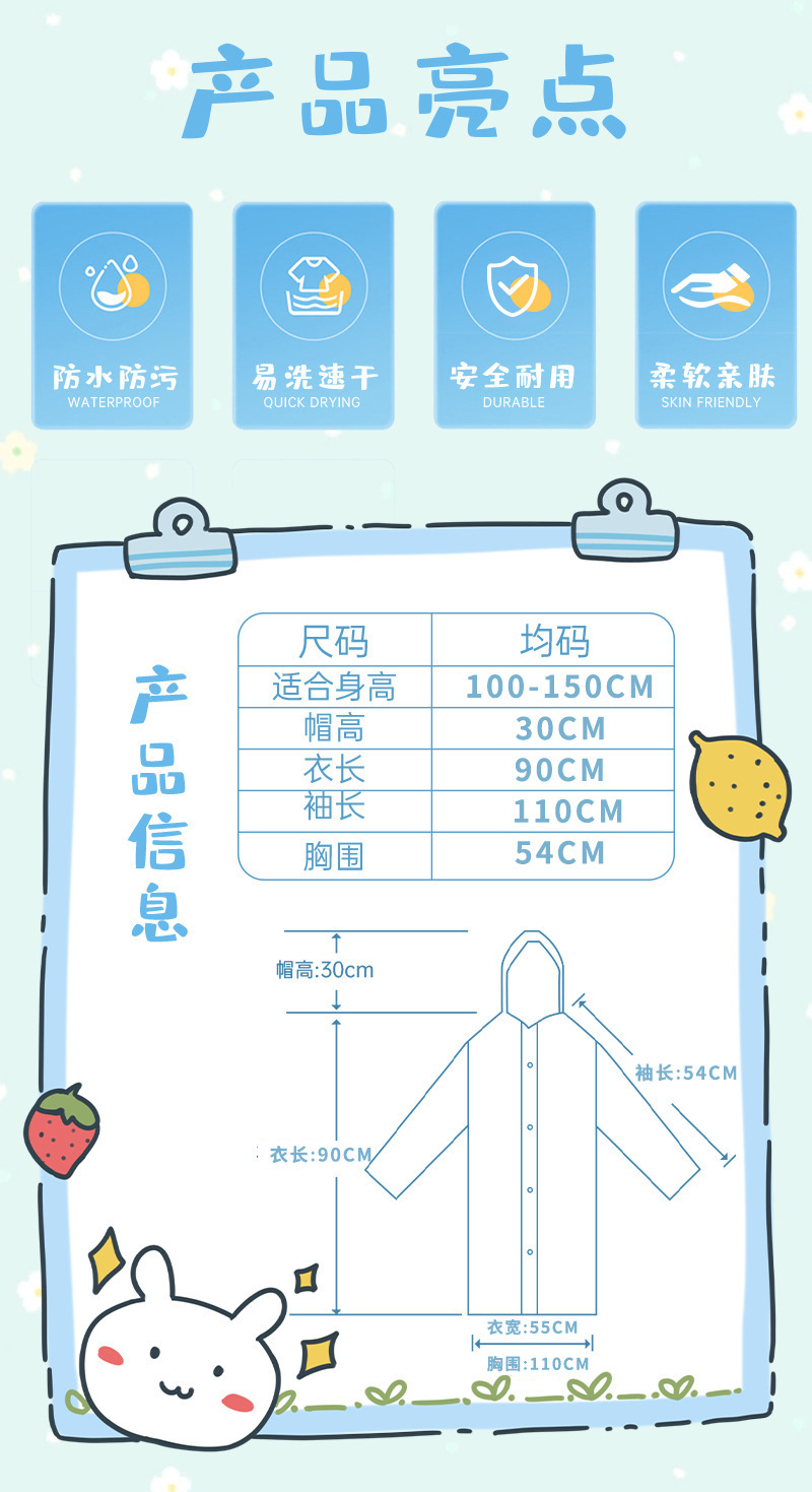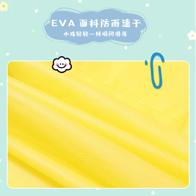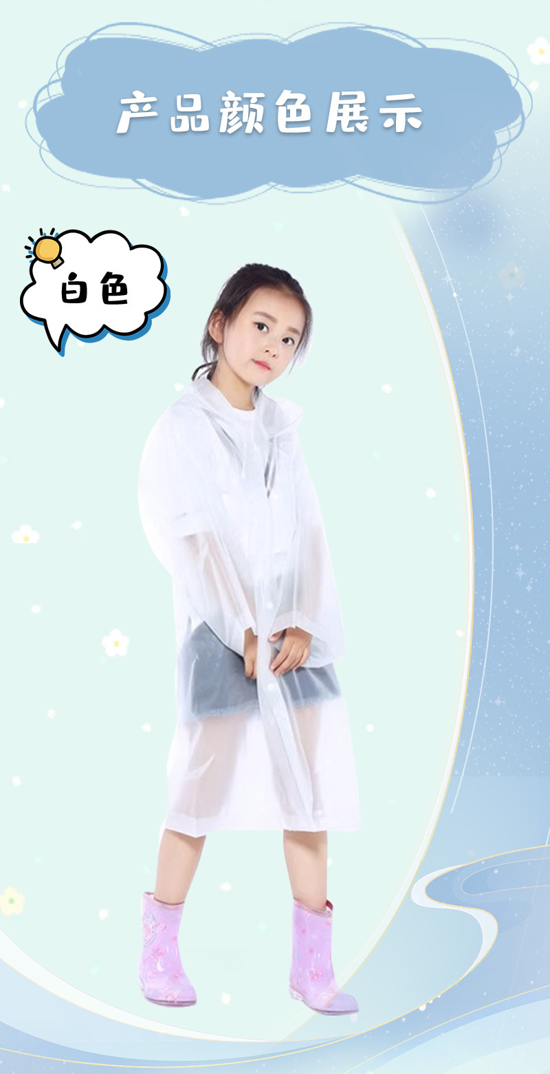 款式: 儿童雨衣 货号: eva儿童雨衣 是否进口: 否 品牌: 其他 雨具用途: 徒步雨披 是否一次性: 否 雨衣厚薄: 常规 布料厚度: 100g 雨衣布料: EVA 防水胶层: PVC胶 重量: 1.0 kg/个