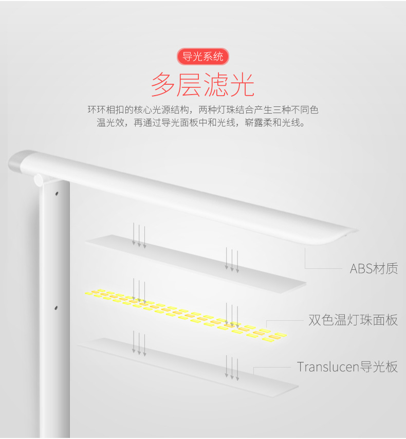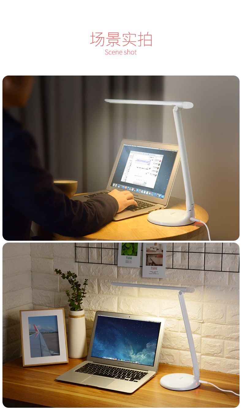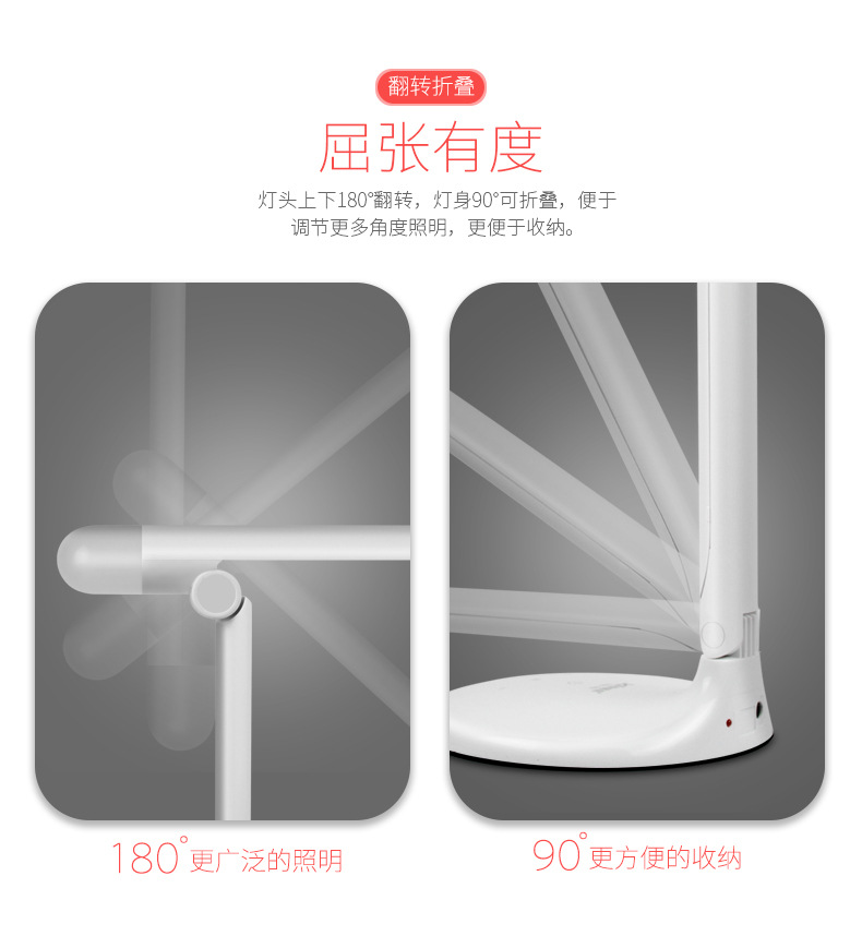 触控开关暖白光、小夜灯模式,每档均可调节光强弱,180°可调节灯臂