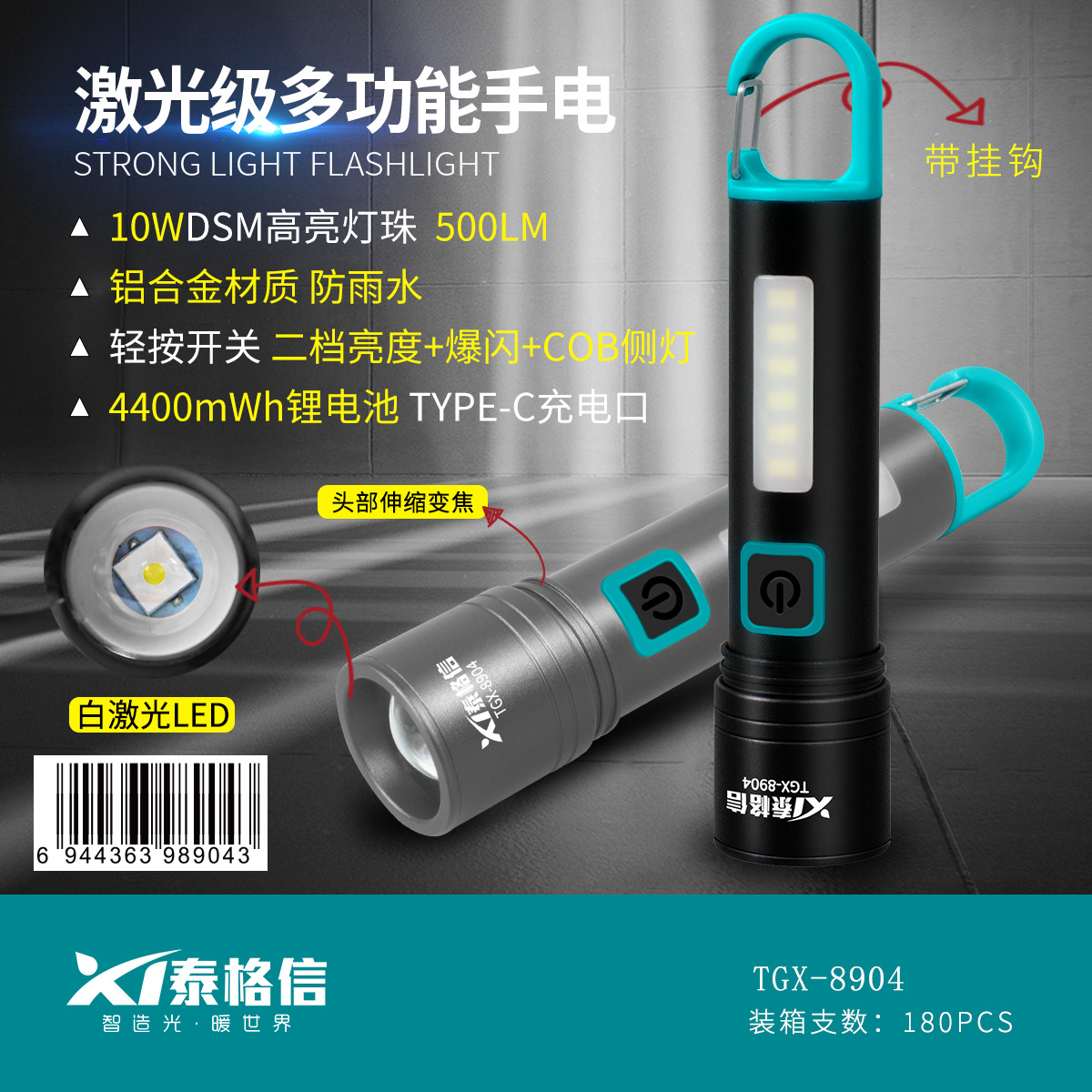 Type-C充电,可伸缩变焦超亮,爆闪,白激光,跨境爆款