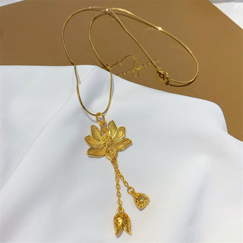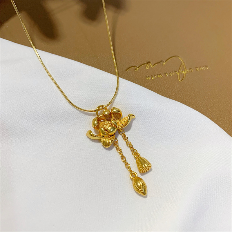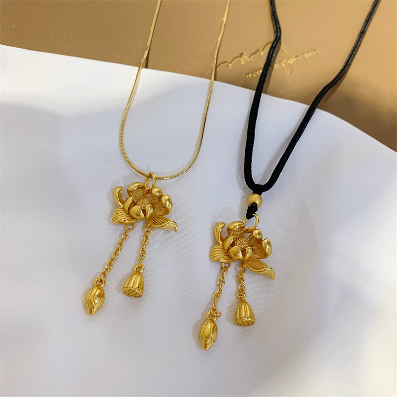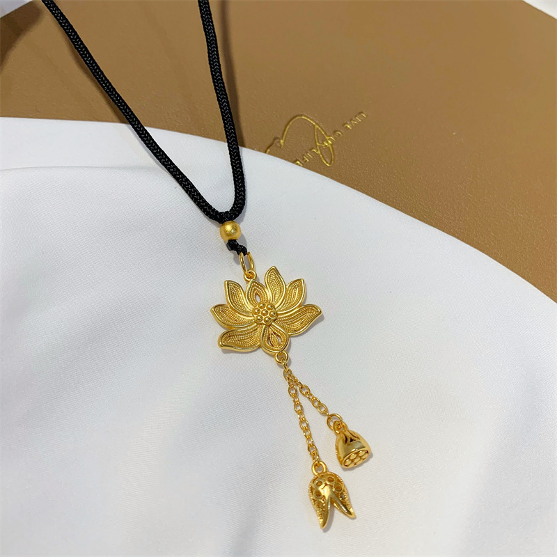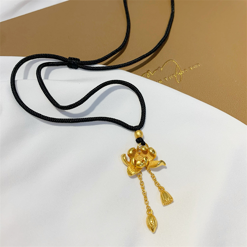 荷花两世欢吊坠仿古法黄金沙金首饰锁骨链久不掉色黑绳毛衣项链女 English | 投诉