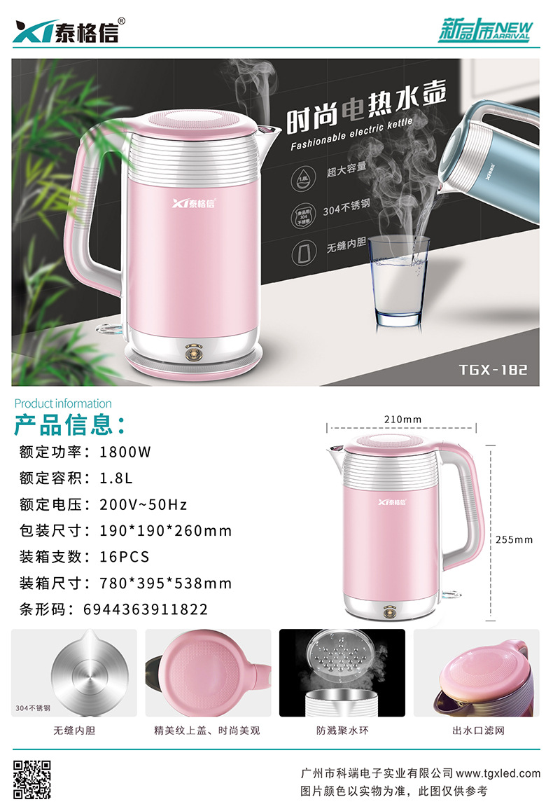品牌: 泰格信 上市时间: 2024 产地: 广东 货源类别: 现货 产品类别: 电热水壶 操作方式: 按键式 加热方式: 底盘加热 电热水壶容积: 1.8L 壶体层数: 双层 保温功能: 无